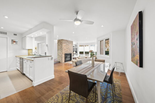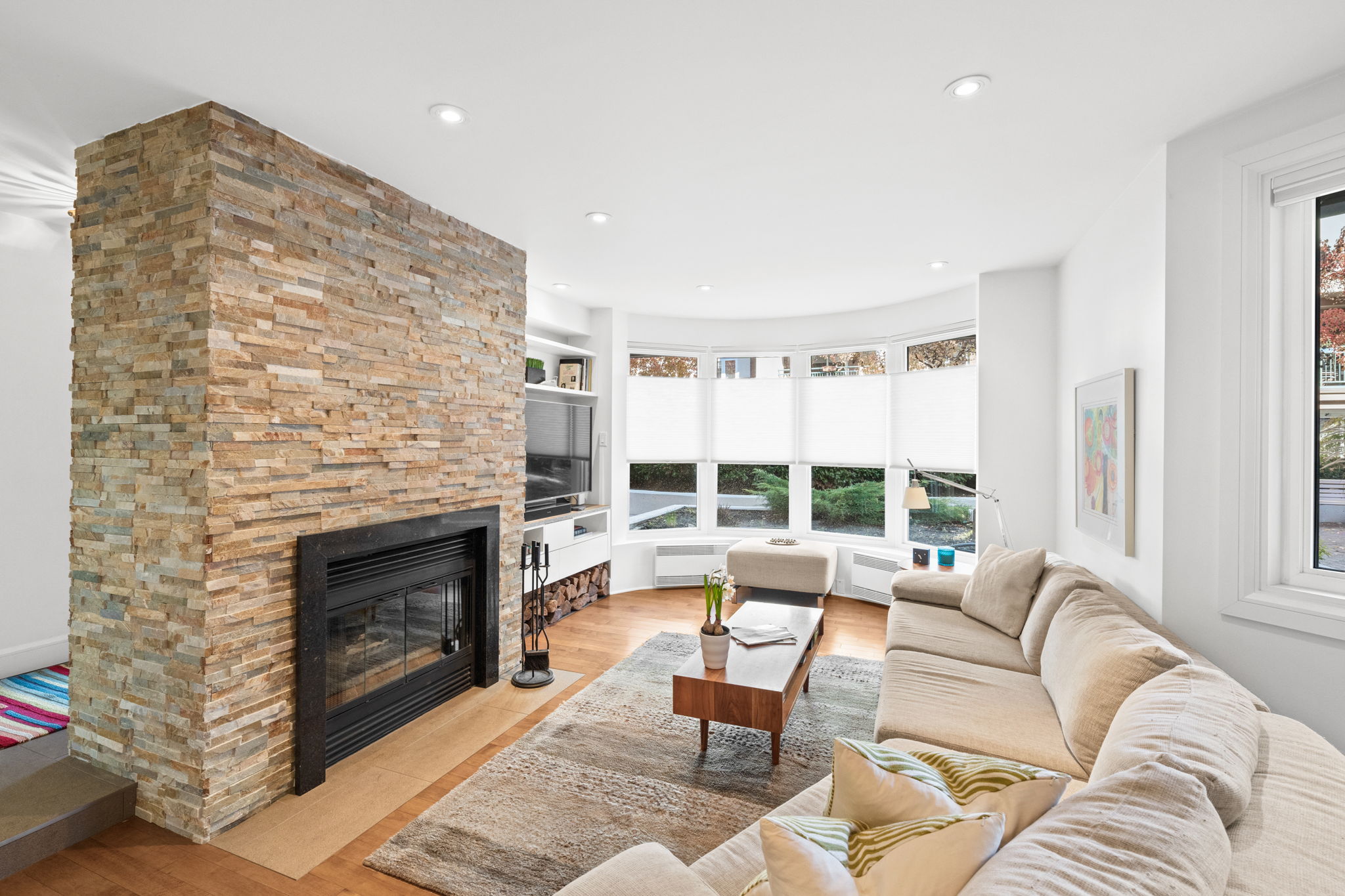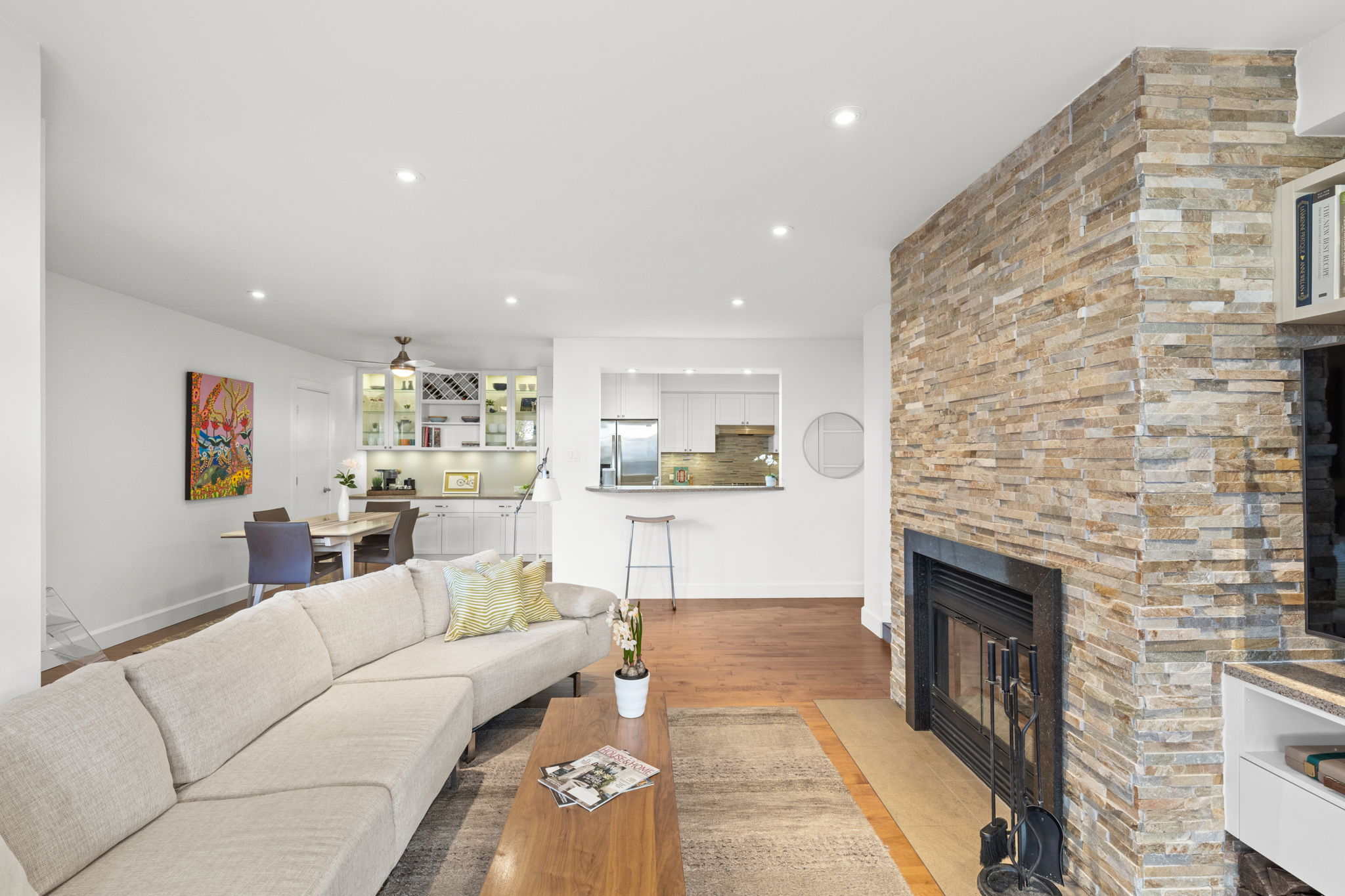 Step inside to discover an inviting open-concept layout featuring rich hardwood floors, pot lighting, and a striking stacked-stone wood-burning fireplace that creates the perfect atmosphere for relaxing or entertaining. Large windows fill the space with natural light and provide tranquil views overlooking the beautifully maintained interior courtyard.