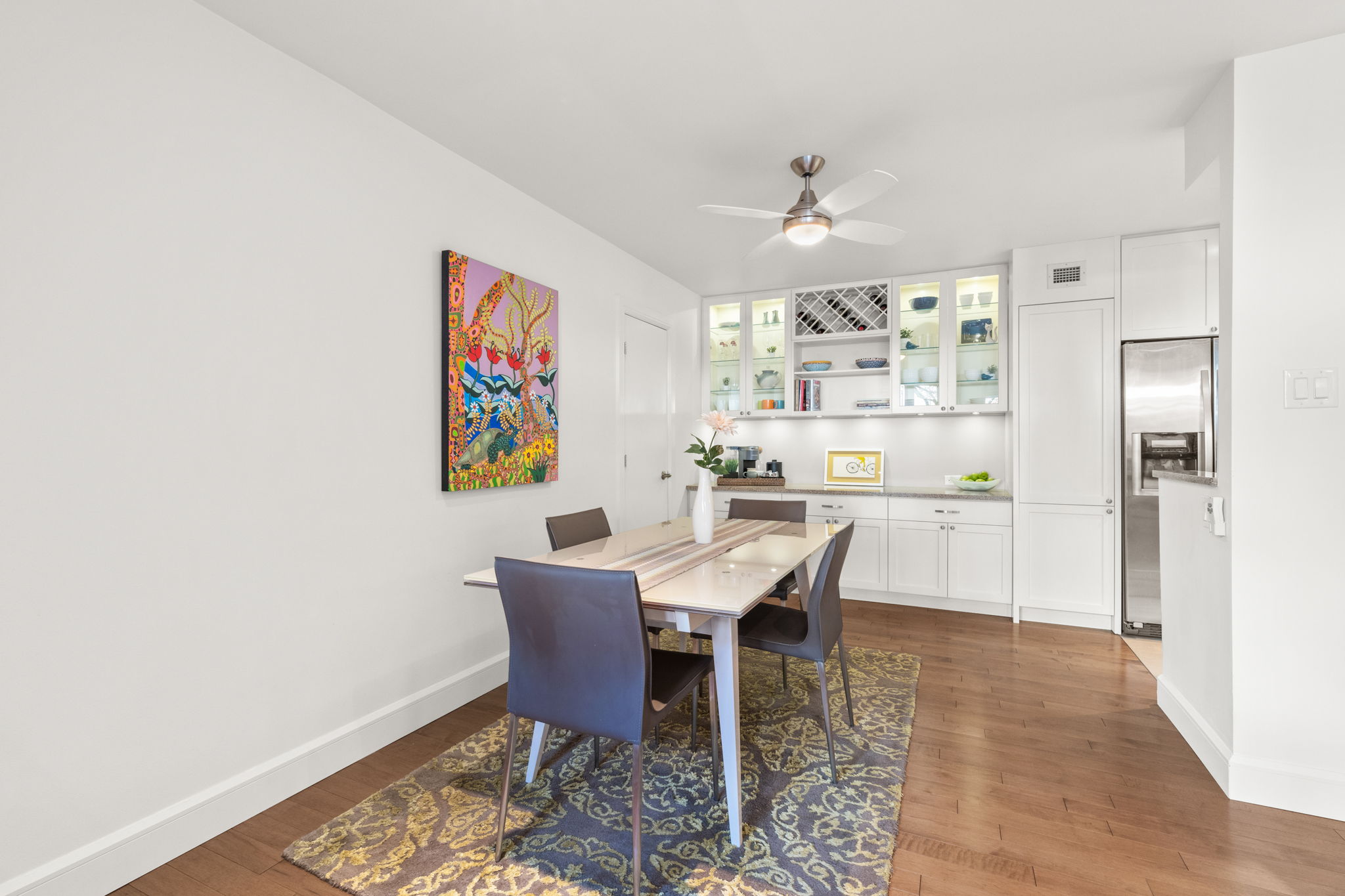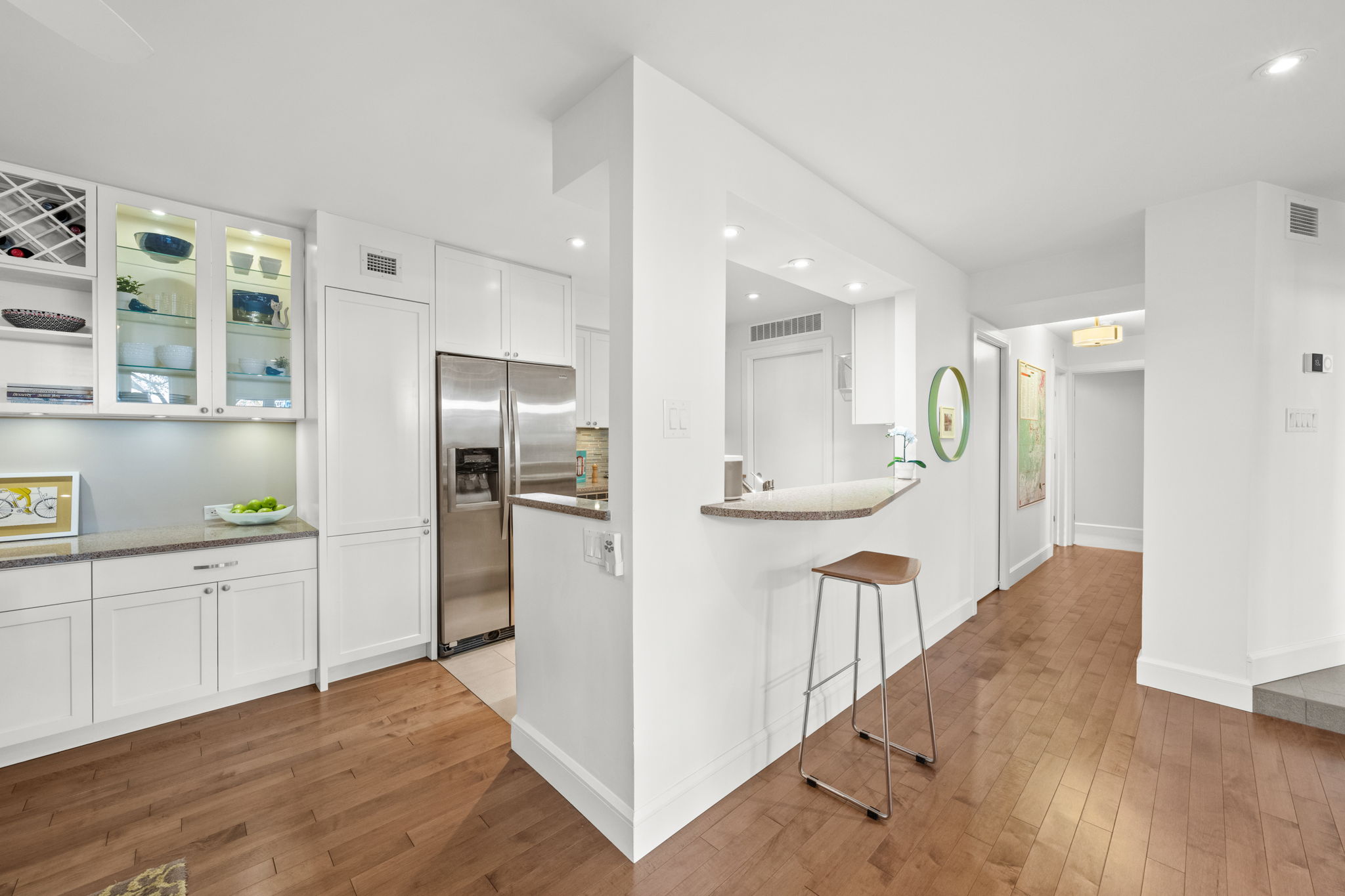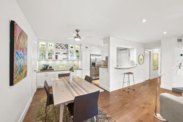 Additional highlights include elegant glass-front display cabinetry, a built-in wine rack, modern lever-style hardware, and secure bike storage – perfect for enjoying the nearby riverfront pathways.