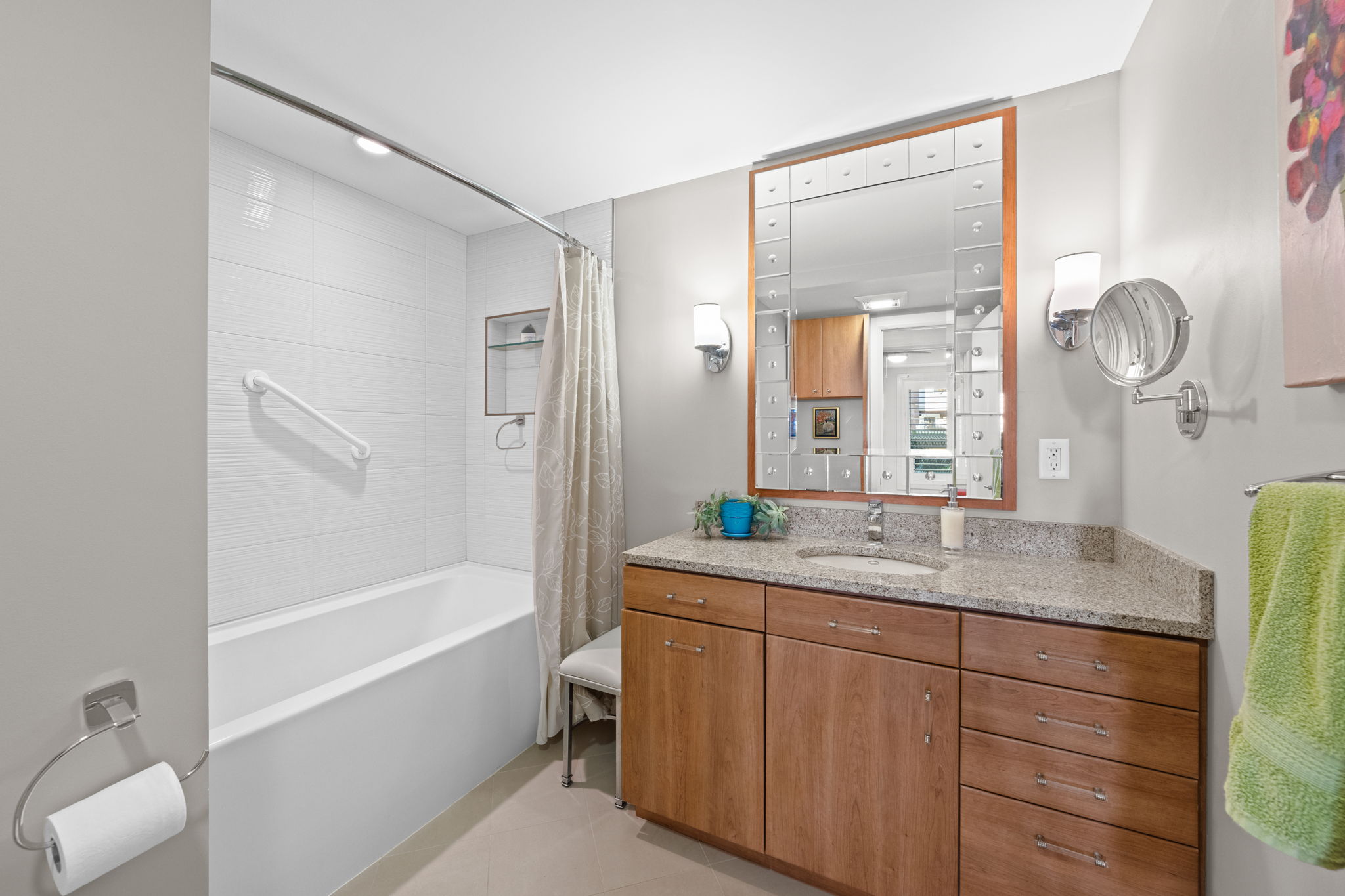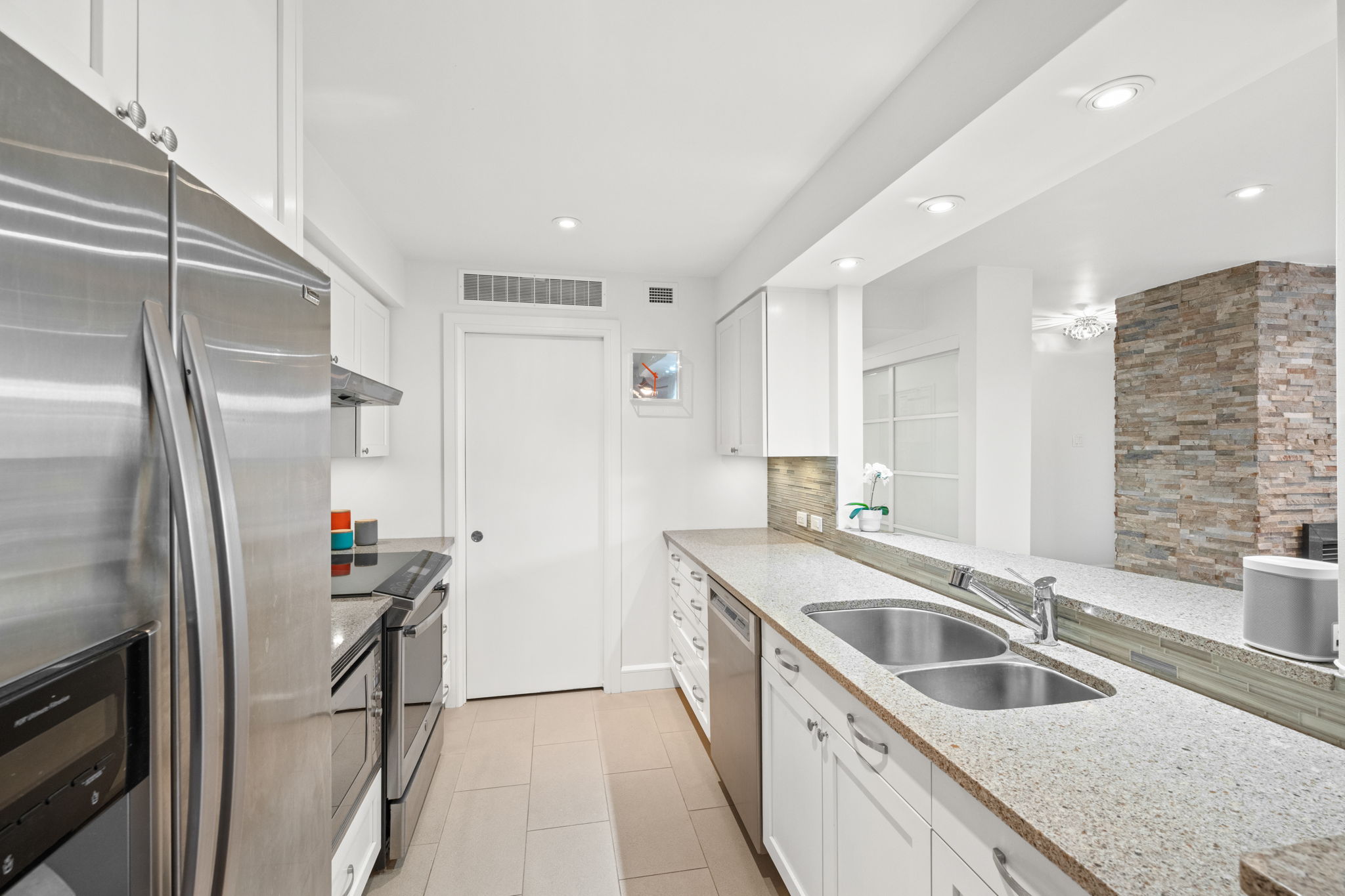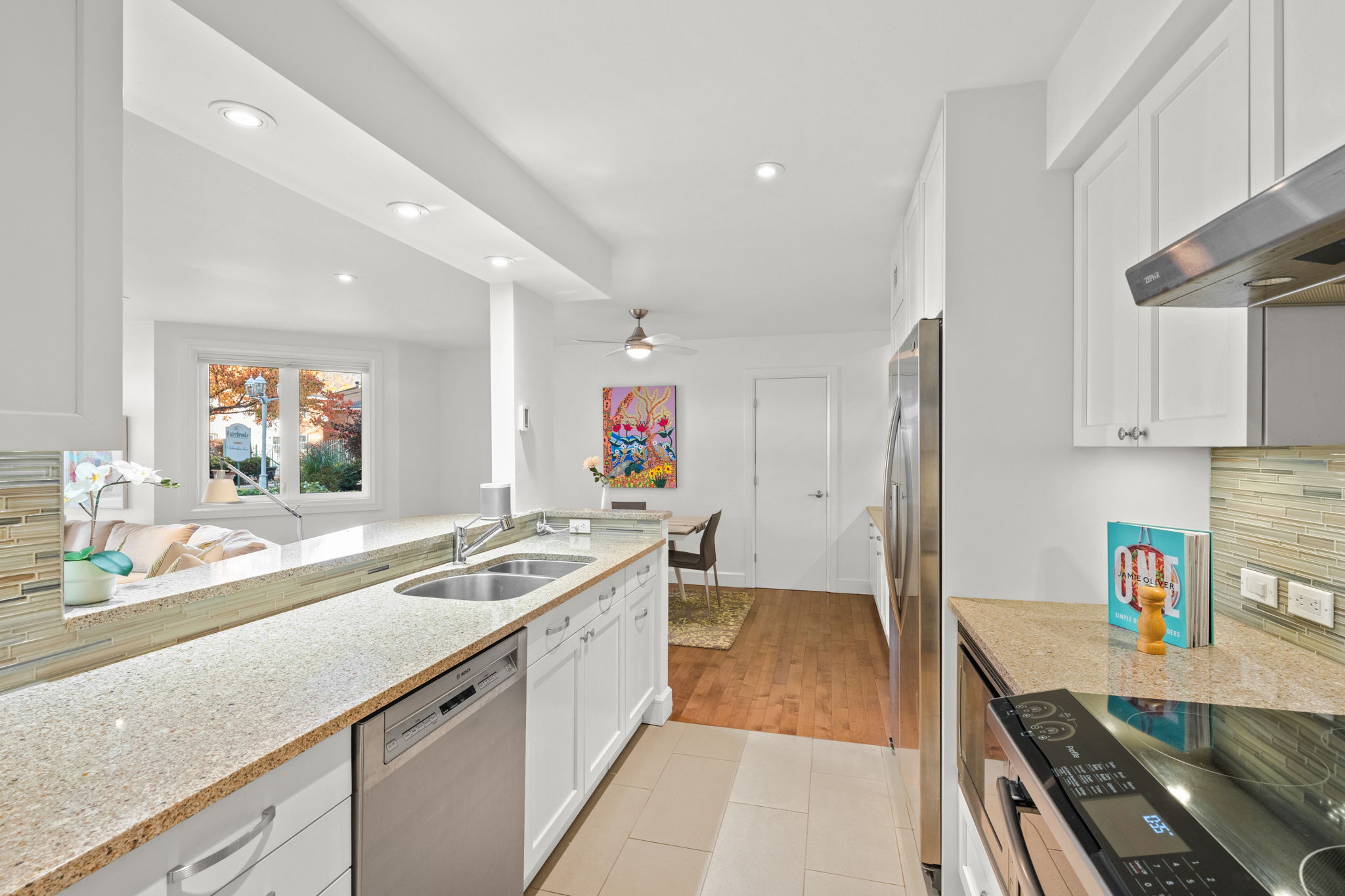 The stylish, upgraded kitchen is a standout, complete with quartz countertops, stainless steel appliances, soft-close cabinetry, pull-out pantry storage, and under-cabinet lighting, plus heated flooring, a dream for home chefs and condo living alike.