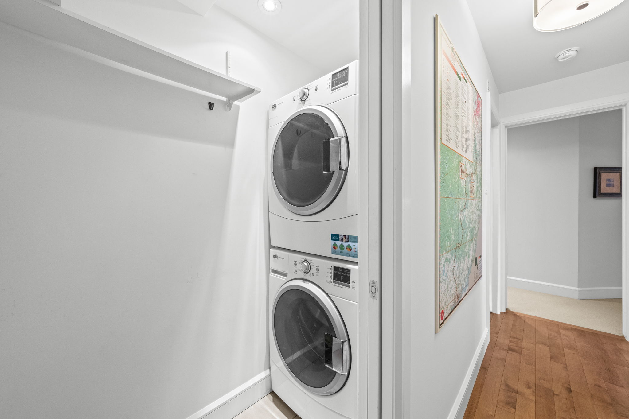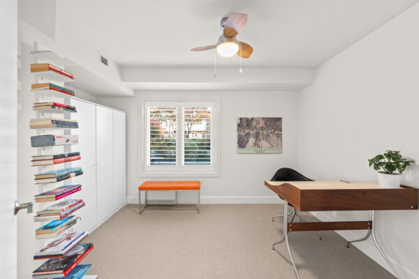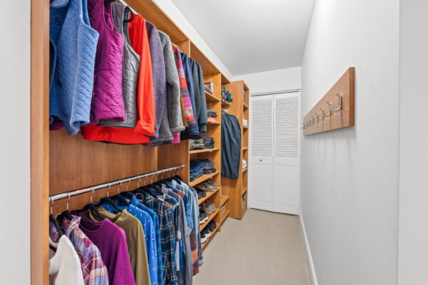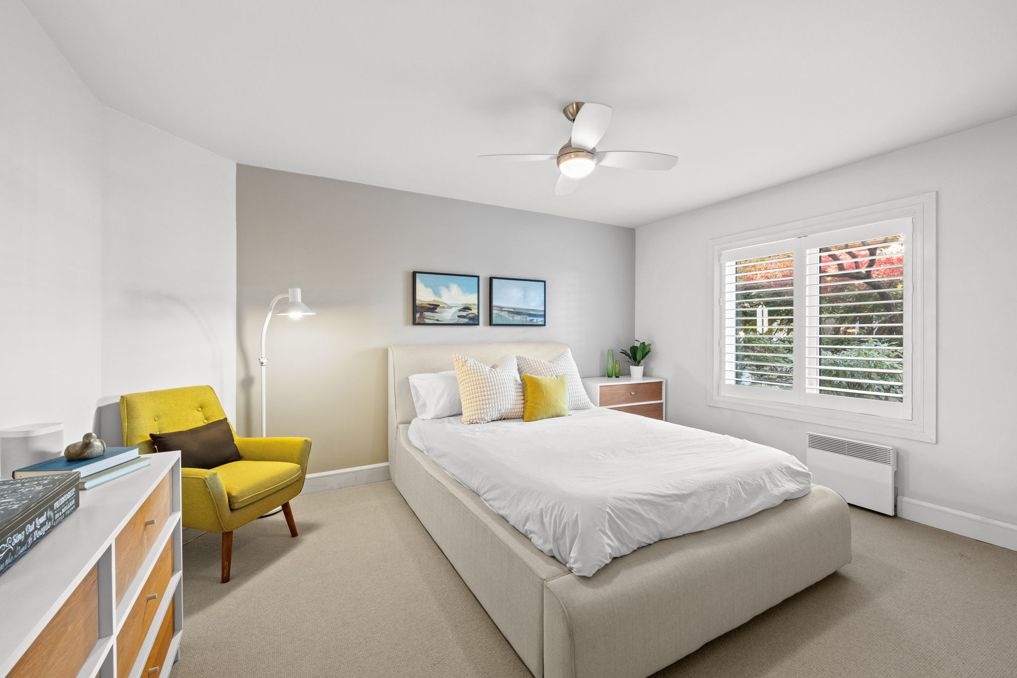 Both bedrooms are designed for comfort and privacy, featuring plantation shutters, plush wool carpeting, and generous closet space. The spacious primary bedroom includes a walk-in closet with a built-in organizer and additional utility/storage space. The renovated 3-piece bathroom adds a touch of luxury with heated tile flooring, while the discreet laundry room with pocket doors maximizes functionality and could offer potential for future conversion to a powder room.