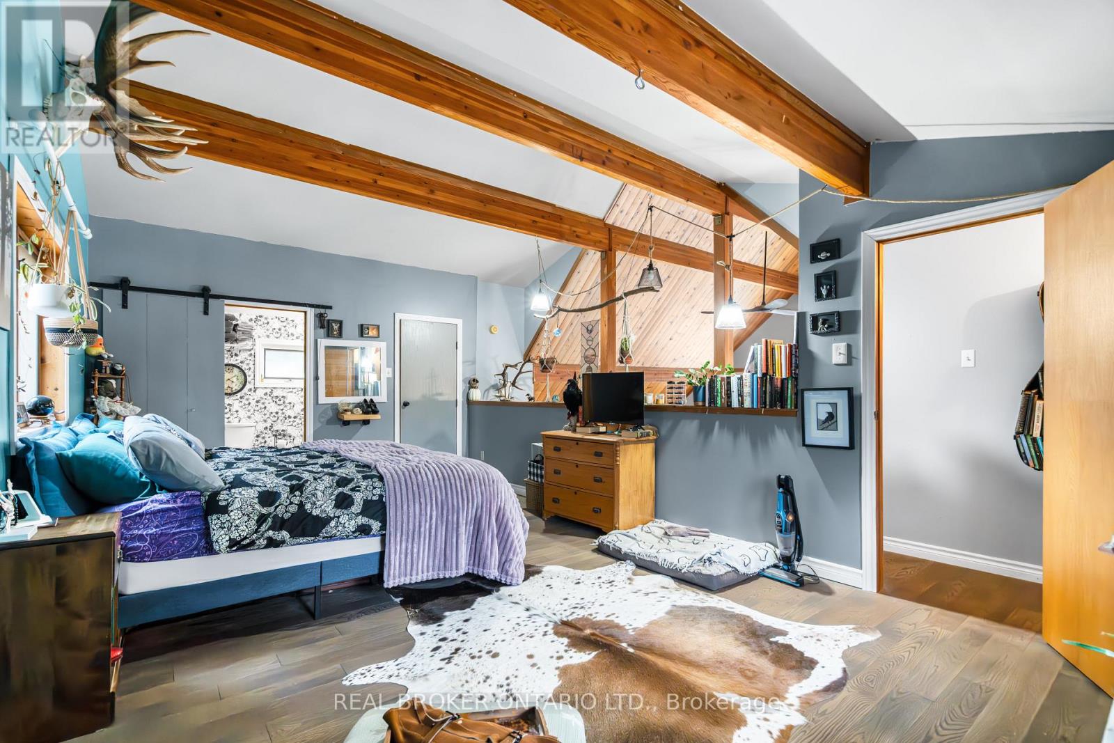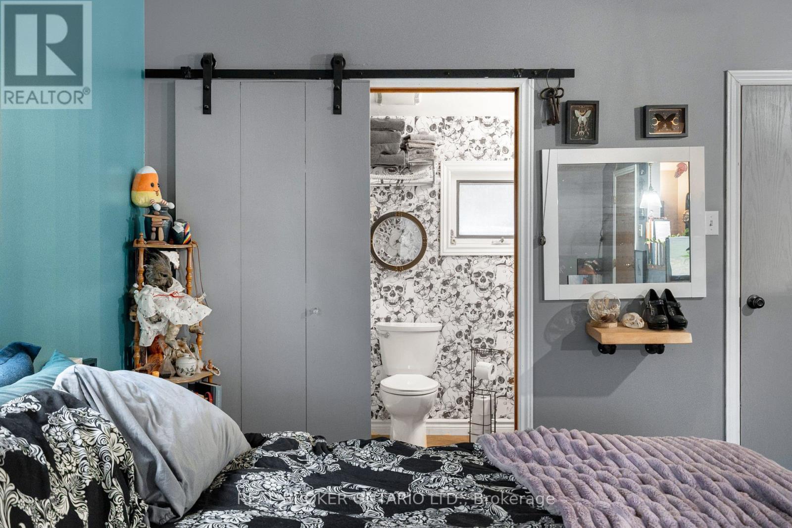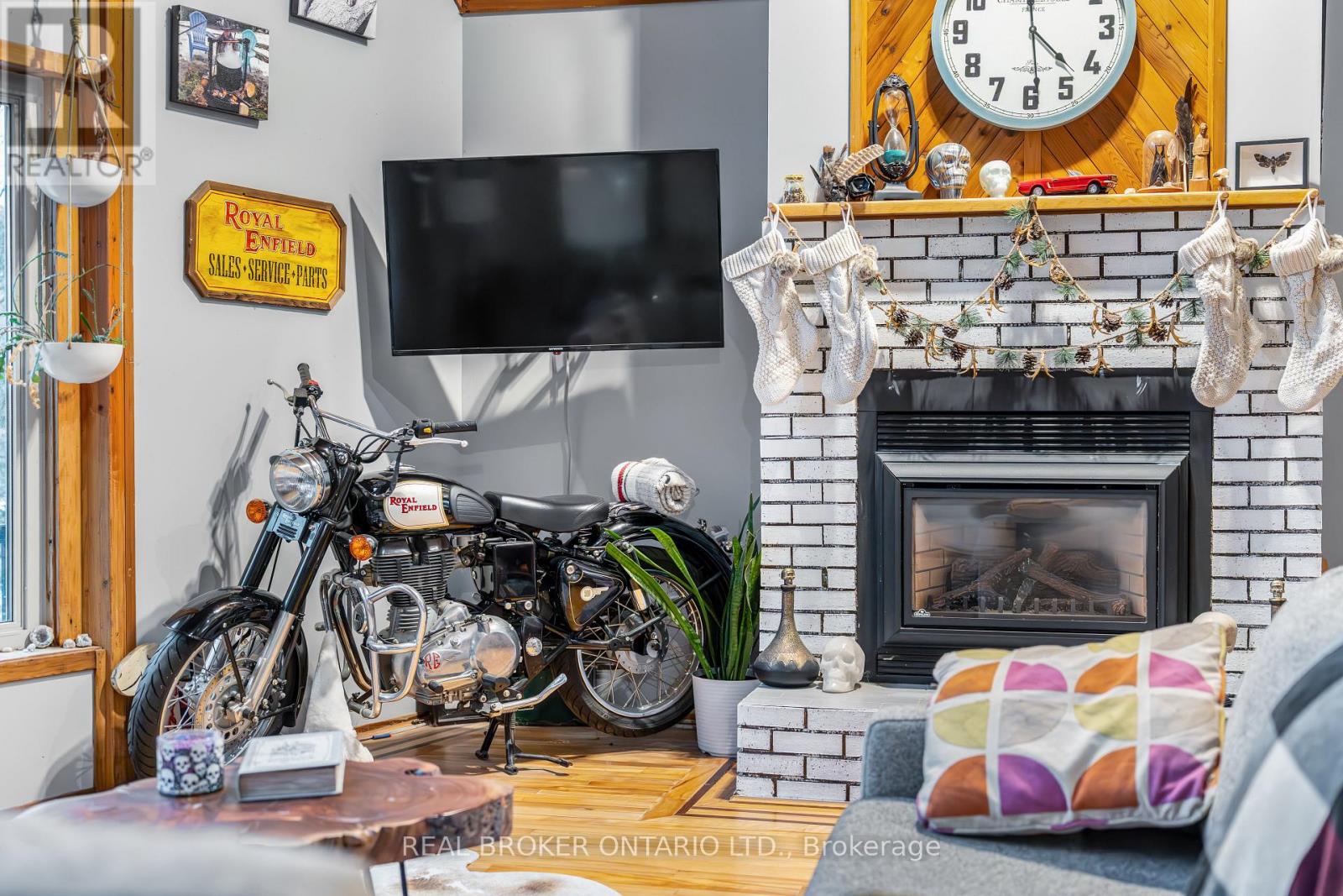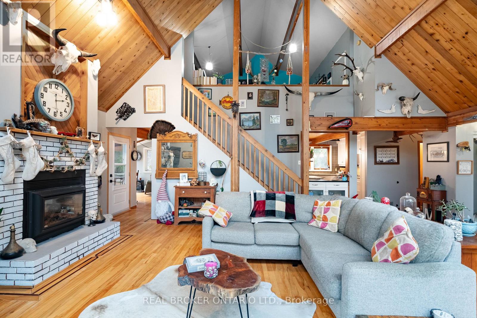 Welcome to 1 Woodland Drive, a charming 3 bed, 2 bath home tucked into a private, wooded corner lot in Braeside. Surrounded by nature and mature trees, this inviting property offers exceptional privacy and a peaceful setting. A wrap around deck and outdoor fire pit make it ideal for unwinding or entertaining. Inside, soaring main floor ceilings and expansive windows including new two storey windows that flood the space with light create a bright, airy atmosphere. The kitchen features white cabinetry, a tiled backsplash, and an eat in island. Hardwood floors enhance the warm living and dining spaces, complete with wainscoting and playful wallpaper. A standout sunroom with floor to ceiling windows provides a serene spot to enjoy the views year round. The main level includes a full bathroom, laundry and two large bedrooms, while the loft style primary suite offers wonderful character and its own ensuite and walk-in closet. The finished basement adds even more living space with wood paneling, a large rec room, a spacious playroom, and a powder room. Additional highlights include a low maintenance metal roof and recent updates to the HVAC and septic systems, offering peace of mind for future owners. Just a short walk to Braeside Beach and the boat launch and only minutes to Arnprior and 30 minutes to Kanata, this home blends cottage charm with everyday convenience. (id:49712)