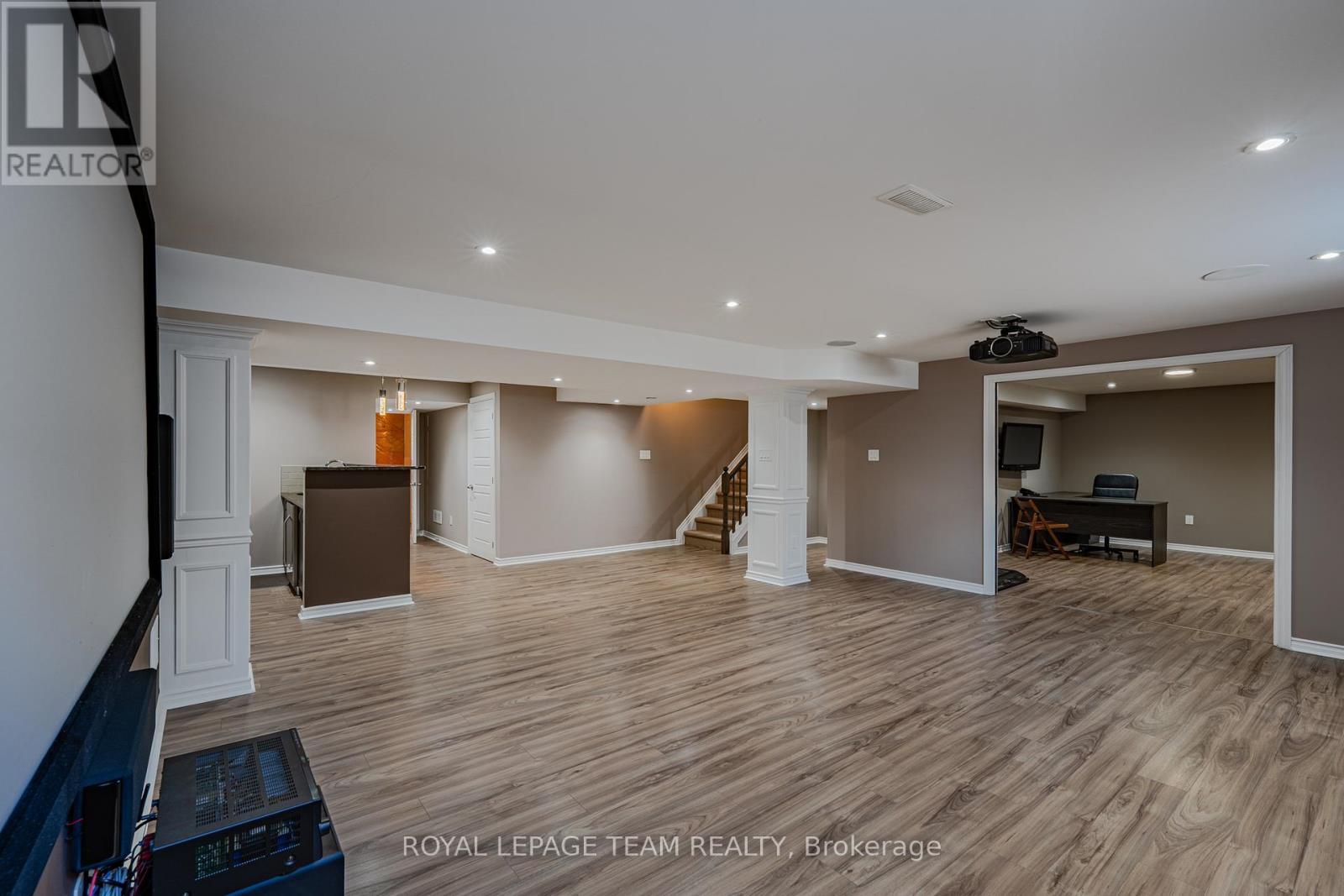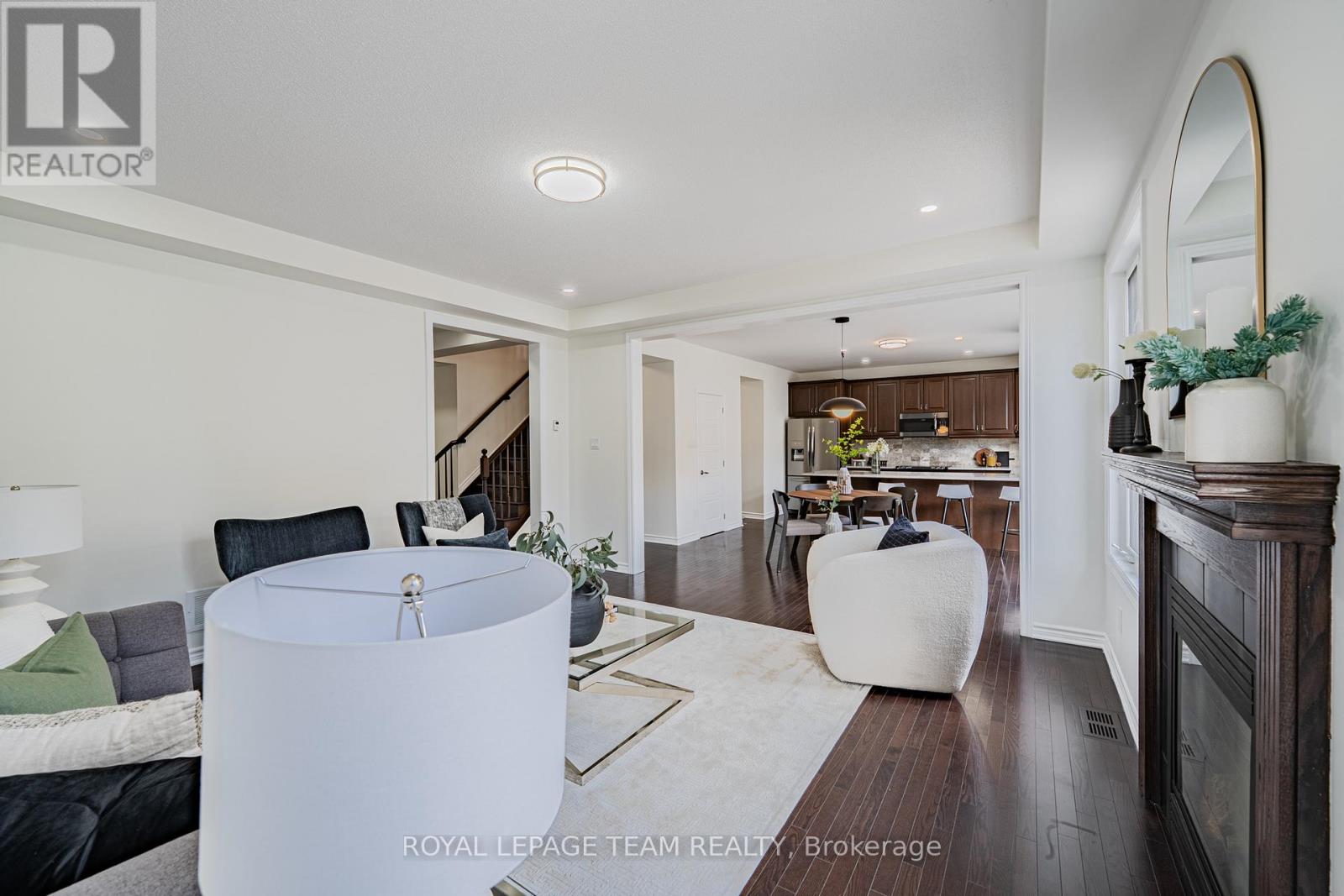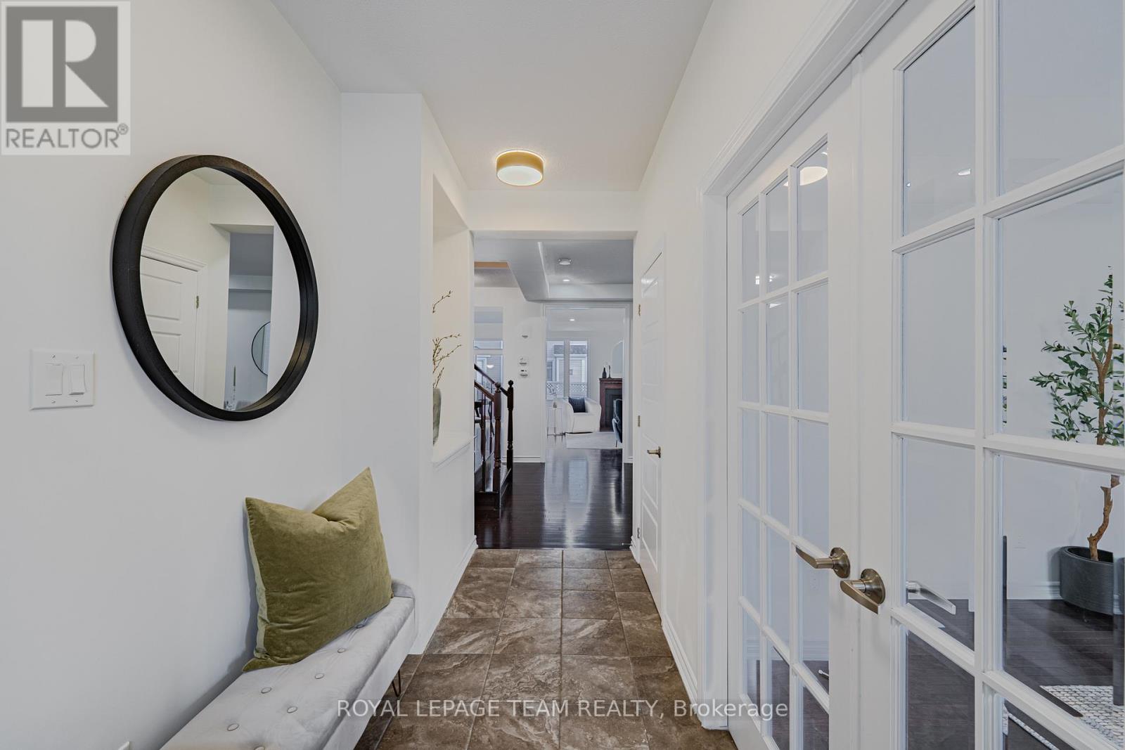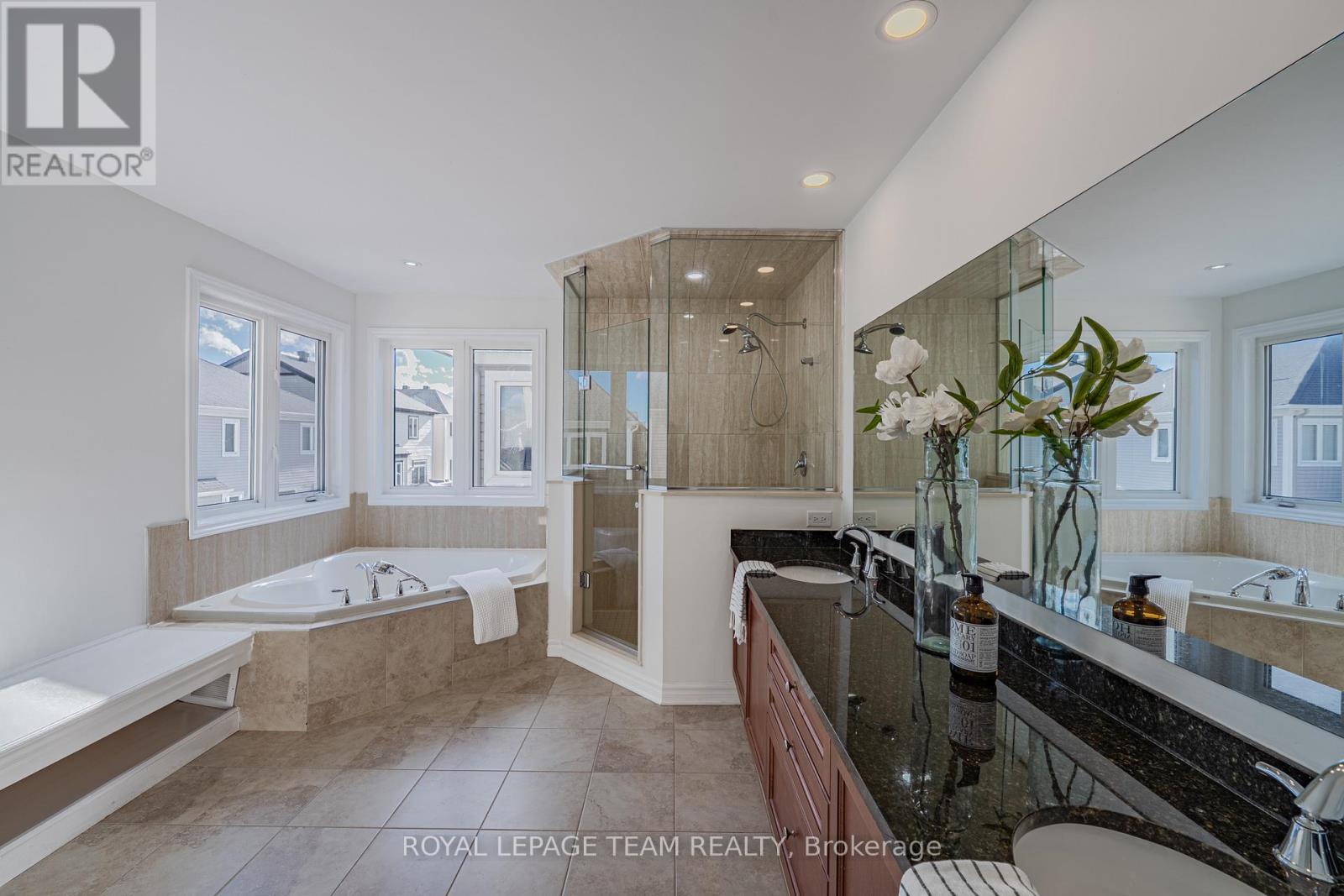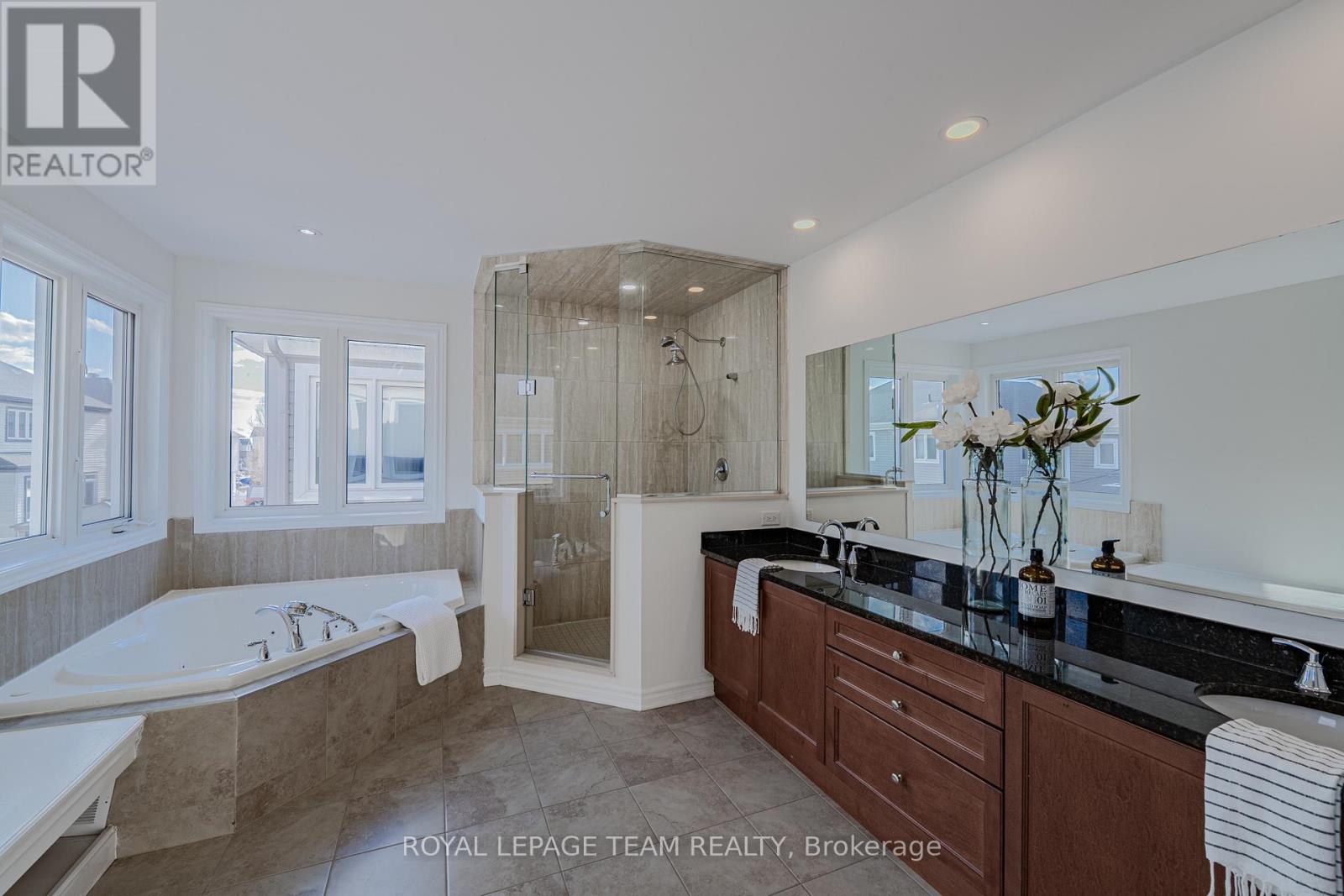 Luxury Living in Kanata South!Discover this stunning single-family home that truly has it all - 3 full bathrooms on the second floor, a fully finished basement with an extra bedroom and bath, complete professional landscaping, and exquisite finishes throughout. Perfectly located in a prime Kanata South neighbourhood close to parks, schools, shopping, and dining.Step inside to a grand, light-filled foyer leading to a beautiful front-facing office with elegant French doors and a custom backlit niche - ideal for working from home. The open-concept main level offers an impressive 36 feet of continuous rear width, with expansive south-facing windows and a large patio slider that fill the home with natural light.The chef-inspired kitchen features an oversized peninsula island, extended-height cabinetry, stainless steel appliances, ample storage, and a walk-in pantry. Hardwood floors, flush vents, hardwood stairs, and a statement fireplace with granite surround add warmth and sophistication. A spacious powder room, walk-in closet, and double-car garage complete the main floor.Upstairs, the luxurious primary suite boasts dual walk-in closets and a spa-like ensuite with a corner shower, jacuzzi tub framed by corner windows, dual sinks, and a private water closet. Three additional bedrooms are served by a second ensuite and a Jack-and-Jill bath. A full laundry room, walk-in linen closet, and hardwood throughout complete this level.The finished basement offers a home theatre area, fifth bedroom or second office, wet bar with fridge and sink, and another full bathroom - perfect for guests or entertaining.Fully landscaped and steps from the Monahan Drain greenspace, this exceptional home combines luxury, comfort, and convenience in the heart of Kanata South. (id:49712)