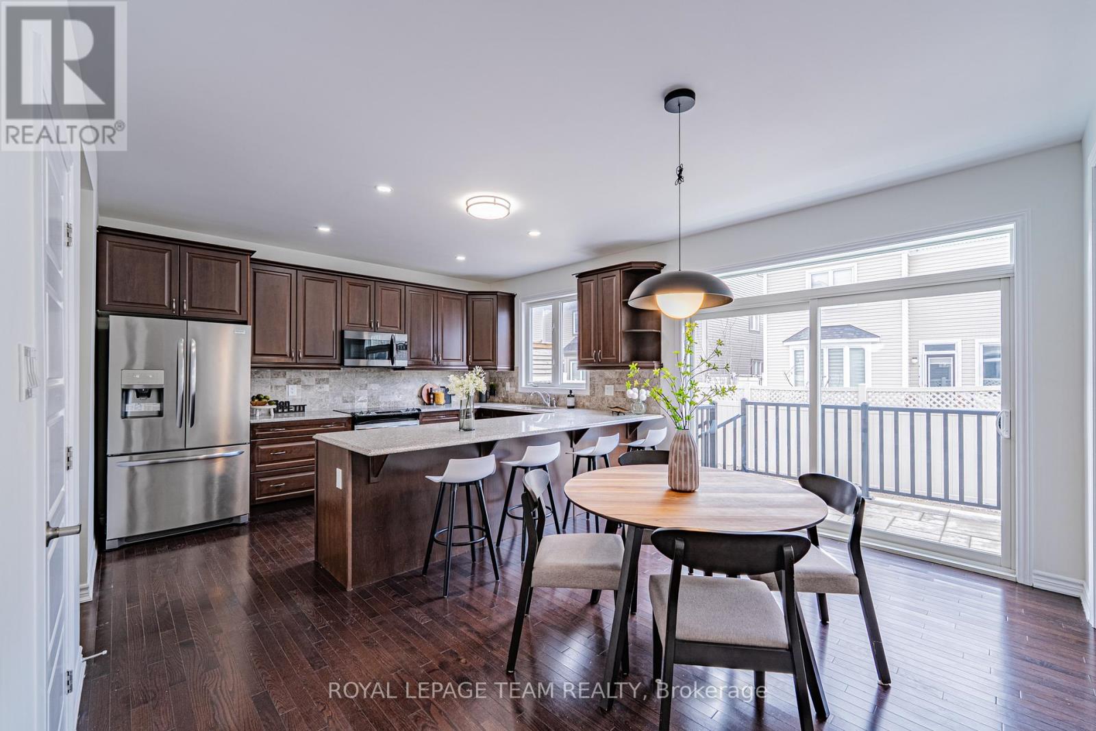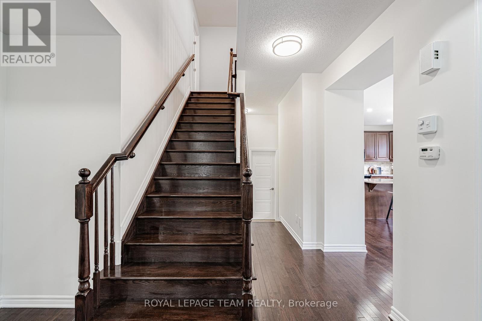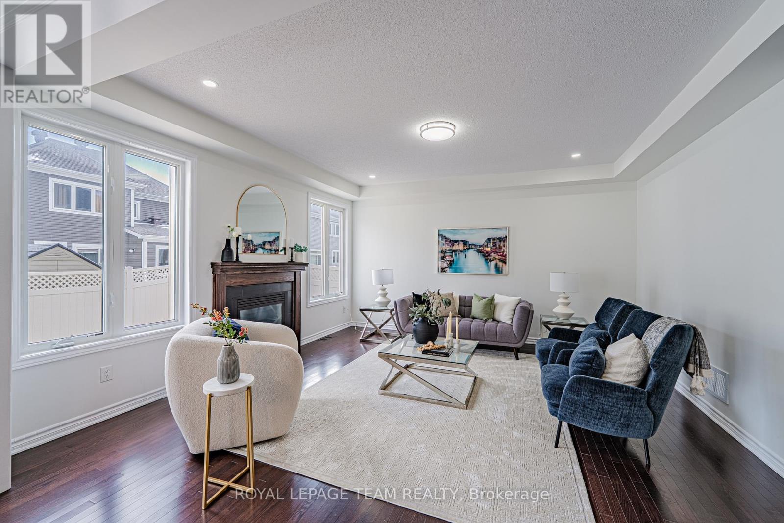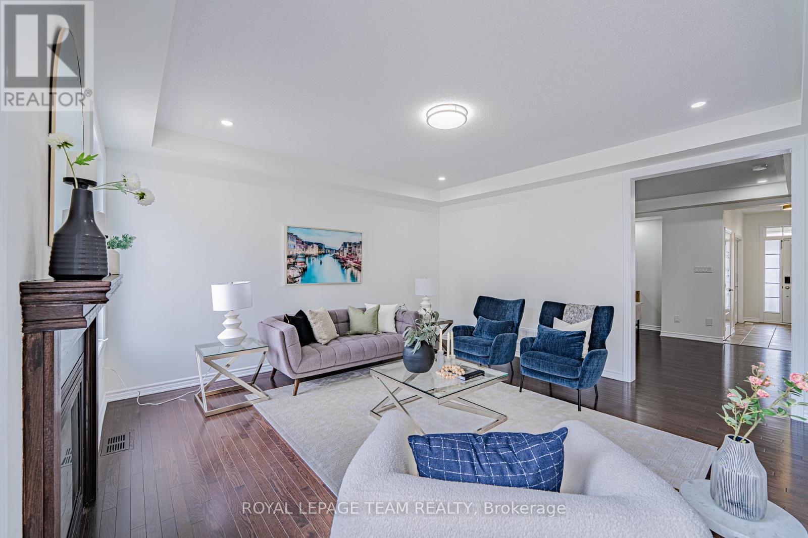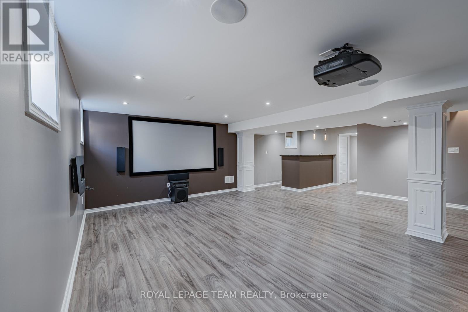 Luxury Living in Kanata South!Discover this stunning single-family home that truly has it all - 3 full bathrooms on the second floor, a fully finished basement with an extra bedroom and bath, complete professional landscaping, and exquisite finishes throughout. Perfectly located in a prime Kanata South neighbourhood close to parks, schools, shopping, and dining.Step inside to a grand, light-filled foyer leading to a beautiful front-facing office with elegant French doors and a custom backlit niche - ideal for working from home. The open-concept main level offers an impressive 36 feet of continuous rear width, with expansive south-facing windows and a large patio slider that fill the home with natural light.The chef-inspired kitchen features an oversized peninsula island, extended-height cabinetry, stainless steel appliances, ample storage, and a walk-in pantry. Hardwood floors, flush vents, hardwood stairs, and a statement fireplace with granite surround add warmth and sophistication. A spacious powder room, walk-in closet, and double-car garage complete the main floor.Upstairs, the luxurious primary suite boasts dual walk-in closets and a spa-like ensuite with a corner shower, jacuzzi tub framed by corner windows, dual sinks, and a private water closet. Three additional bedrooms are served by a second ensuite and a Jack-and-Jill bath. A full laundry room, walk-in linen closet, and hardwood throughout complete this level.The finished basement offers a home theatre area, fifth bedroom or second office, wet bar with fridge and sink, and another full bathroom - perfect for guests or entertaining.Fully landscaped and steps from the Monahan Drain greenspace, this exceptional home combines luxury, comfort, and convenience in the heart of Kanata South. (id:49712)