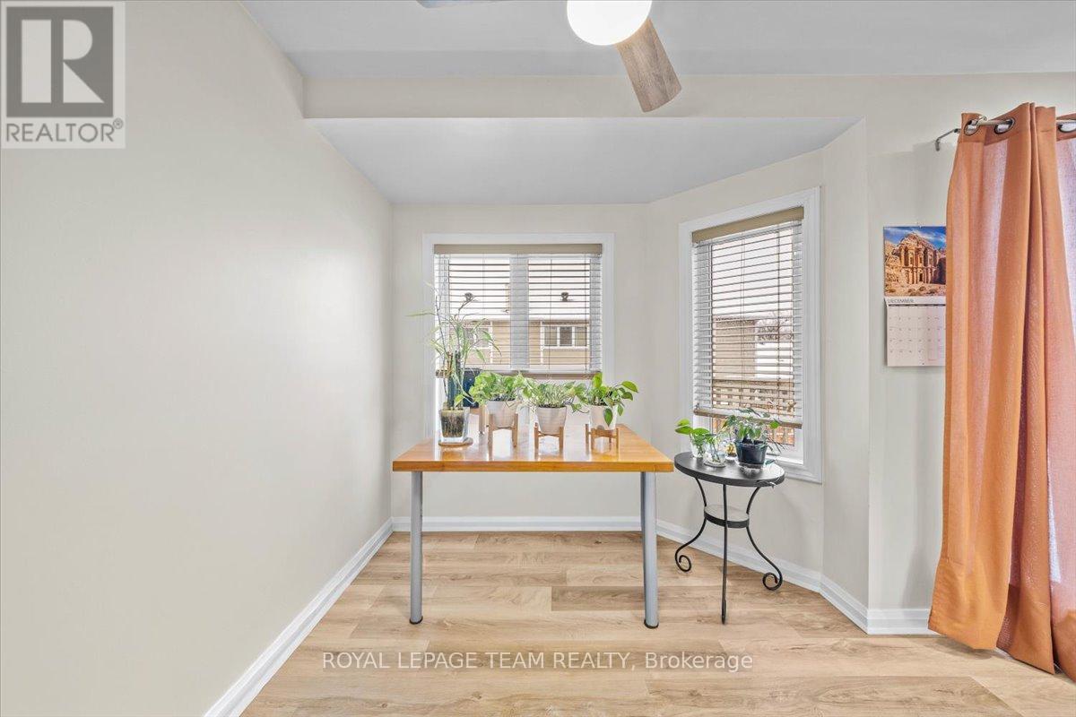 $719 MonthlyWelcome to a bright, updated, carpet-free 3-bedroom, 2-bathroom condo townhome located in a desirable neighbourhood featuring two covered parking spaces. The lower level features a convenient 3-piece bathroom, laundry room, and a versatile den/office/storage. The main level showcases a renovated kitchen with eating area, modern cabinetry, and pot lights, with direct access to a large balcony-perfect for relaxing or enjoying summer BBQs. A generously sized dining room with built-in shelves and cabinetry flows into a spacious living room highlighted by a wood-burning fireplace, all set on luxury vinyl flooring. This level also leads to a fenced, landscaped yard. Upstairs, you'll find a well-sized primary bedroom with built-in closet cabinetry, along with two additional bedrooms. All three bedrooms feature ceiling fans and laminate flooring. Ideally situated close to public transit, schools, parks, playgrounds, the O-Train, shopping, Costco, restaurants, and more, with easy access to Highway 417. (id:49712)