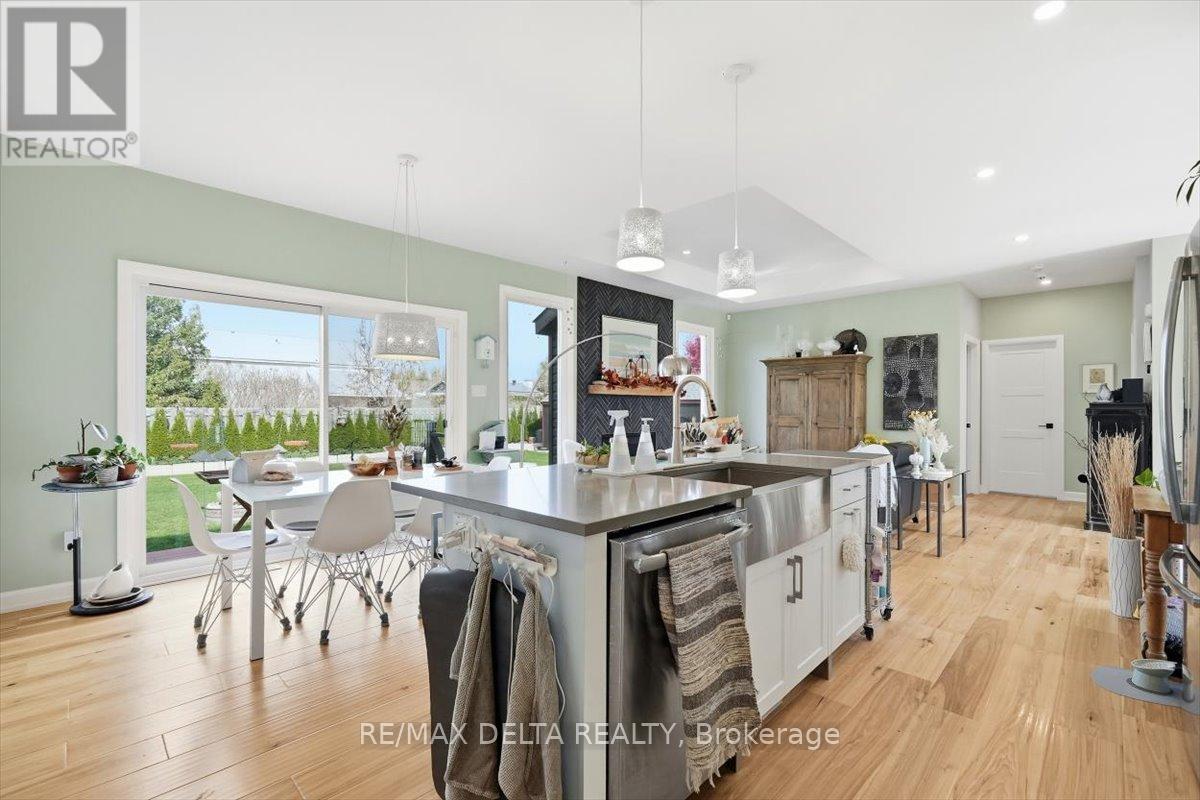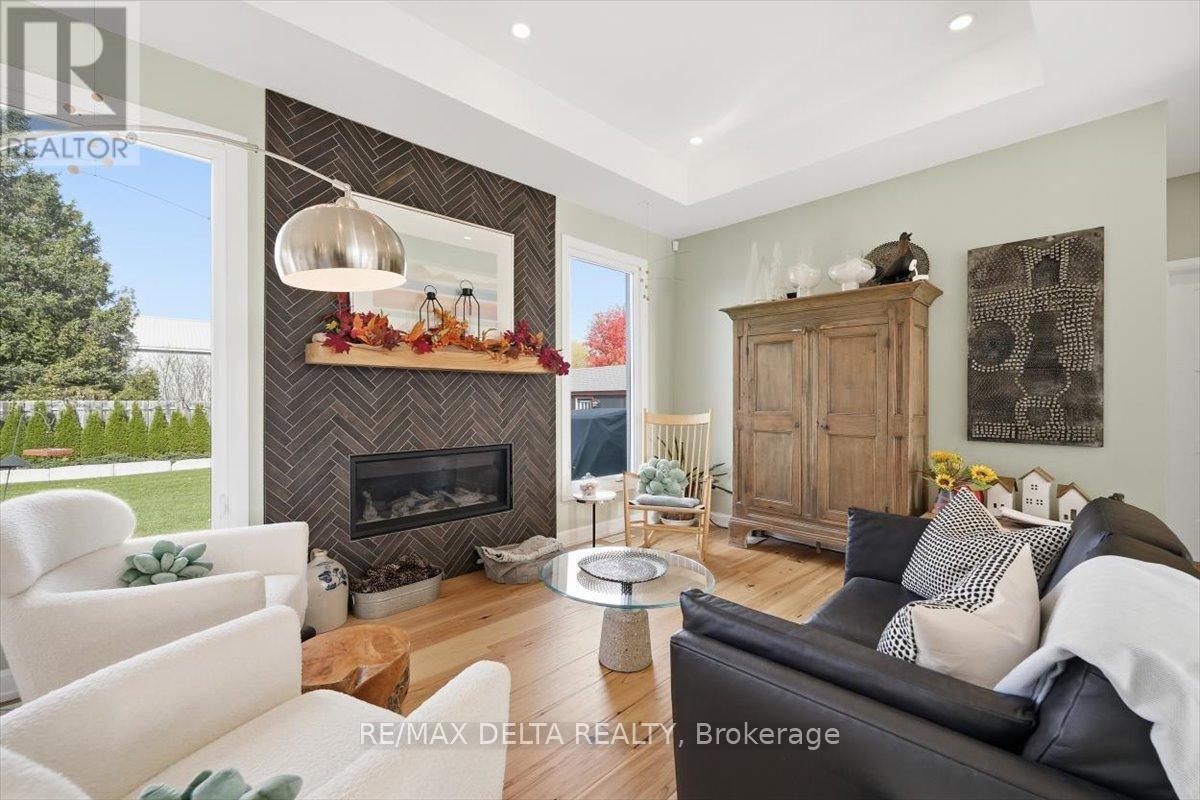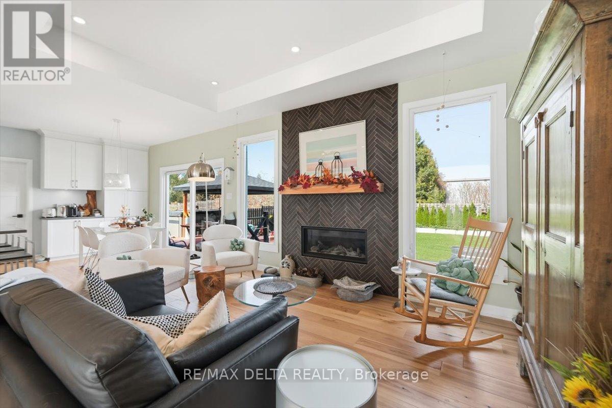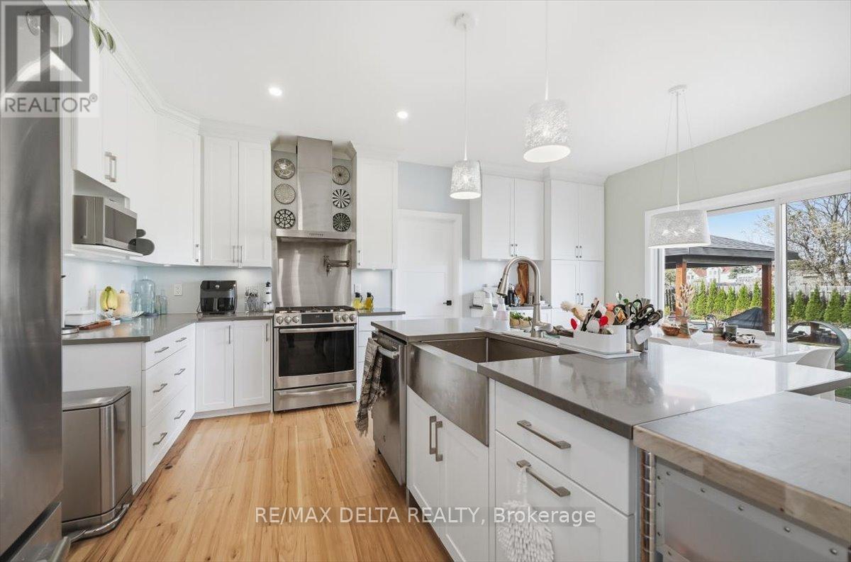 Welcome to 117 Danika. This beautiful bungalow has it all, style and quality workmanship. Beautifully designed and decorated with loads of upgrades. Separate list is attached. On the main floor, you will find an open concept kitchen with white cabinets with grey quartz countertops, stainless steel backsplash, practical water tap located over the gas range adds a rare feature to the cooking area, dining and living areas with plenty of natural light with an 8ft patio door, gleaming hardwood floors, a natural gas fireplace to cozy up and relax, beautiful neutral colors to suit all styles. 3 generous size bedrooms on the main floor + 1 large bedroom in the lower level. A spa style 4 pce ensuite, another 3 pce main bathroom on the main floor PLUS a 2 pce bathroom in the lower level. Fully finished lower level includes a very large rec room, a workshop/utility room. The beauty of this home is the exterior, fully landscaped with custom timber framed privacy screen for additional privacy on each side of the home with matching solid timber on the garage & facade.reddish lumber trim beams with quality stainless steel plates and carriage bowls, stylish custom built gazebo with pot lights, trees, stunning concrete front patio, PLUS a large detached garage 30 ft X 12 ft on concrete foundation with hydro perfect for the hobbyist in the family, added window wells,. Plug-in ready for future generator. With over $150,000 in upgrades (laneway paved, wood floor on main level, concrete front patio, concrete curbed mow strip, gazebo, added 4th garage, backyard underground draining piping with downspouts connected, concrete block retaining wall, and the list goes on. This makes this home one of a kind that you won't want to miss. Complete list of renos available upon request. No front neighbours (wooded area). (id:49712)