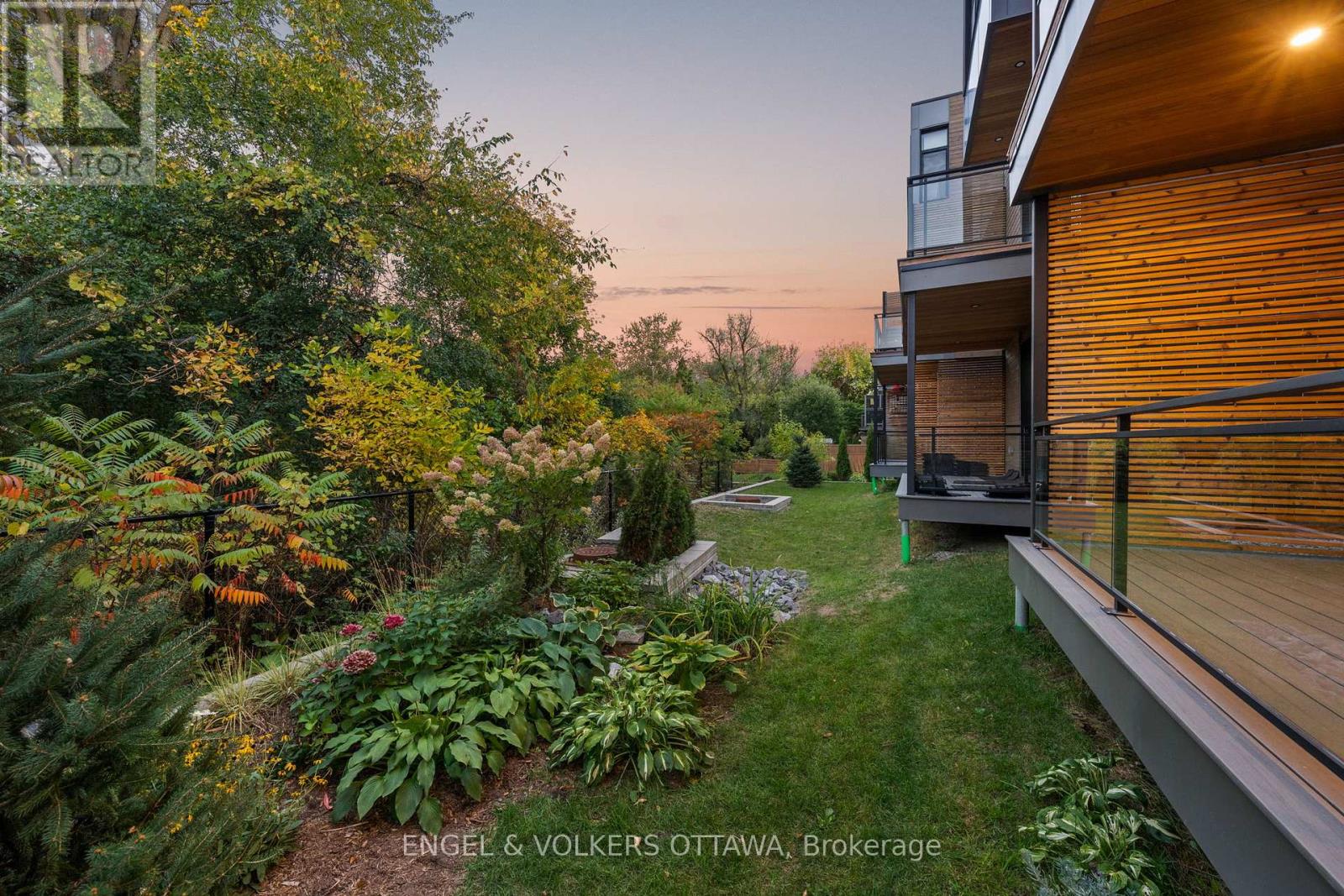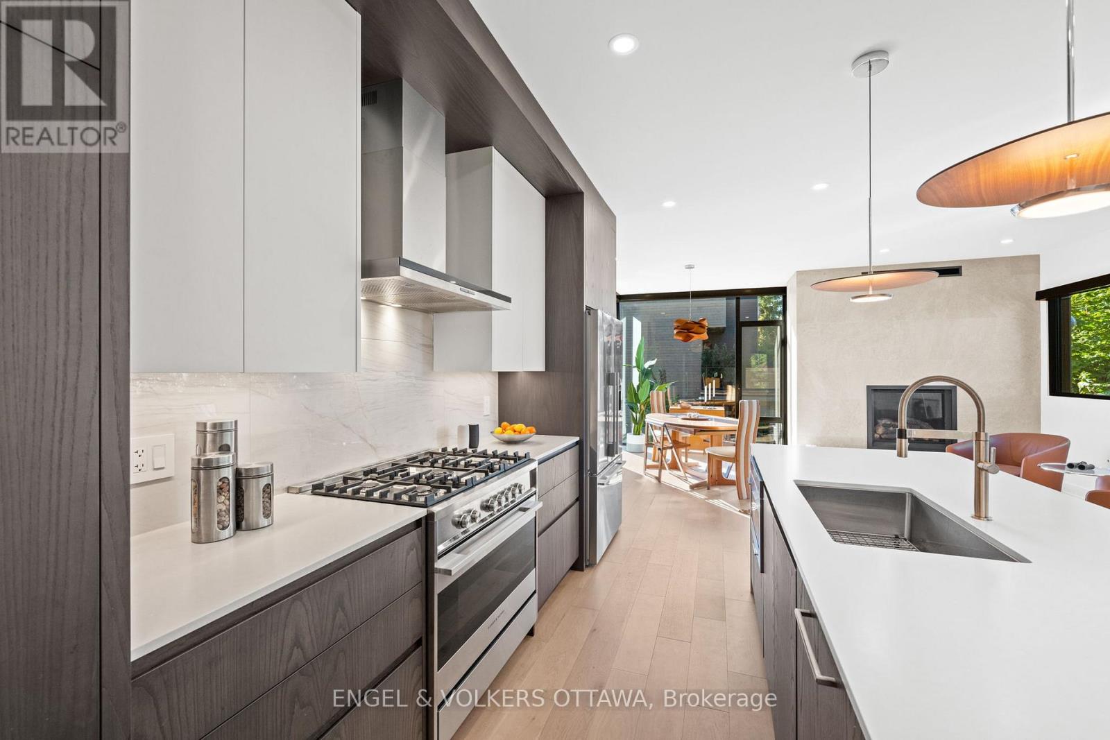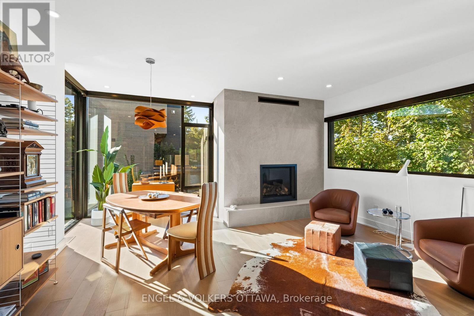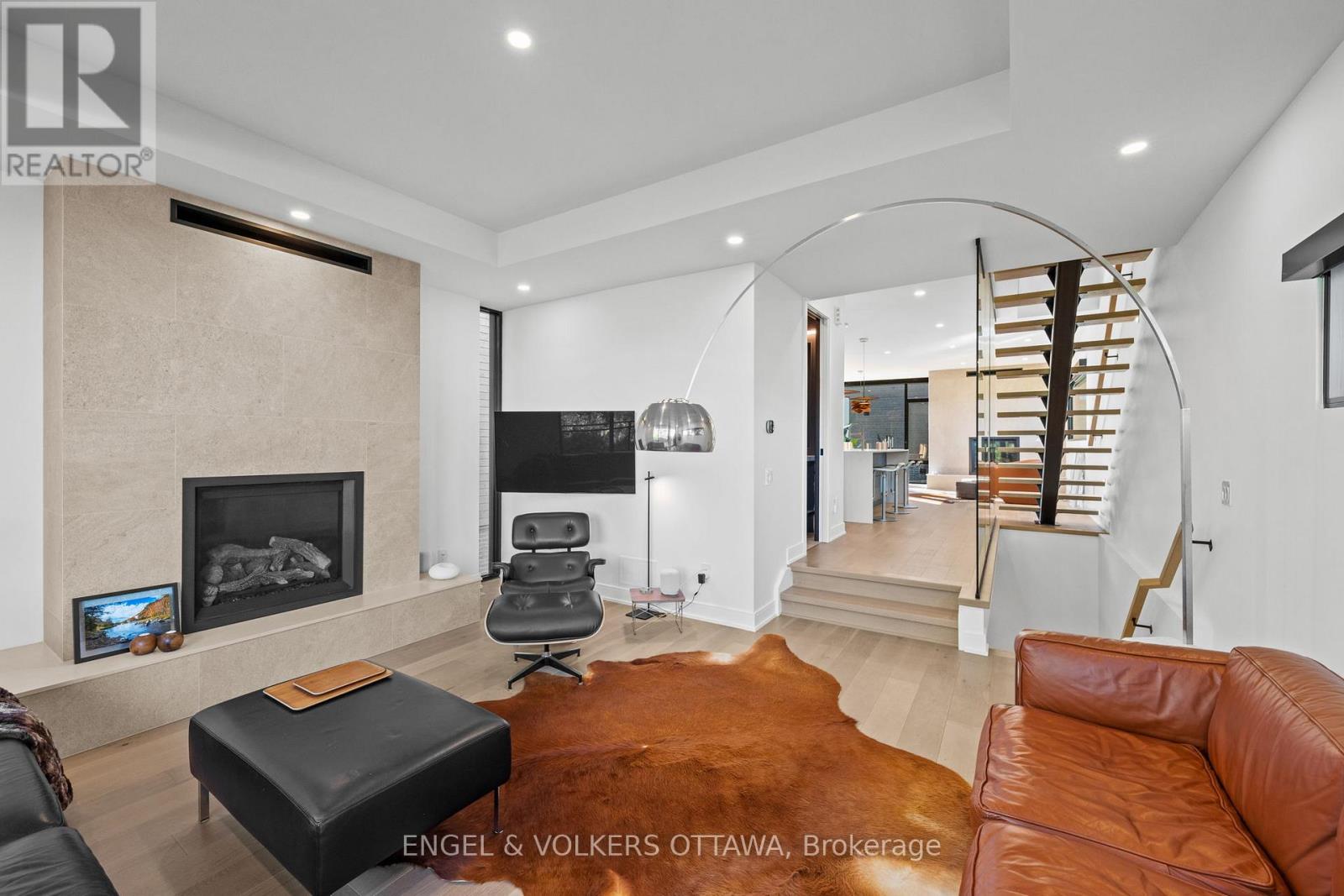 Welcome to 127 Peridot Private, an exceptional residence in an award-winning enclave of just seven luxury homes by Gemstone Developments. This exclusive community blends refined design, natural surroundings, and a prime central location. As the only home in the community featuring an extended private driveway and back deck, as well as incredible additional custom windows, this home offers rare, unobstructed views of the Experimental Farm and the Rideau Canal. Winner of a GOHBA award for interior design, this 3-bedroom, 4-bathroom home showcases over 2,400 sq. ft. of thoughtfully curated living space. The main level is perfect for stylish entertaining, featuring a chef's kitchen with a waterfall quartz island, custom cabinetry, gas range, walk-in pantry with sink, and designer finishes. Two elegant living areas with upgraded gas fireplaces and a sleek powder room complete the space. Amazing views from every room and private balcony off the back living room. Upstairs, the serene primary suite impresses with expansive windows and a spa-inspired ensuite with a soaker tub, expanded two-person glass shower, double vanity, and bidet. Two additional bedrooms, a full bath, and a laundry closet with a sink and custom cabinetry provide flexibility for guests or a home office. Ground level features a spacious foyer and a versatile area currently used as a stylish home gym, easily adaptable as a family room or office, along with a convenient powder room. Upgraded stringer staircase with open glass panels adds a striking architectural element while preserving the homes airy, contemporary feel. An extended lower back deck provides direct access to a beautifully landscaped backyard - offering a peaceful retreat surrounded by nature. Just moments from Little Italy, Dows Lake, and the Civic Hospital, with walking and bike paths at your doorstep. Visit the website for full list of upgrades. (id:49712)
