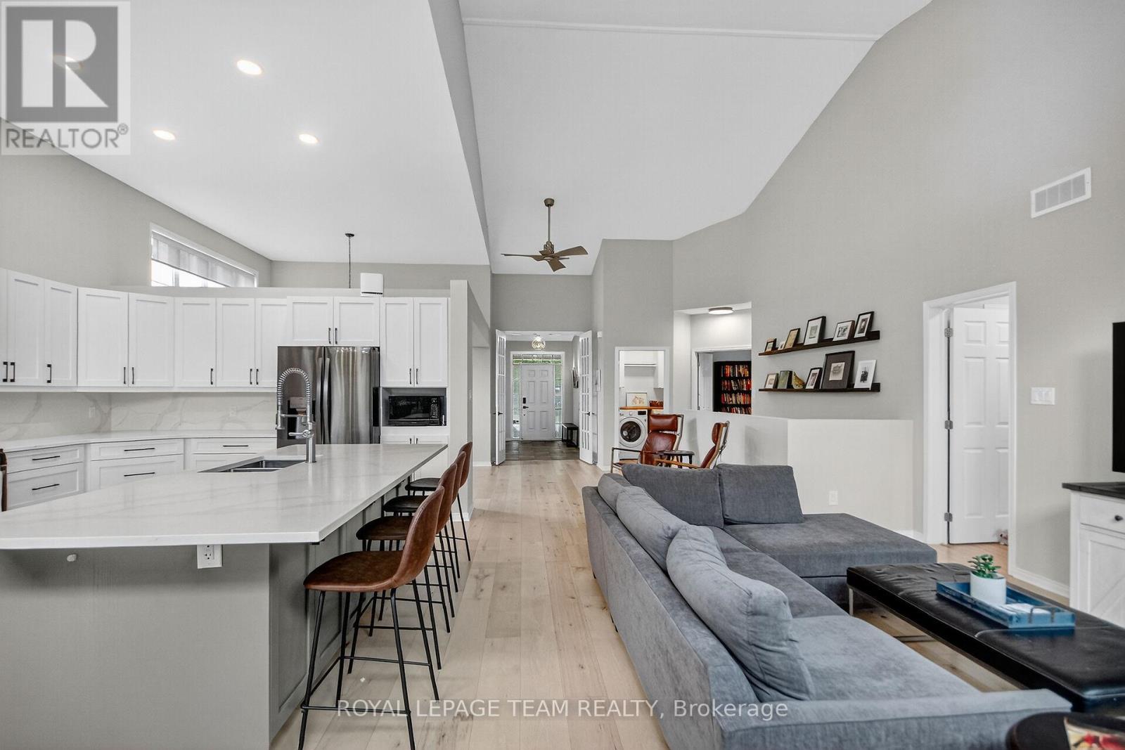 A UNICORN in Stonebridge. This property features a large pie shape lot, sits proudly on a mature & quiet street, backs onto trees not rear neighbours, a fenced, landscaped yard with an inground pool. The updated, cared for bungalow is the sought after Mahogany model ( MPAC 2034 sq ft ) built by Monarch & includes a finished lower level. The spacious open floor plan features high, vaulted or cathedral ceilings through out the main floor. A clever floor plan that offers Bed 3 to be used as an office while separating Bed 2 from the main living areas. A generous formal dining area for family celebrations/entertaining & an amazing updated kitchen featuring a 4' x 9'2" breakfast island, Quartz counters & back splash, updated Black Stainless Steel appliances contrasting beautifully to the white custom millwork. Enjoy casual meals at the island bar or eating area with patio door providing access to the rear yard decks & inground pool. The open family room space is centred around a tile faced gas fireplace, large windows & features a cathedral ceiling. The Pbed has a walk in closet, access to the pool deck via its own patio door & a beautifully updated ensuite bath. An oversized ceramic/glass shower, custom millwork, dual sink vanity & sleek lighting all recently completed in this ensuite. The lower level will not disappoint with its generous sized games area, a conforming 4th bedroom, full bath & a True Theatre Room. The seller's workshop/storage area is in the furnace room & includes repurposed millwork storage from the updated kitchen, a work bench & utility tub. Be sure to check out the many updates/upgrades done over the past couple years. Book your showing soon & be ready to start packing. Sellers can be flexible to accommodate the new owners occupancy needs. (id:49712)