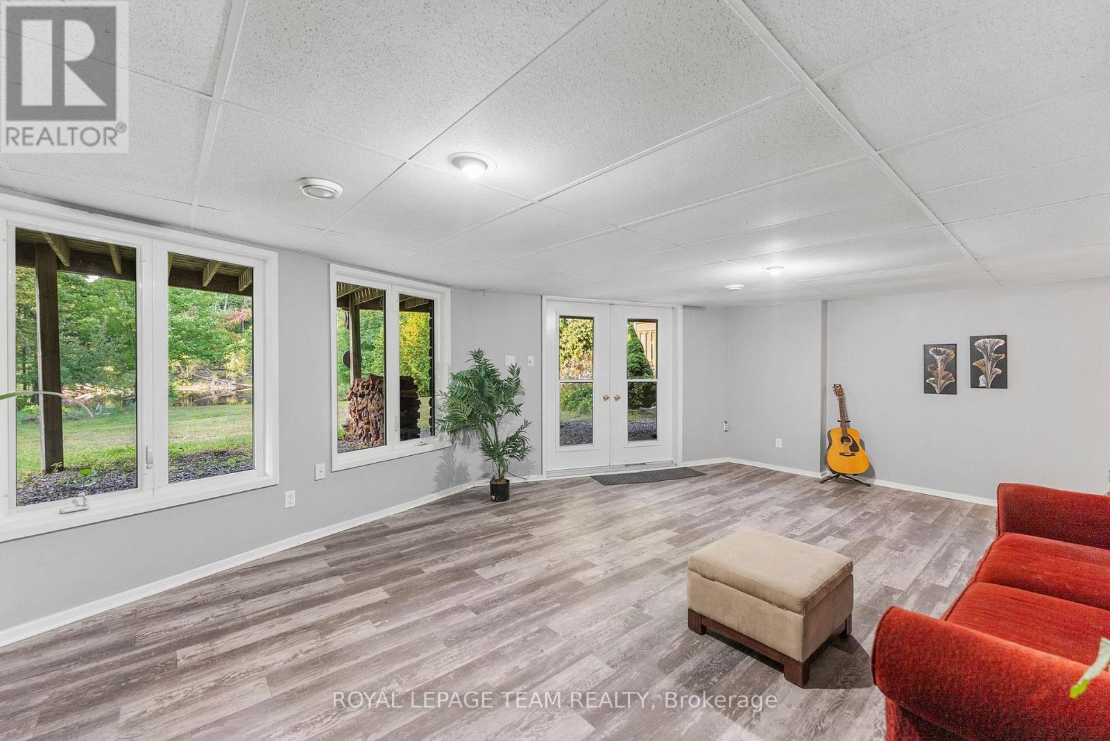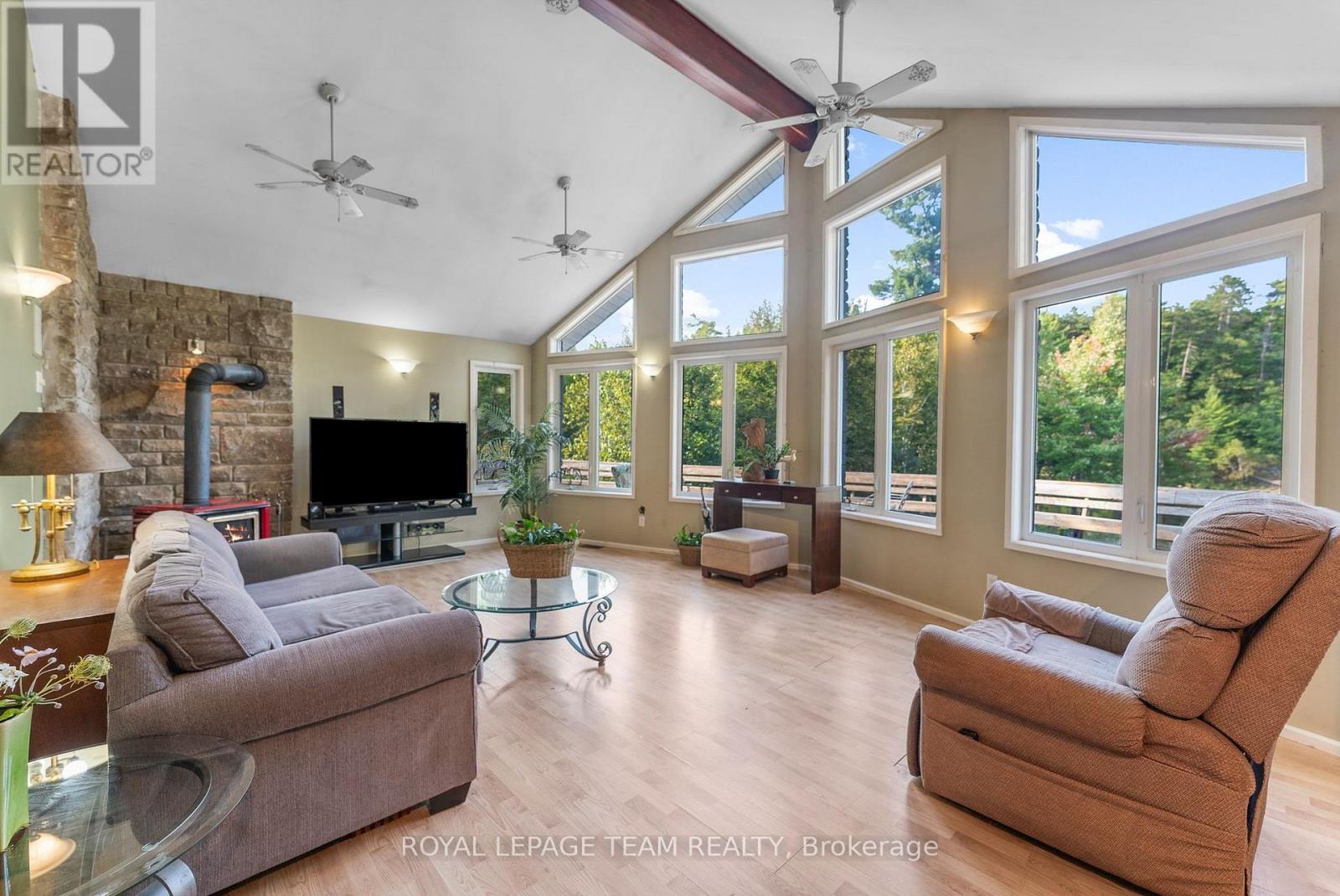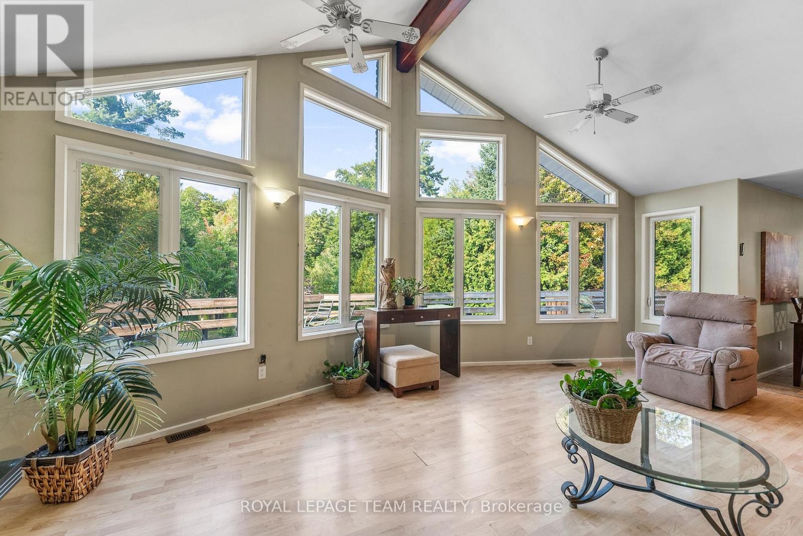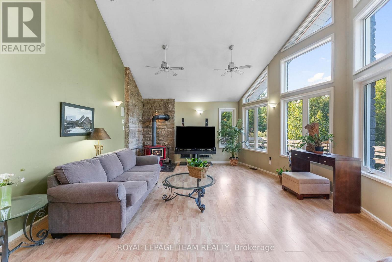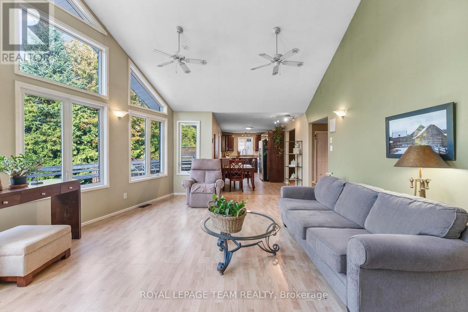 Custom stone waterfront bungalow with 4 bedrooms, 3 bathrooms, on a private half acre along the Petawawa River. Surrounded by mature trees including your own Macintosh apple tree this home offers exceptional privacy with no rear neighbours and a backyard that opens directly to a peaceful forest. The curb appeal is unmatched with its exquisite stone masonry exterior, extra-long driveway, double garage, and a brand-new roof (July 2025). Inside, an oversized foyer introduces 8 ft ceilings throughout the main level, leading into a sun-filled living room with 14 ft vaulted ceilings and a dramatic wall of windows that bring the outdoors in, framing peaceful views of the river and private backyard. The open kitchen and dining area flow directly to an oversized deck spanning the entire back of the home, perfect for entertaining by the water. A main floor laundry room adds everyday convenience.The primary suite includes an ensuite, walk-in closet, and glass doors opening to the patio. The fully finished walkout basement adds two more bedrooms, a large family room, and a newly renovated bathroom. Life here extends beyond the home. Spend weekends at Petawawa Point Beach and boat launch (steps away), explore local trails and parks, and enjoy the convenience of nearby amenities, restaurants, Garrison Petawawa , and Valour JK12. 24 hour irrevocable on all offers. (id:49712)