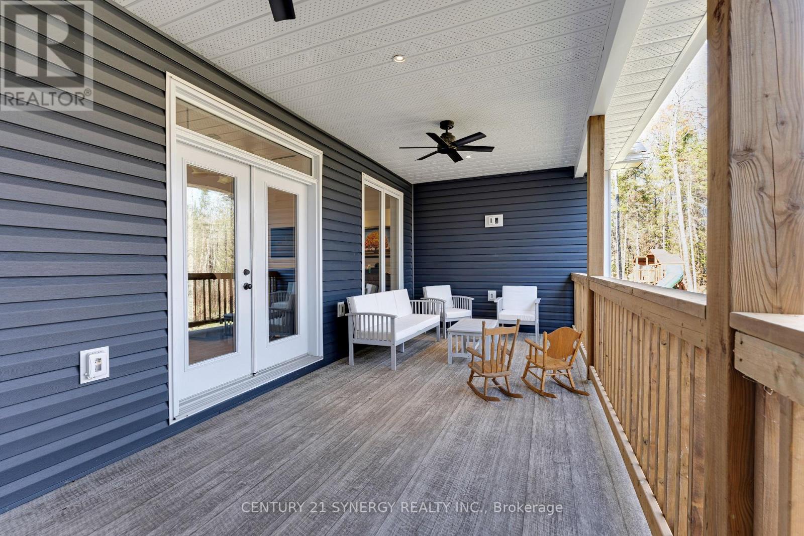 A rare opportunity to own a custom-built 3+1 Bed, 3 Bath, 2,200 sq. ft. walkout bungalow, situated on a beautiful 2.5 acre forested lot. The maintenance free exterior boasts Permalock aluminum shingles, buried eavestrough and vinyl siding. Stepping inside you're greeted with soaring 13' vaulted ceilings in the great room, a cozy propane fireplace and wide plank white oak engineered hardwood throughout the main level. The chef-inspired kitchen is appointed with granite counters, a 6' island, a cooktop, built-in oven and a walk-in pantry. The Primary's wing of the home hosts a generously sized bedroom with WIC, a gorgeous 5 piece ensuite with a walk-in shower, marble counter top, his and her sinks and 6' tub. The opposite wing has 2 bedrooms with a full bathroom, all while the picture windows throughout the house bring the outside feeling in. The covered rear deck with anti-slip PVC membrane allows you to enjoy nature while not getting soaked. The massive walkout lower level features 9' ceilings, a 24x24 basement work shop with separate entrance, the 4th bedroom and a rough-in for the 4th bathroom, all equaling to incredible potential for additional living space or business. For the EV enthusiasts, the oversized insulated double car garage has 2 wall chargers with Tesla and Universal connectors that share a 60Amp breaker. Not to worry, if the the power goes out the home is protected by a 20Kw Kohler generator ensuring your Starlink internet and EV's will always be charged and the lights will always be on. ** This is a linked property.** (id:49712)