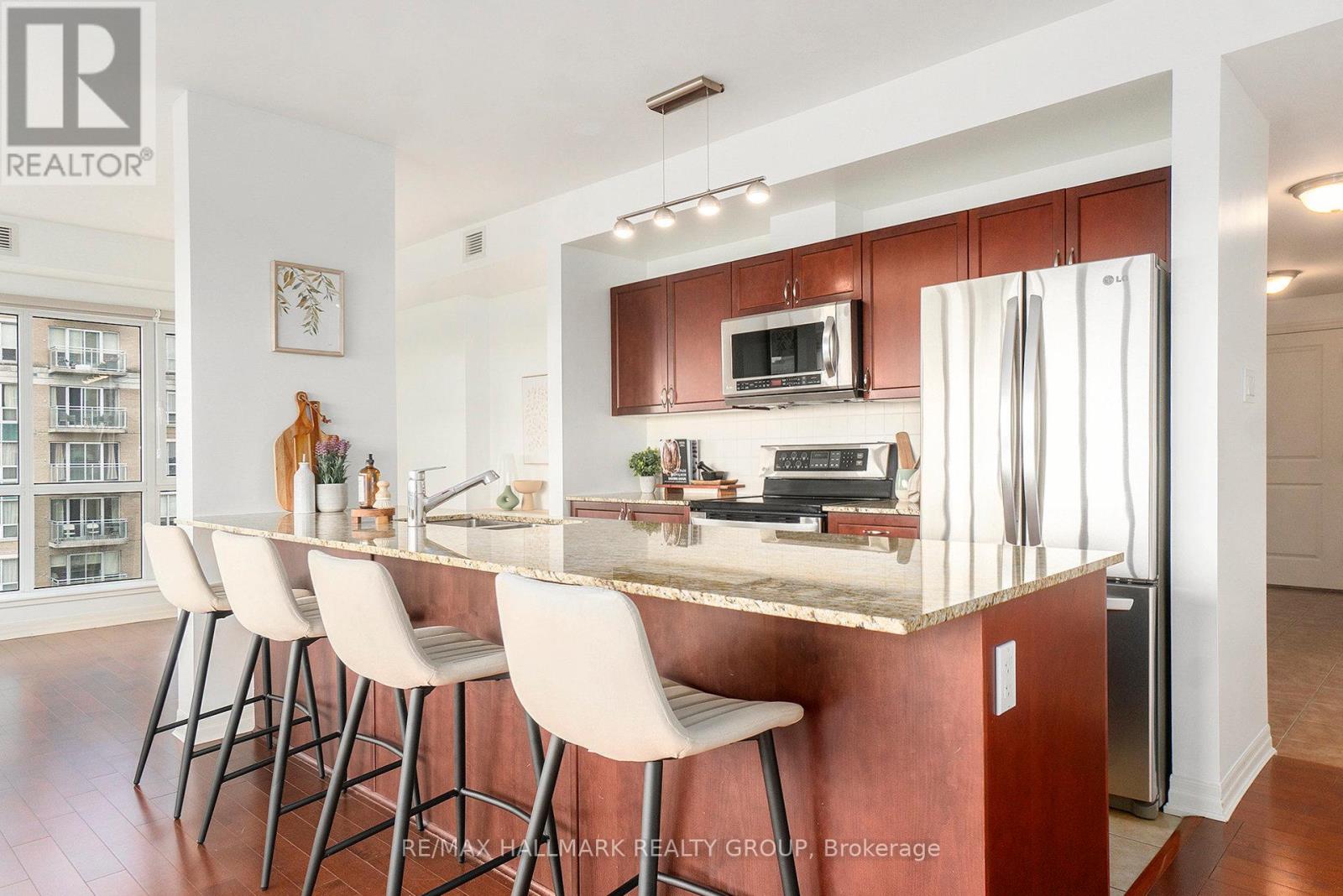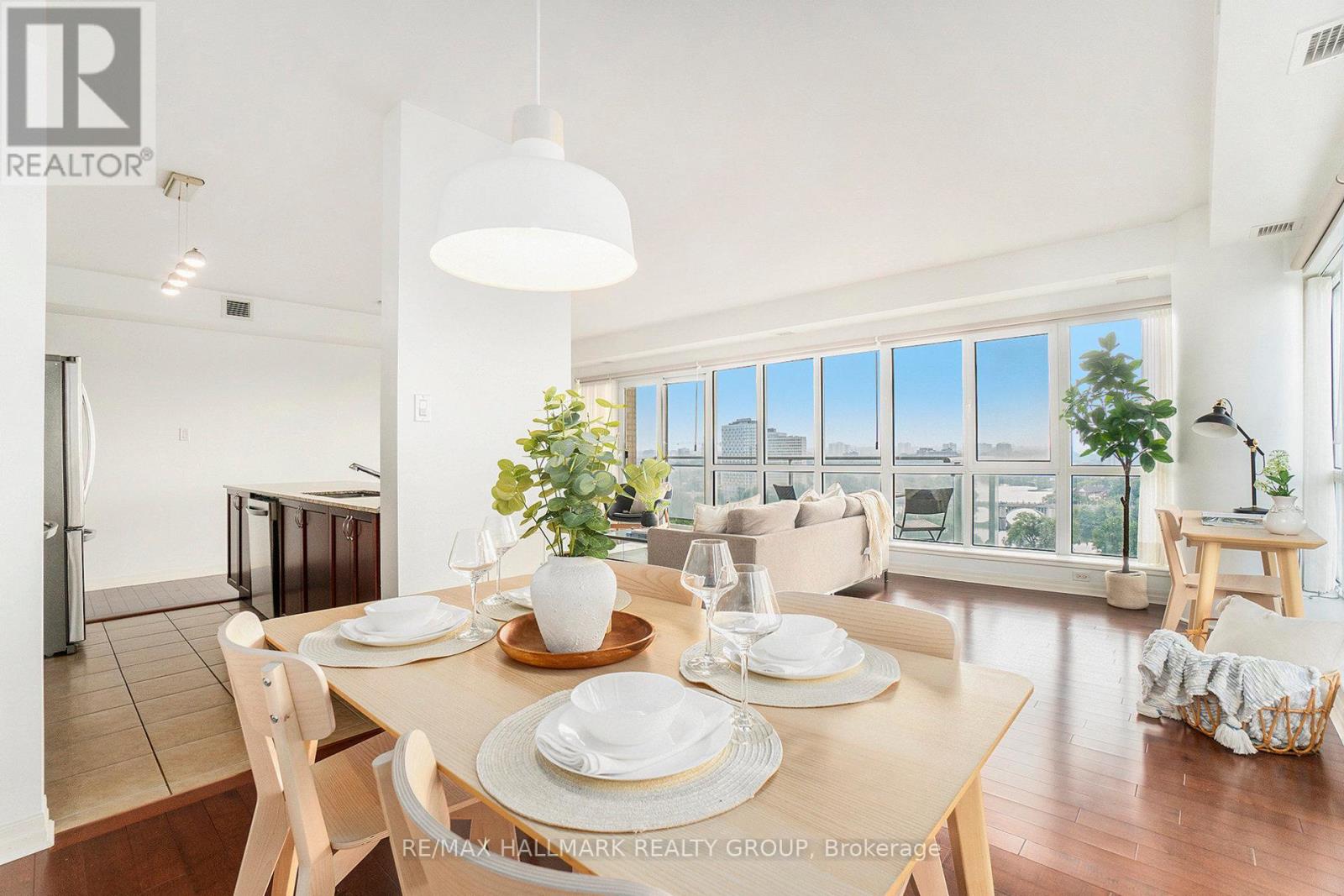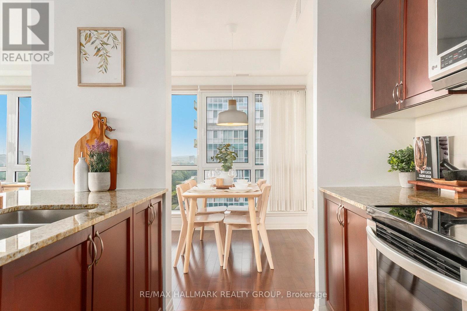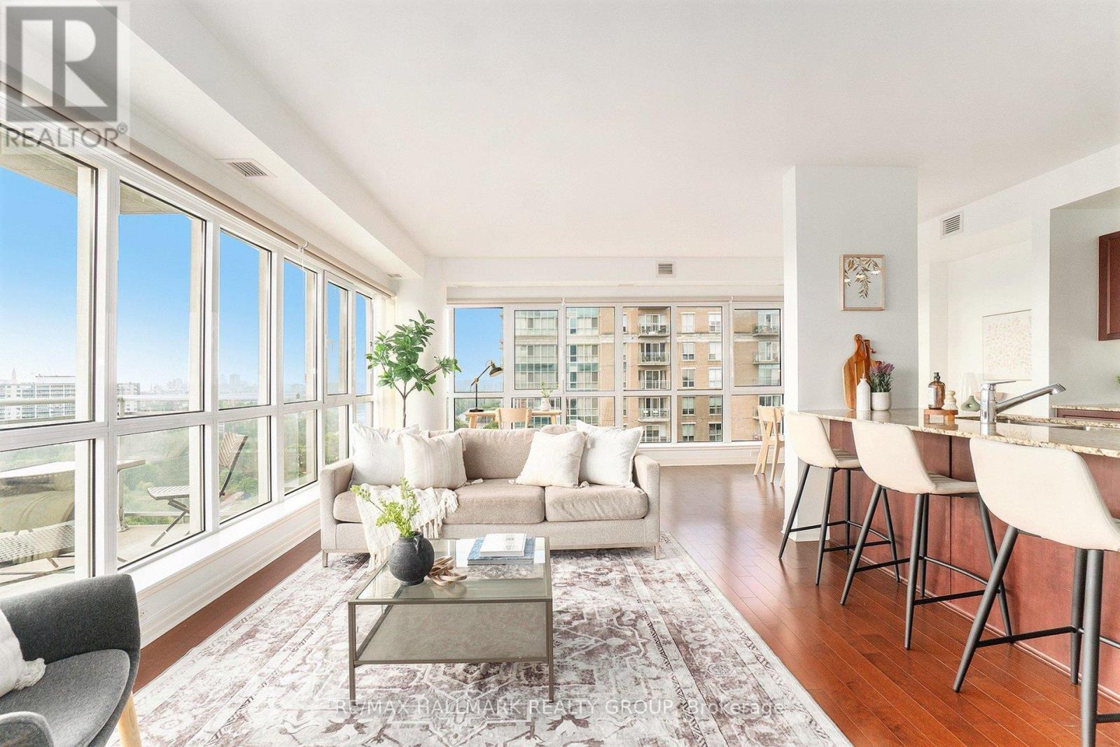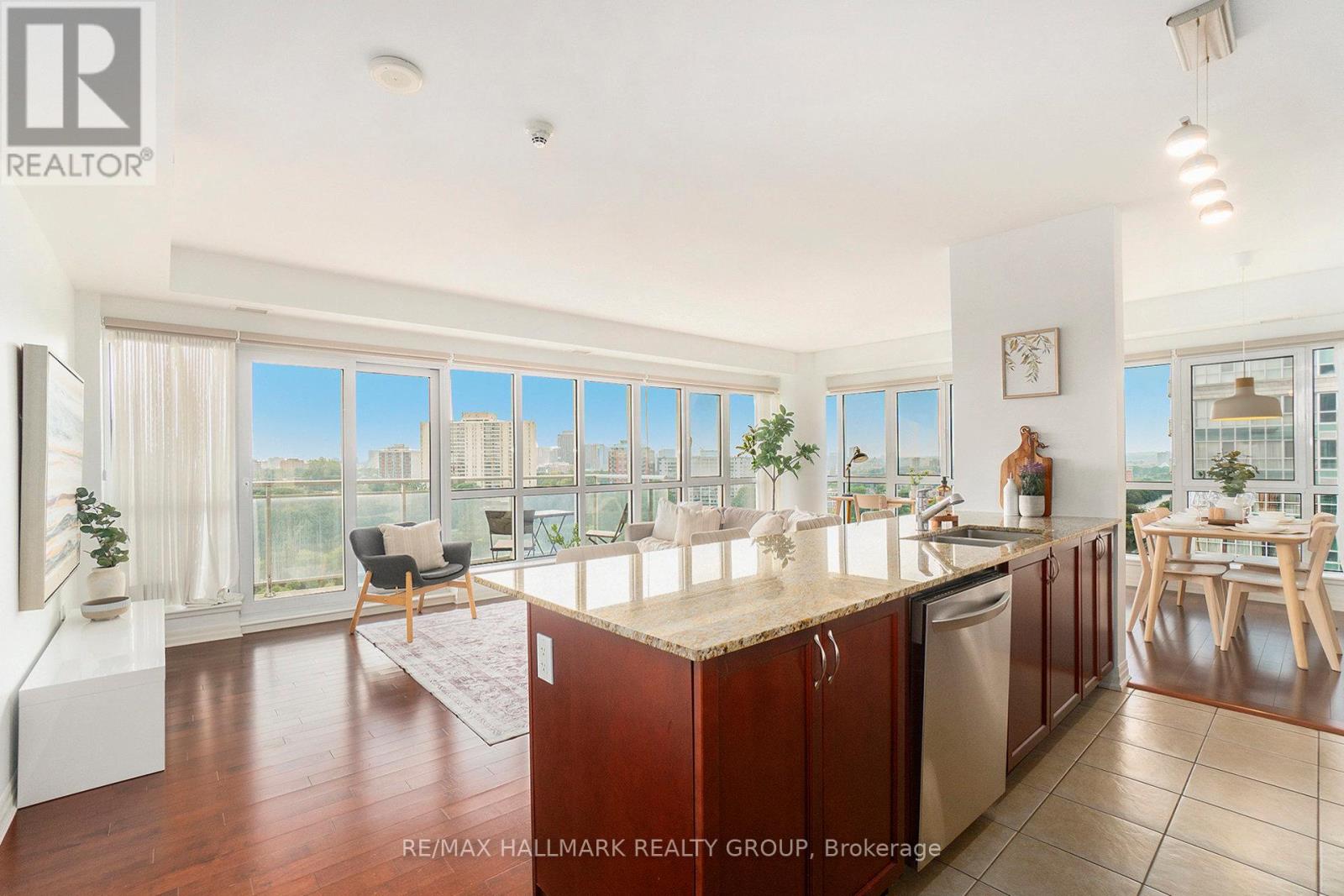 Welcome to 1602-90 Landry Street - a bright and spacious corner-unit condo boasting panoramic views of the Rideau River and downtown Ottawa. This 2-bedroom, 2-bathroom suite offers 1,185 sq ft (per MPAC) of thoughtfully designed living space with hardwood and tile flooring throughout. The open-concept kitchen features granite countertops, stainless steel appliances, and a peninsula perfect for casual dining or entertaining. Floor-to-ceiling windows flood the living/dining area with natural light, while the large balcony invites you to enjoy stunning city and river views. The primary bedroom includes a walk-in closet and a private ensuite, while the second bedroom is served by a full bathroom. Added conveniences include in-unit laundry, underground parking with a Level 2 EV charger, and a storage locker. Enjoy access to premium amenities including an indoor pool, fitness center, and recreation room. Ideally located in a walkable, amenity-rich neighborhood - just 400m to Metro, with Beechwood/MacKay and Vanier/Meilleur bus stops nearby. Kingsview Park and Ashbury College (1 km) add to the appeal of this exceptional location. Experience a perfect blend of comfort, lifestyle, and convenience in this sought-after Ottawa community. A rare opportunity not to be missed. (id:49712)