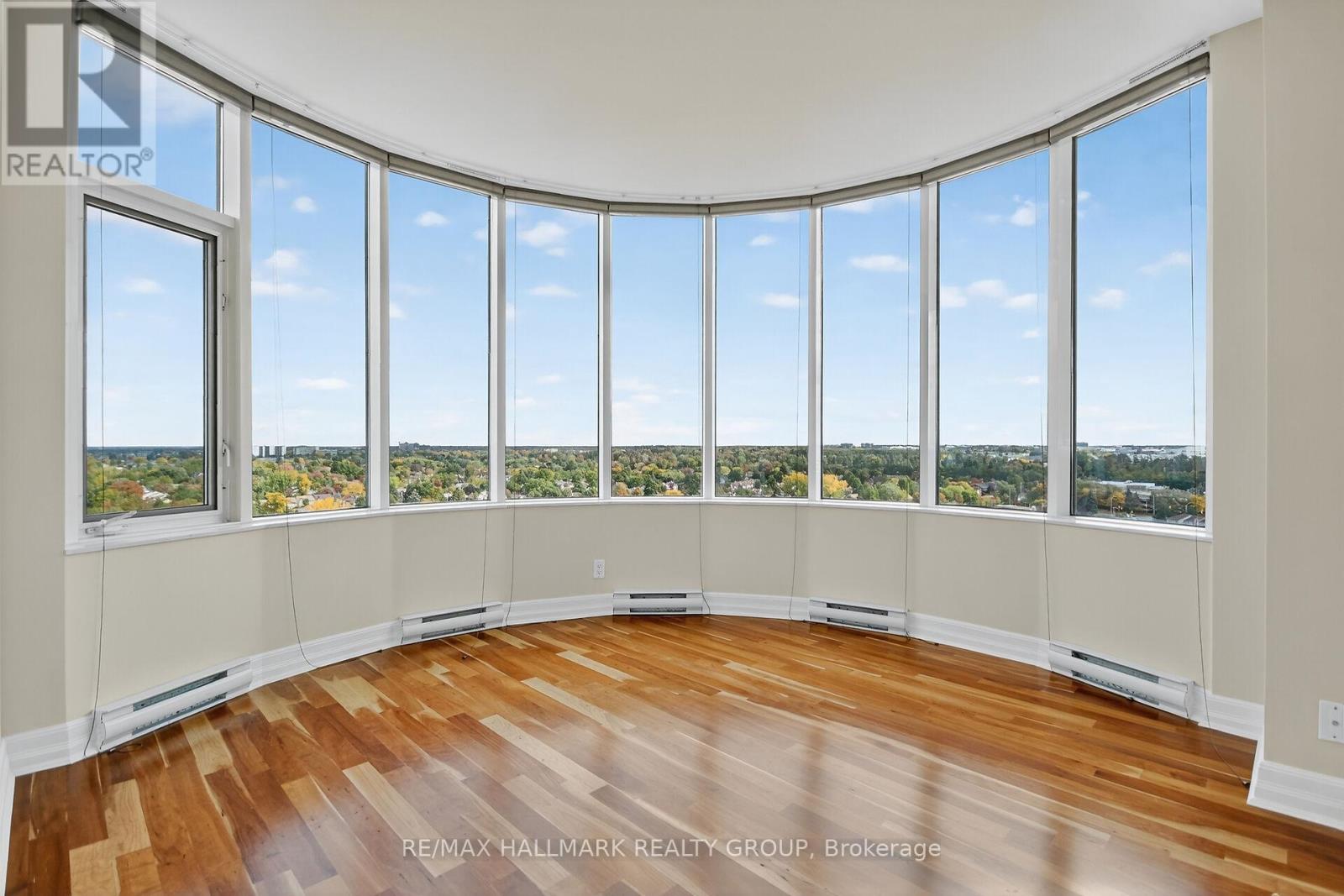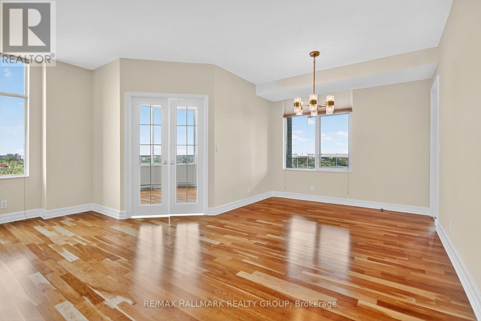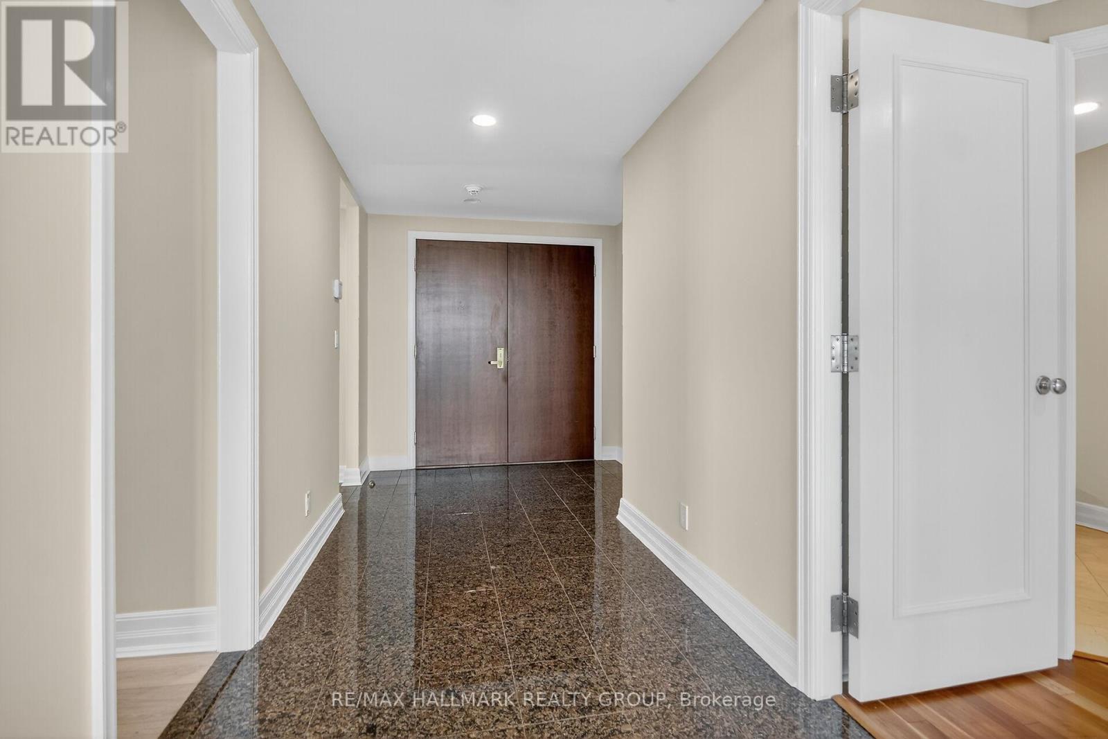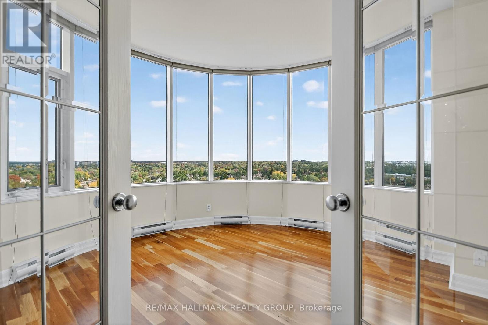 $1,325 MonthlyWelcome to an extraordinary resort style setting along the picturesque Rideau River in one of Ottawa's most prestigious gated communities. This impressive 1836 square foot corner residence offers two bedrooms plus a spacious den and two and half bathrooms. Fabulous open concept living and dining rooms and adjacent study with expansive wall to wall windows showcasing amazing cityscape views. Beautifully renovated chef's kitchen featuring expanded cabinetry, quartz countertops, ceramic backsplash, built in wine fridge and bright eat in area with access to a spacious glass enclosed balcony. Primary bedroom suite includes a walk in closet with built in custom cabinets and a spa inspired ensuite with walk in shower and a deep soaker tub. The spacious second bedroom is thoughtfully positioned on the opposite side of the apartment and is complete with its own private ensuite bathroom. Breathtaking panoramic views from every room with amazing RIVER VIEWS from the kitchen, second bedroom and balcony. High ceilings and rich hardwood flooring enhance the sophisticated appeal throughout. Amenities include indoor pool, tennis courts, pickle ball courts, exercise center, guest suites, concierge services and 24/7 gate house security. Underground parking and two storage lockers. (id:49712)