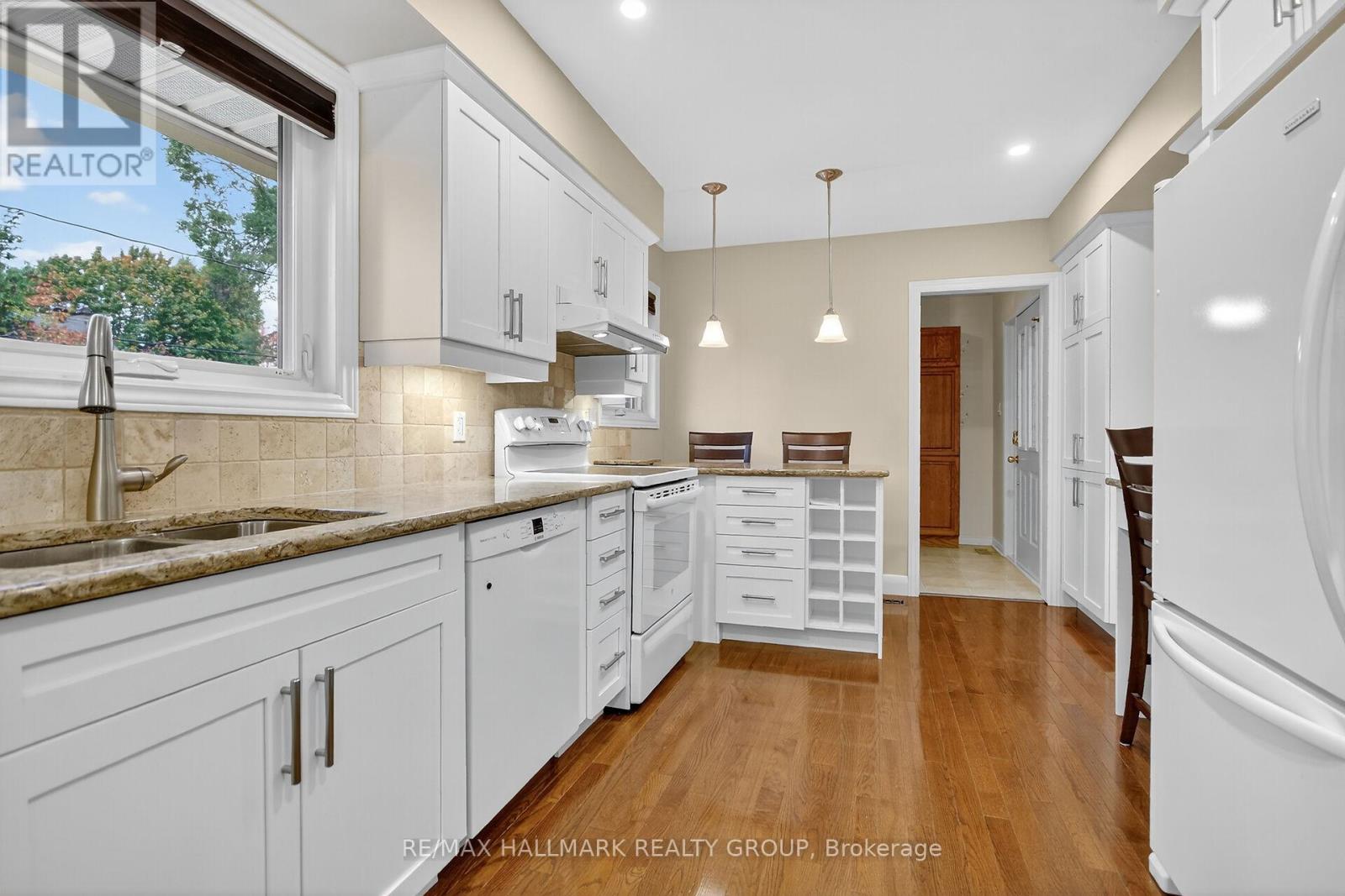 Welcome! Here is a classic Campeau built 1 1/2 storey home on one of Elmvale Acres nicest, child friendly streets. The mud room addition offers a spacious entrance foyer and closet as well as a handy full bath w. shower. The huge eat in gourmet kitchen is fully renovated with high end cabinets, appliances and quartz counters. The combined living/dining rooms are entertainment sized and boast ample sunlight and hardwood floors. The handy main level den/bedroom completes the main level. The second floor features 2 good sized bedrooms and a renovated full bath w. soaker tub. The basement level has plenty of storage, a recreation room and 2 piece bath...the basement possibilities are endless! The large backyard is fully fenced and hedged offering excellent privacy. Elmvale Acres is a fantastic neighborhood with easy access to greenspace, the hospitals, shopping and transit. A great place to call home! Come see all this wonderful home has to offer! 24 hours irrevocable on offers. (id:49712)