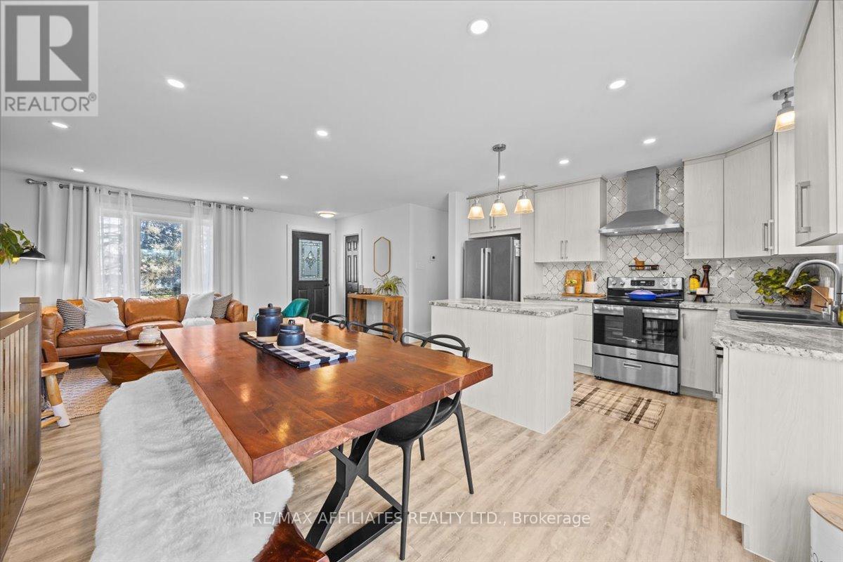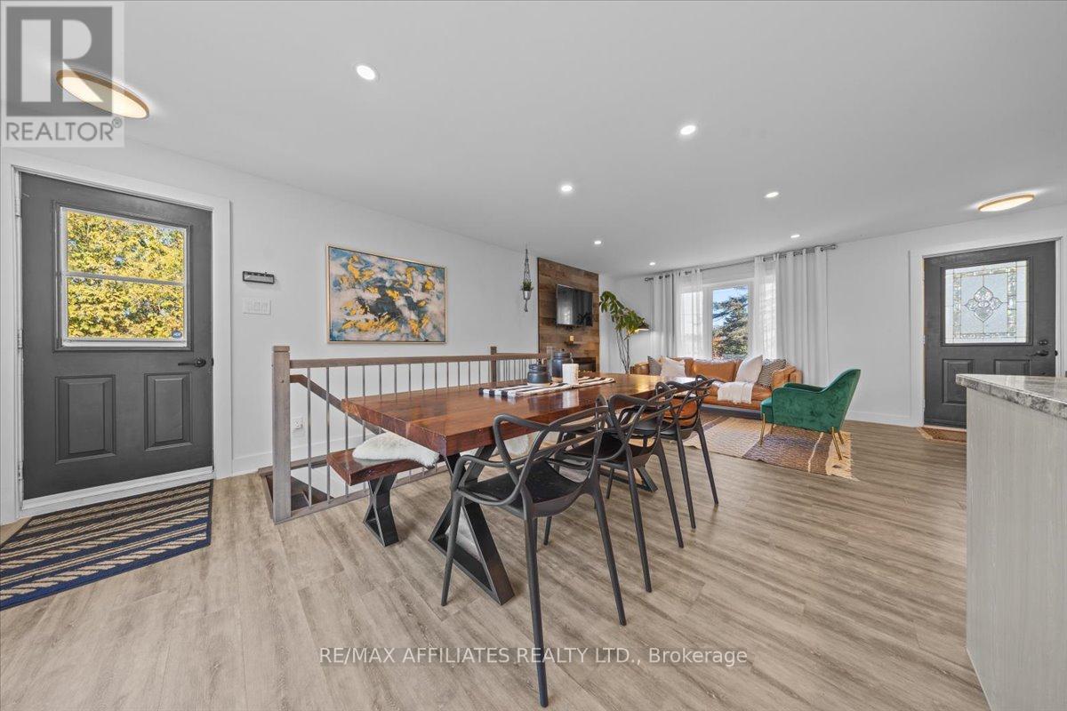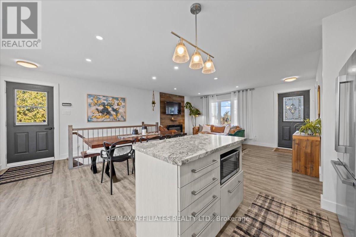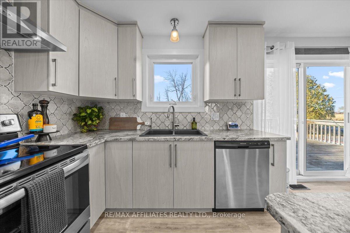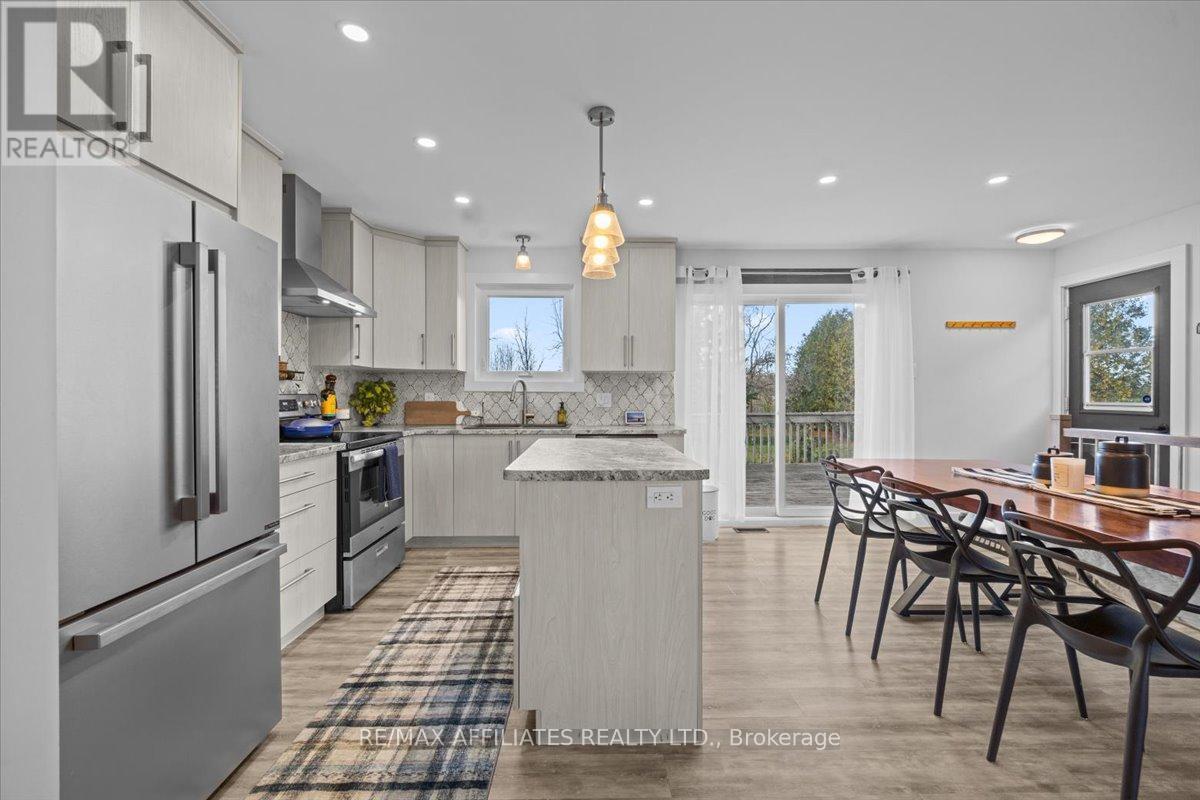 Welcome to this beautifully updated 3-bedroom, 1-bath bungalow featuring a bright open-concept floor plan with flat ceilings and pot lights throughout. Located in Cumberland, just 5 min from Orleans. ??The living, dining, and kitchen areas flow seamlessly together, highlighted by luxury vinyl flooring and a modern fireplace with a warm wood-accent surround. The updated kitchen features stainless steel appliances, a double sink, a tiled backsplash, a centre island, and ample workspace for cooking and entertaining. A patio door off the dining area leads to a large deck overlooking the private yard, surrounded by mature hedges and complete with a storage shed. The home offers three comfortable bedrooms, including a spacious primary bedroom with ample closet space. The fully updated 5-piece bathroom features dual sinks and a white subway tile bathtub surround for a clean, modern look.Additional highlights include vinyl windows, a newer roof, a newer furnace, and a newer septic tank. Recent upgrades include septic tank, plumbing, electrical, insulation, water softener, reverse osmosis system, well pump, and parging, along with kitchen, bath, flooring, Vinyl windows, Furnace and Roof. The property also features a convenient drive-thru driveway from Dunning Road to French Hill Road. A hardwood staircase with metal spindles leads to the lower level, where you'll find a bright laundry room and a spacious rec room with five large windows and a suspended ceiling with pot lights-offering plenty of potential for an additional bedroom and bathroom. This move-in-ready home blends modern updates with functional living in a peaceful setting, just minutes from city convenience. (id:49712)