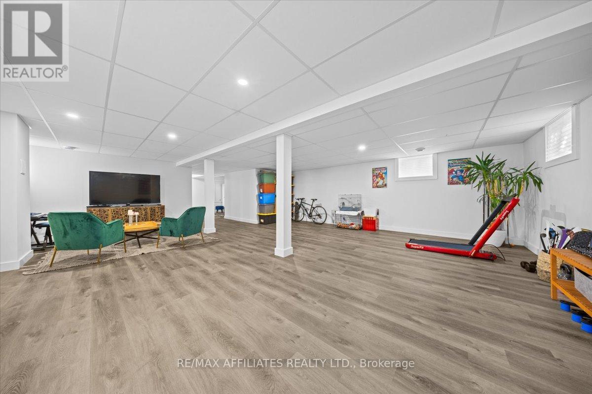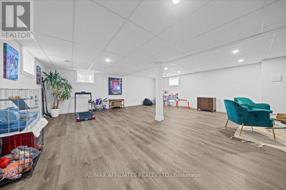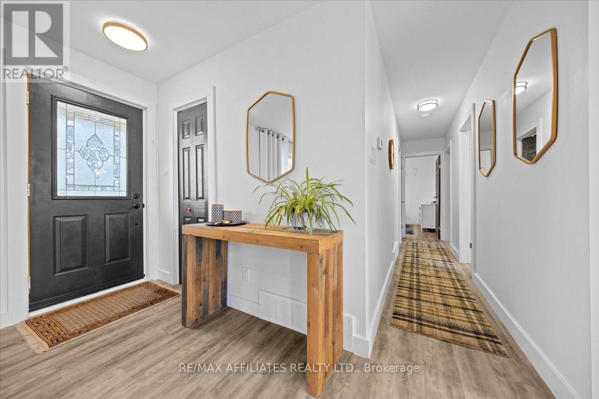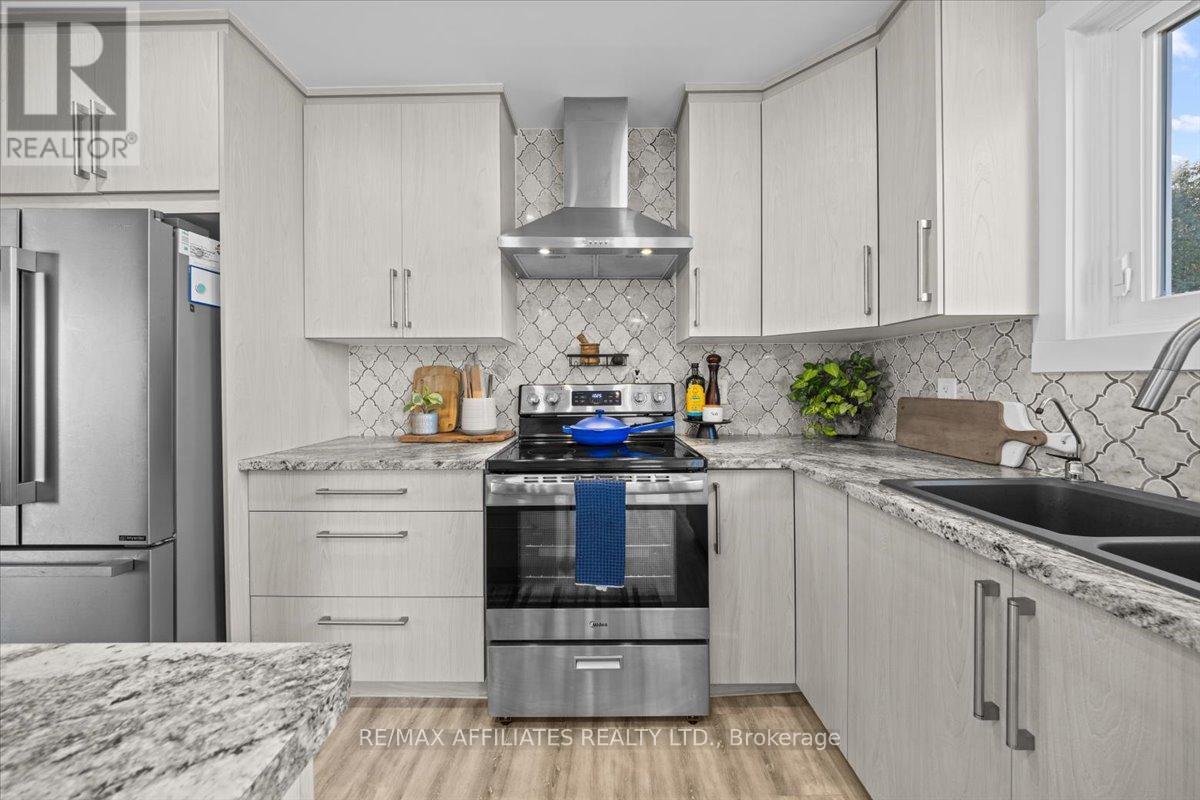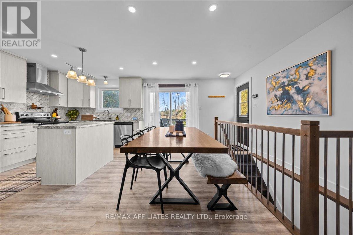 Welcome to this beautifully updated 3-bedroom, 1-bath bungalow featuring a bright open-concept floor plan with flat ceilings and pot lights throughout. Located in Cumberland, just 5 min from Orleans. ??The living, dining, and kitchen areas flow seamlessly together, highlighted by luxury vinyl flooring and a modern fireplace with a warm wood-accent surround. The updated kitchen features stainless steel appliances, a double sink, a tiled backsplash, a centre island, and ample workspace for cooking and entertaining. A patio door off the dining area leads to a large deck overlooking the private yard, surrounded by mature hedges and complete with a storage shed. The home offers three comfortable bedrooms, including a spacious primary bedroom with ample closet space. The fully updated 5-piece bathroom features dual sinks and a white subway tile bathtub surround for a clean, modern look.Additional highlights include vinyl windows, a newer roof, a newer furnace, and a newer septic tank. Recent upgrades include septic tank, plumbing, electrical, insulation, water softener, reverse osmosis system, well pump, and parging, along with kitchen, bath, flooring, Vinyl windows, Furnace and Roof. The property also features a convenient drive-thru driveway from Dunning Road to French Hill Road. A hardwood staircase with metal spindles leads to the lower level, where you'll find a bright laundry room and a spacious rec room with five large windows and a suspended ceiling with pot lights-offering plenty of potential for an additional bedroom and bathroom. This move-in-ready home blends modern updates with functional living in a peaceful setting, just minutes from city convenience. (id:49712)