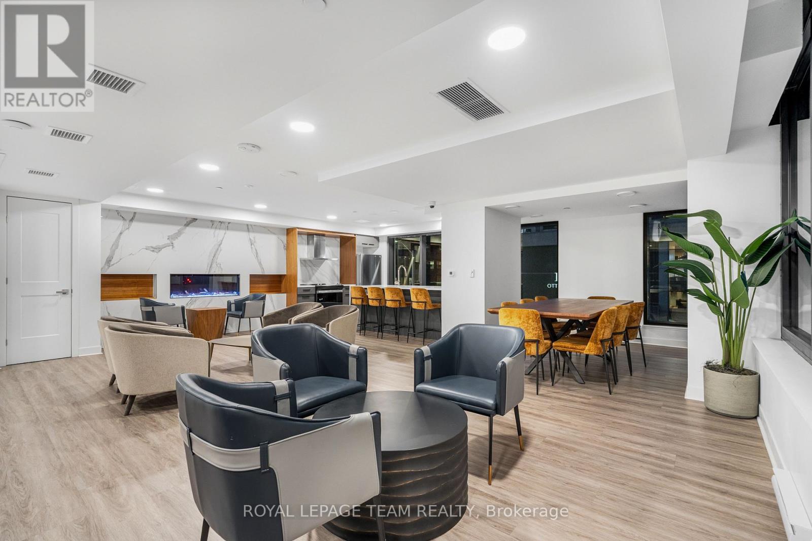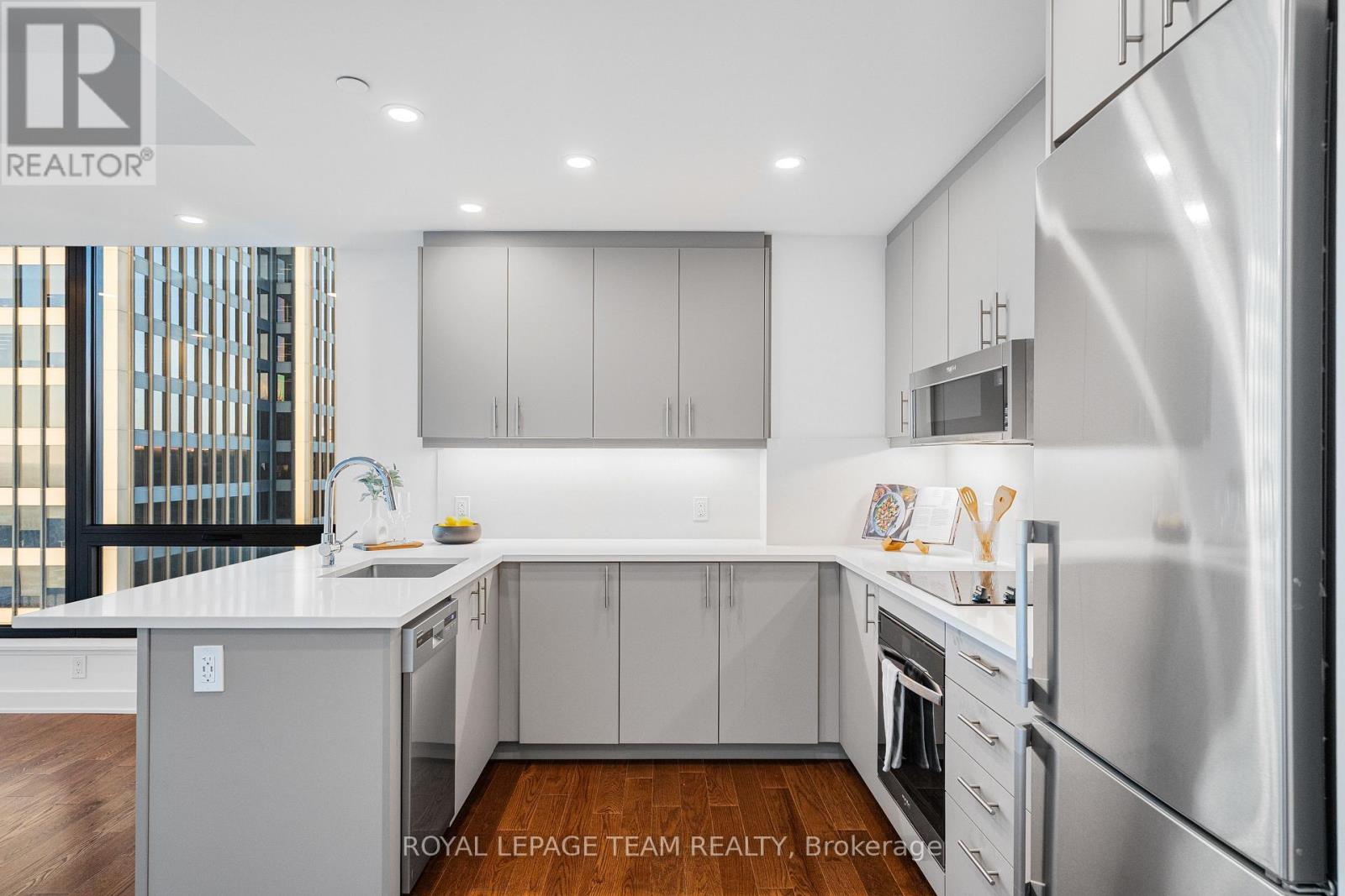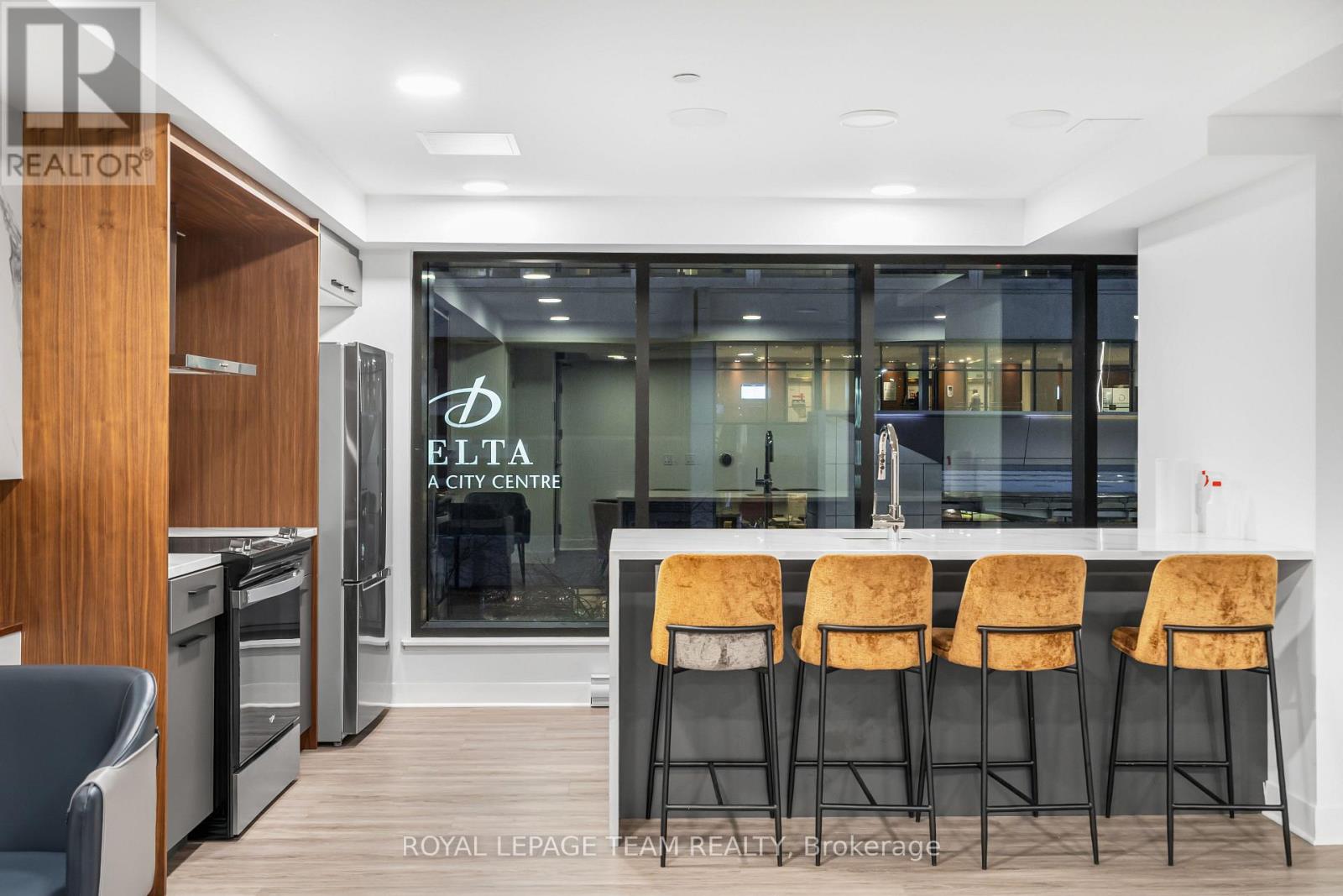 Bright and modern 1-bedroom + den, 1-bath condo at Claridge Moon offering 710 sq ft of stylish living in the heart of Ottawa. The kitchen features quartz countertops and stainless steel appliances. The bright living area connects to the dedicated dining space with access to a private balcony, perfect for morning coffee or evening relaxation. The den provides an ideal home office or study space, while the primary bedroom and full bathroom complete this functional unit. Additional conveniences include in-unit laundry and stunning panoramic views of the Gatineau Hills. Residents enjoy exceptional amenities including a gym, pool, terrace with seating and BBQ, theatre, business centre and guest suite. With a grocery store and rail station right in the building, everything you need is at your doorstep. Live at the centre of the Nation's Capital in comfort, style, and convenience. (id:49712)