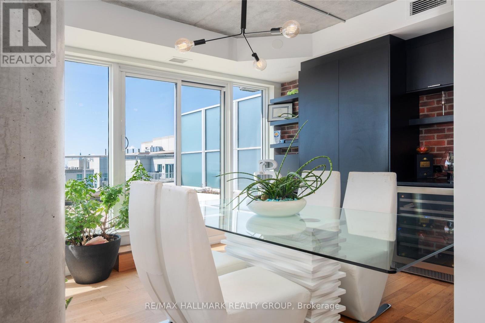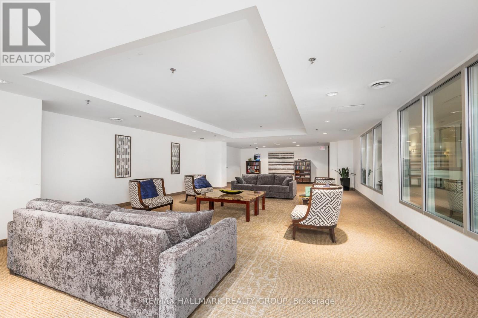 Claridge Plaza Phase 4 The Tribeca Penthouse Welcome to elevated living in the heart of downtown Ottawa. This stunning 2 bed + den, 2 bath penthouse offers an exceptional blend of luxury, comfort, and functionality with 1,415 sq ft of thoughtfully designed interior space and an impressive 480 sq ft private terrace showcasing panoramic views of the city skyline.Step inside to discover a bright, open-concept layout highlighted by floor-to-ceiling windows that flood the space with natural light. Rich hardwood flooring flows seamlessly throughout, adding warmth and sophistication to the contemporary design. The sleek, modern kitchen is a chefs dream complete with quartz countertops, stainless steel appliances, custom cabinetry, and an oversized island ideal for meal prep, casual dining, or entertaining guests.The spacious primary bedroom features generous closet space and a spa-inspired ensuite, while the second bedroom offers flexibility for family or guests. A separate den adds even more versatility, making it perfect for a home office, or a reading nook. Two beautifully appointed bathrooms round out the interior with premium finishes and timeless appeal. Located in the highly sought-after Claridge Plaza Phase 4, residents benefit from access to top-tier amenities including a fitness centre, rooftop terrace, party room, and 24/7 concierge service. For added convenience, this penthouse includes one underground parking space and a private storage locker. Don't miss this rare opportunity to own the prestigious Tribeca floor plan a perfect blend of style, space, and low-maintenance luxury living in the vibrant core of the city. CONDO FEES INCLUDE: Water , A/C, Heat, Building Insurance, Building Maintenance, Garbage Removal, Snow Removal, Common Areas Maintenance, Reserve Fund Allocation. Parking spot: P1 5, Storage Locker: Door behind the parking spot (id:49712)