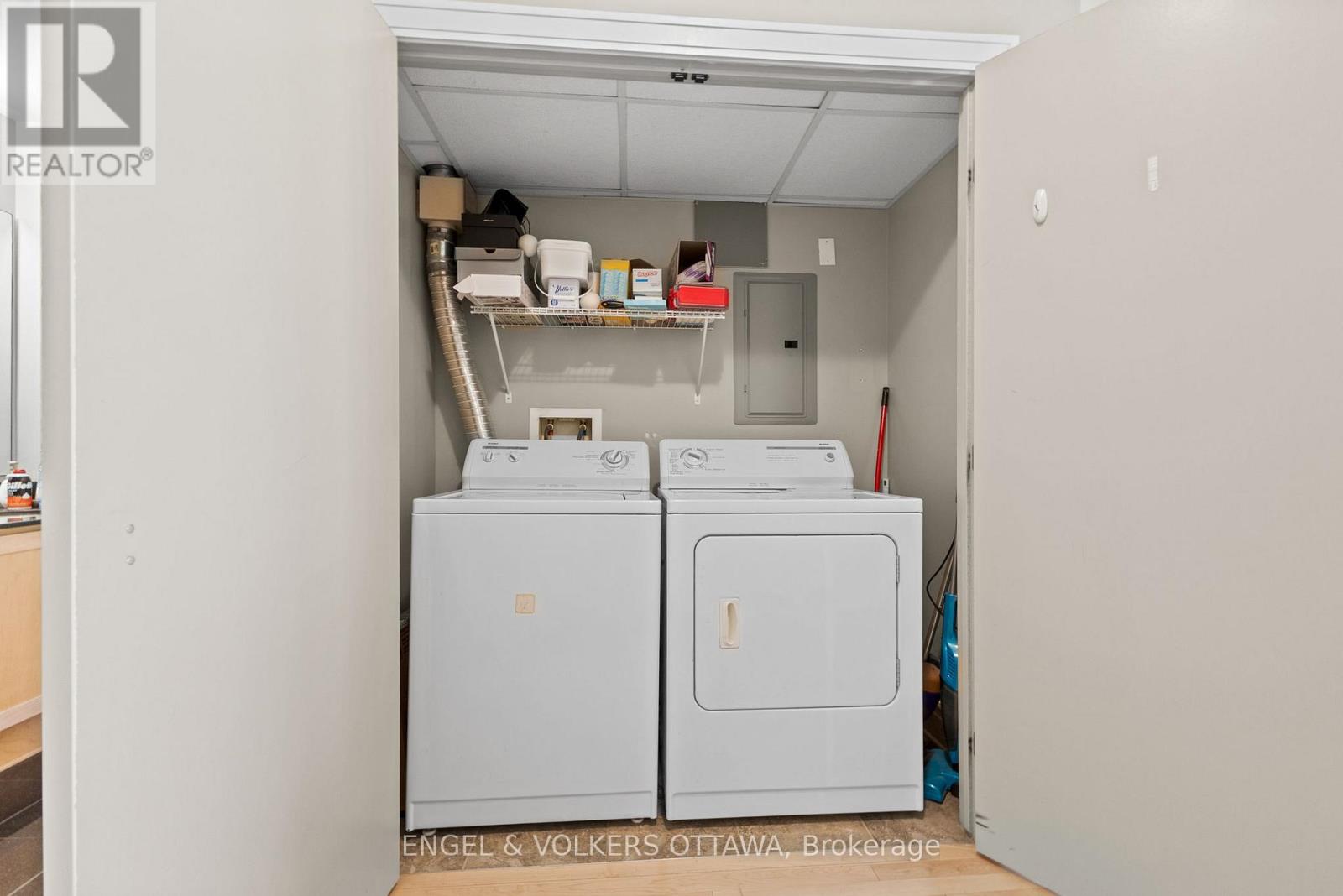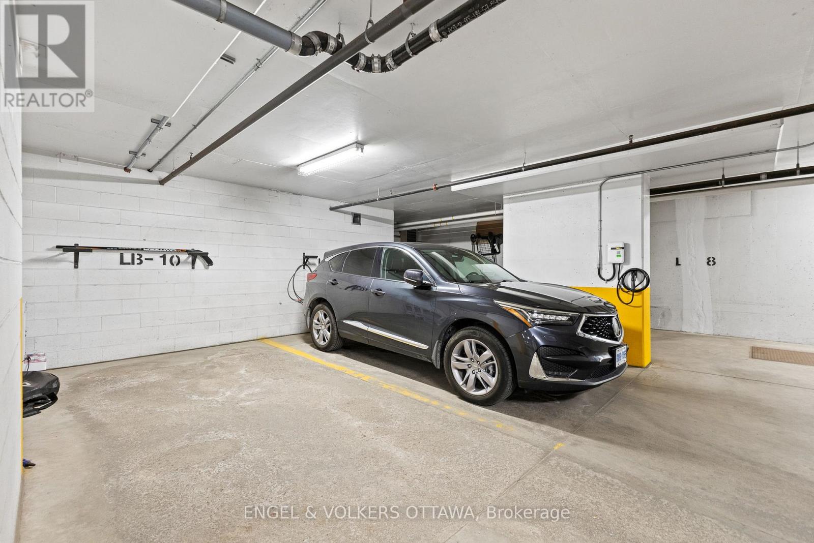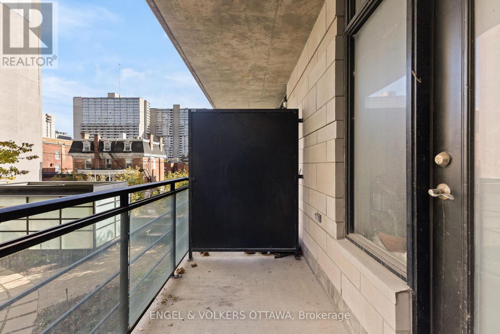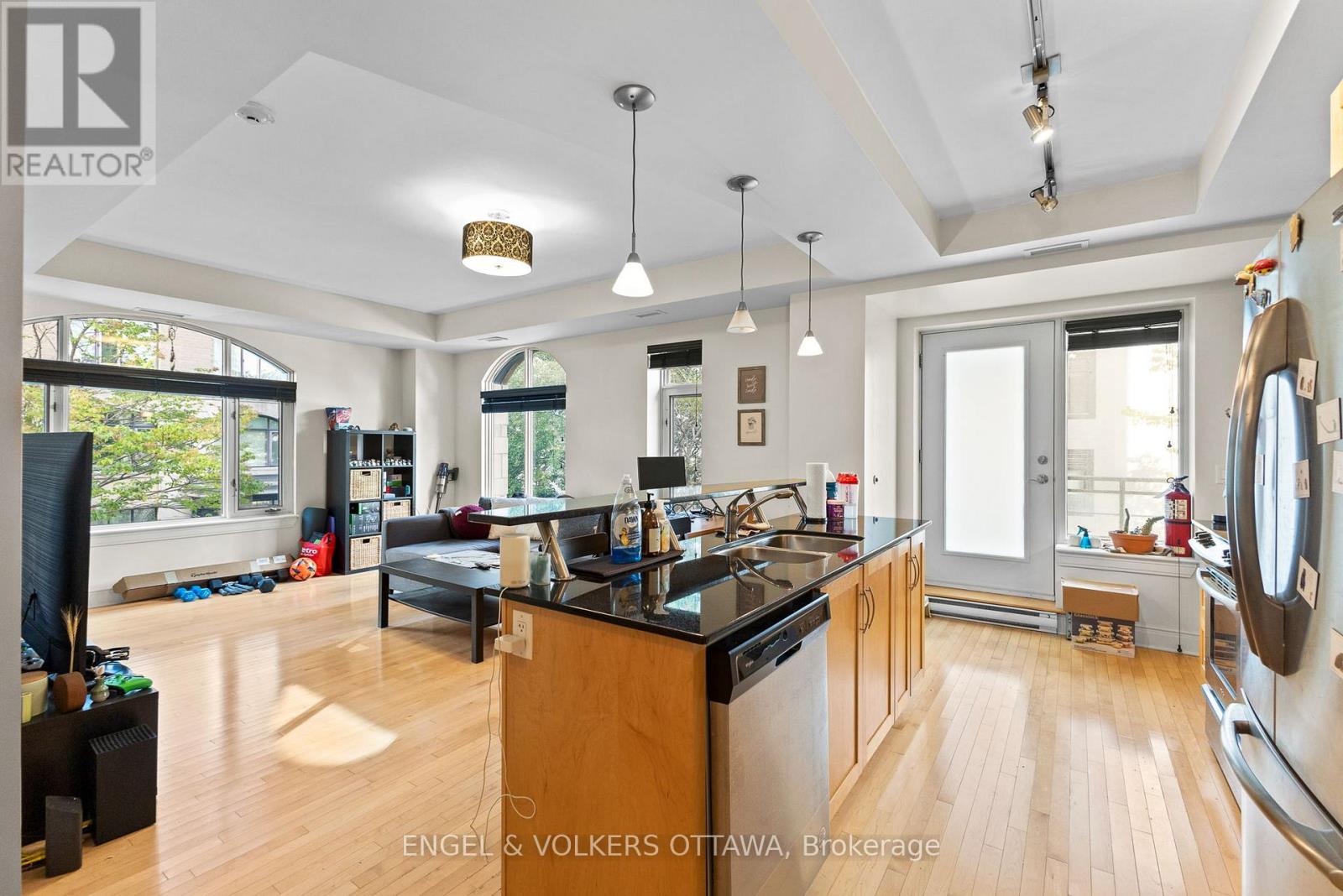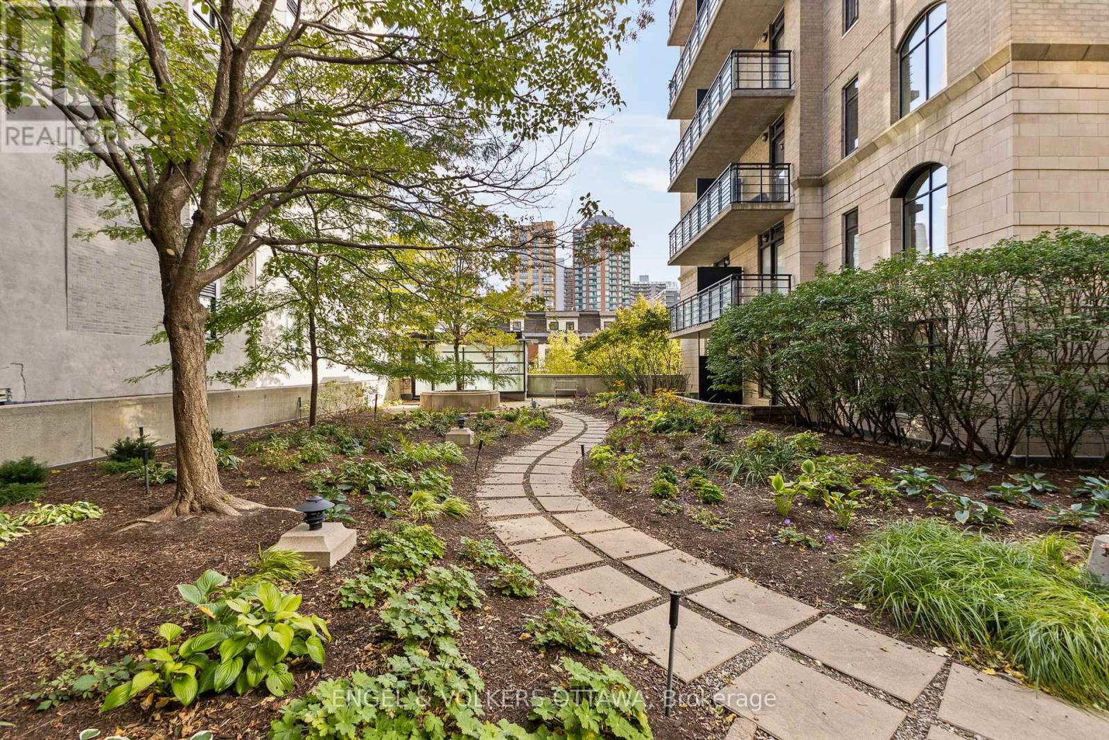 Nestled in a quiet yet central enclave of downtown Ottawa, this corner 1-bedroom, 1-bathroom unit at Bronson Gardens offers the perfect blend of convenience and tranquility. Designed for professionals seeking a walkable urban lifestyle, this condo features an open-concept layout with hardwood floors, custom window blinds, and large windows that fill the space with natural light. The kitchen boasts solid maple cabinetry, granite countertops, a spacious island with a breakfast bar, and plenty of storage. The bright living and dining area is ideal for relaxing or entertaining, with direct access to a private balcony overlooking beautifully landscaped gardens and a serene courtyard. The bedroom includes cheater access to the full bathroom with a shower/tub. Additional features include underground parking, a storage locker, and building amenities such as a fitness centre, party room, car wash station, and private garden courtyard. Enjoy the unbeatable location - just steps from the Lyon LRT Station and the new Food Basics, with downtown shops, restaurants, and parks all within easy reach. Heat and water included - just pay hydro. Available December 1, 2025. (id:49712)