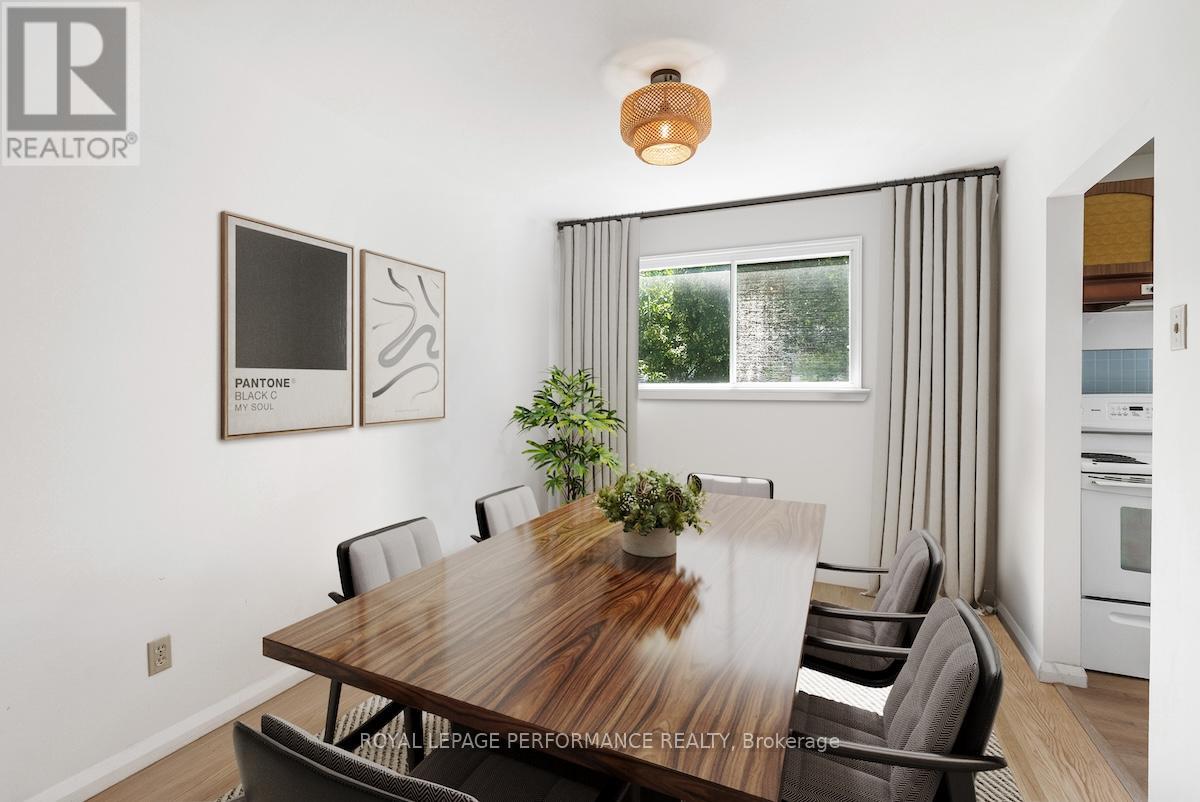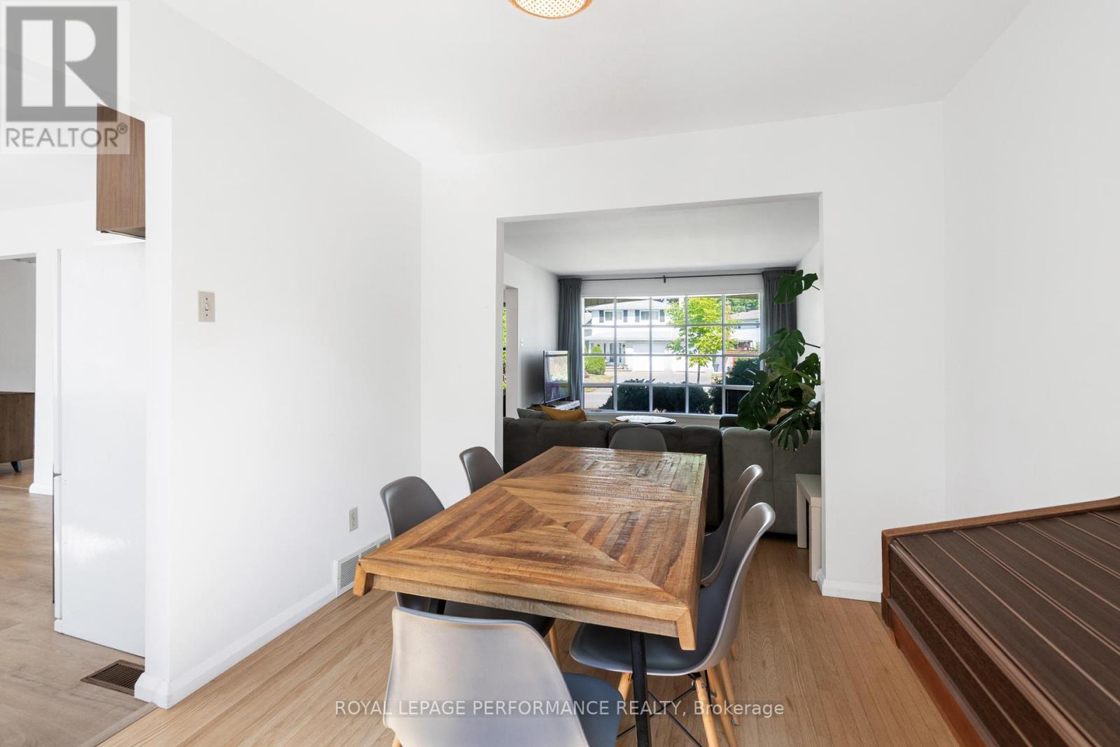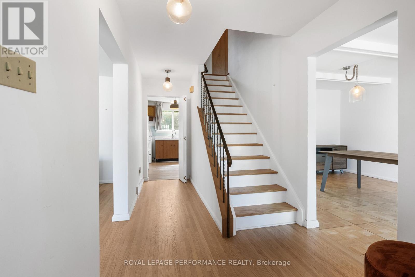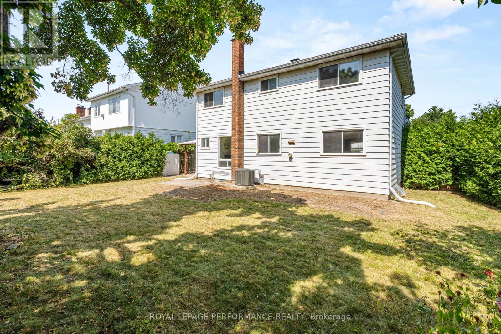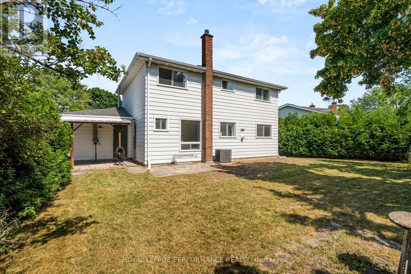 Welcome to this spacious 4-bedroom home ideally situated on a quiet, family-friendly crescent in the heart of Blackburn Hamlet. This two-storey property offers a functional and versatile layout perfect for growing families.The main floor features a bright and inviting family room, a dedicated dining area for hosting, and a cozy living room ideal for everyday relaxation. A convenient powder room and a side entrance to the private yard add practicality to the space. The kitchen area flows well into the backyard, where you'll find a serene, hedged oasis surrounded by mature trees and a covered patio area, perfect for outdoor dining, play, or quiet retreat. The lot is slightly pie shaped. Upstairs, you'll find four generously sized bedrooms, each with good closet space, and a full bathroom. The lower level offers a clean, unfinished basement ready for your customization, whether it be a rec room, home gym, or workshop. Located within walking distance to schools, parks, shopping, and major transit routes, this home offers the perfect blend of suburban peace and urban convenience | Rather than purchasing a home at a higher price point with upgrades that aren't your taste or quality, consider this opportunity to purchase a home that is currently move in ready, where you can update according to your own preferences & timeline | Recent updates & maintenance includes: hardwood floors sanded [2023], removal of the ceiling stipple on the main floor [2023], some light fixtures, removal of the wood panelling & old insulation in the basement [2023], paint [2022], thermostat updated, gas fireplace capped & removed from the living room (where large dining table is in the photos), duct cleaning, annual furnace & AC inspections/servicing, shower head replaced. *Some photos have been virtually staged. (id:49712)