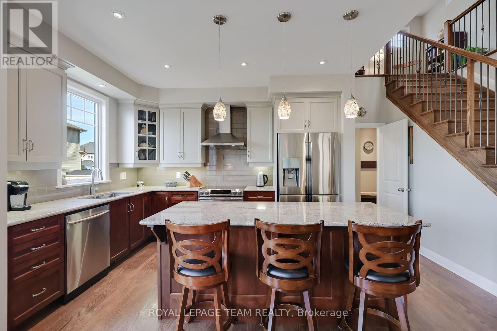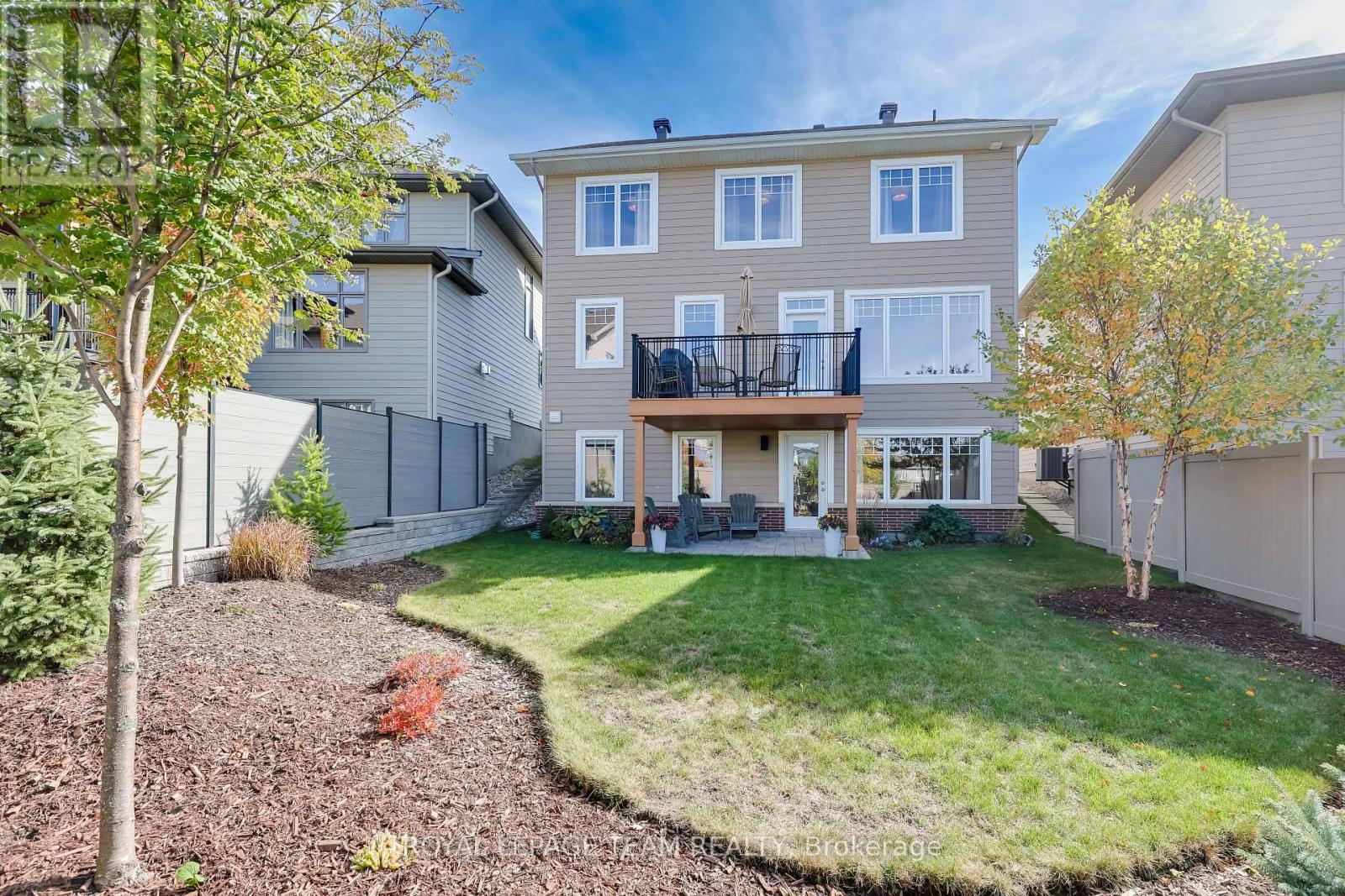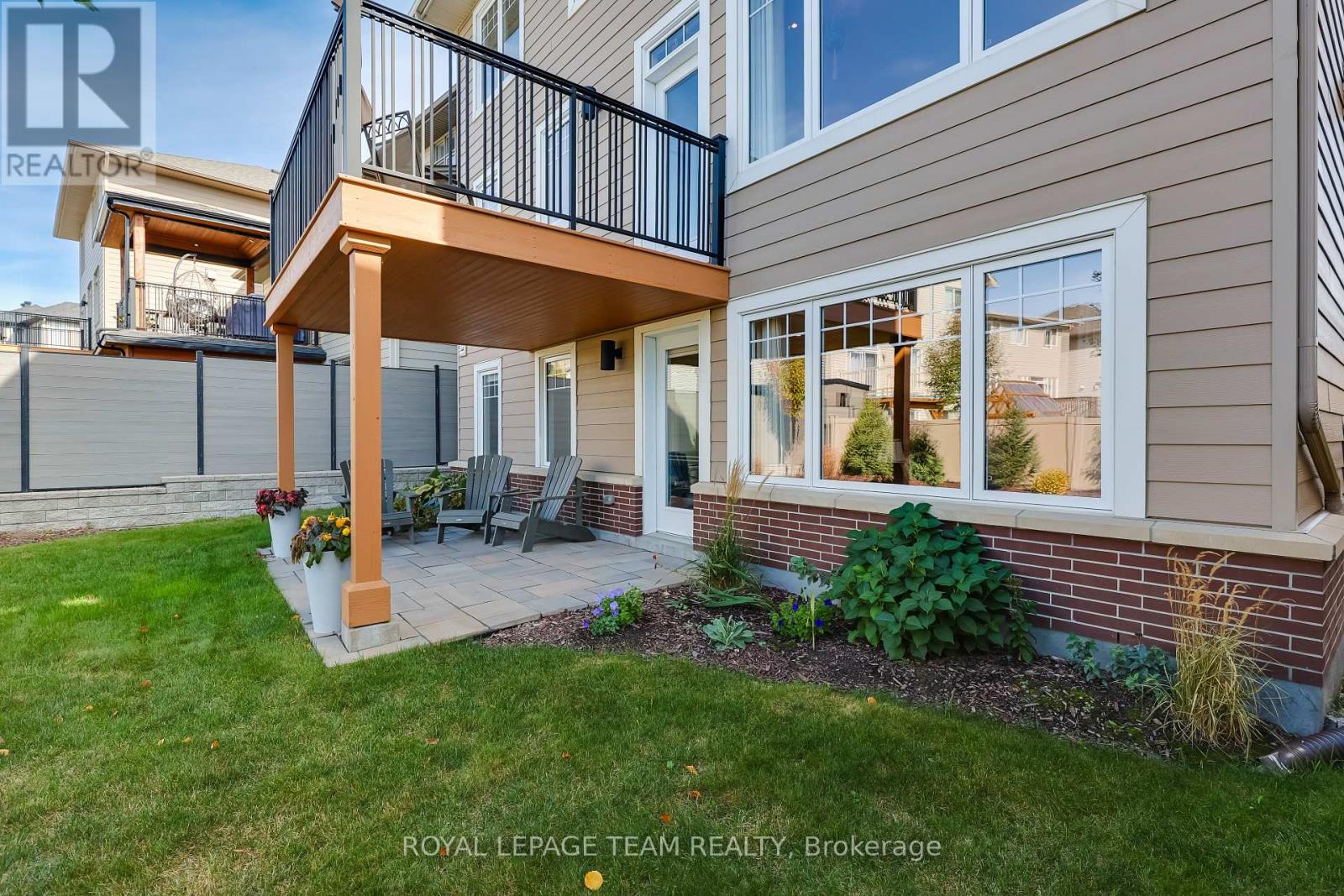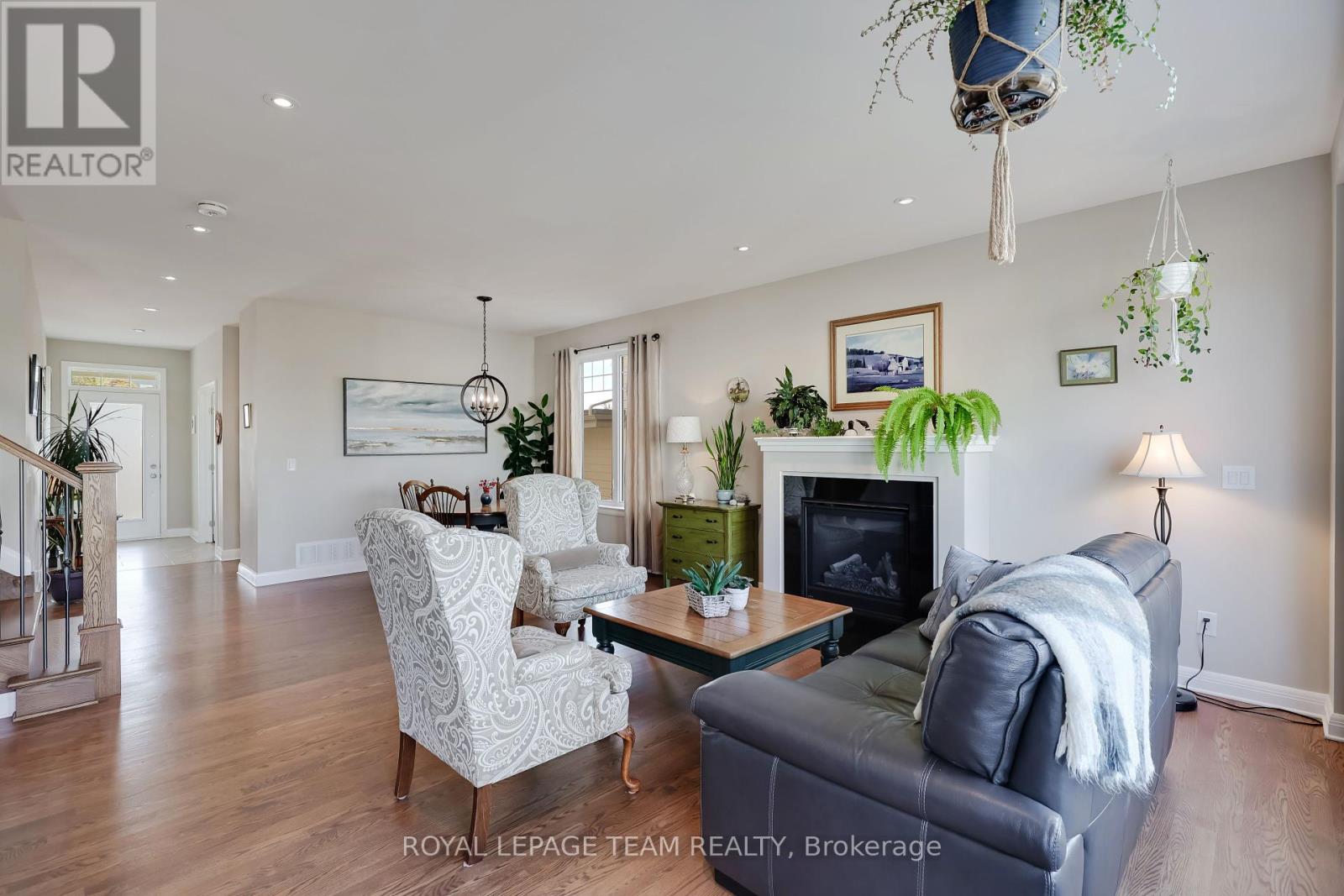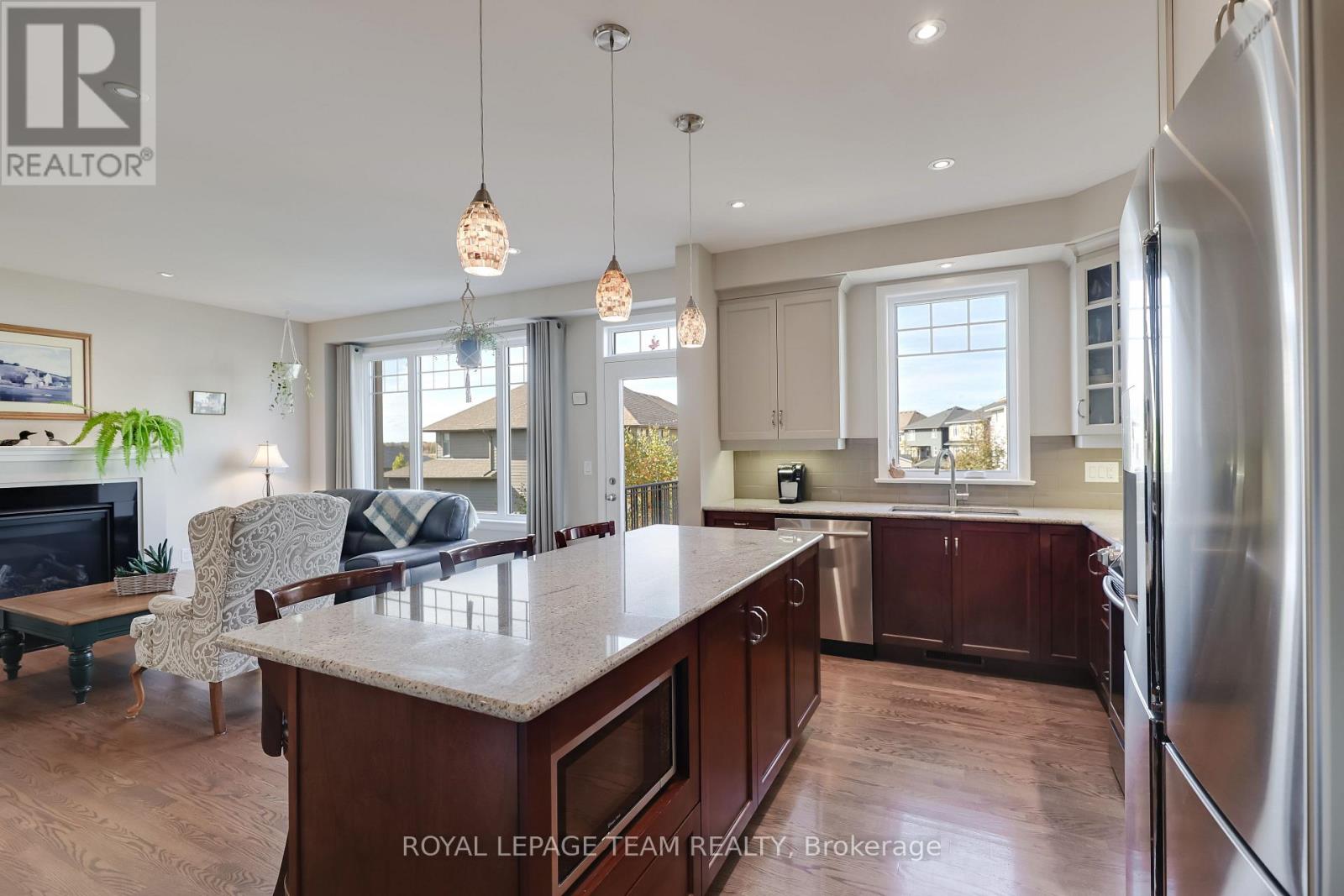 Facing the park and featuring a builder-finished walkout basement, this elegant home is located in the prestigious Kanata Lakes community and has been lovingly maintained by its original owner. Offering nearly 3,000 sq.ft of bright, functional living space, this 4-bedroom, 4-bathroom Uniform-built Griffith model includes a main-floor office and a loft designed for todays modern family. The large front porch overlooks Richardson Heritage Park and playground, creating the perfect spot to relax while watching the kids play. Inside, the open-concept layout highlights oak site-finished hardwood floors, upgraded tiles, and pot lights throughout both levels. The living and dining areas are filled with natural light and anchored by a cozy gas fireplace. The kitchen is a true showpiece, boasting custom Deslaurier cabinetry with crown moulding, granite countertops, a large island with bar seating, premium Samsung appliances, and under-cabinet lighting. Adjacent to the kitchen, the integrated mudroom and laundry area offers a sink, upper cabinets, extra storage, and direct access from the garage for added convenience. Upstairs, the primary suite with raised ceiling and pot lights overlooks the park and features a luxurious 5-piece ensuite with soaker tub, glass shower, double vanities, and custom cabinetry. Three additional well-sized bedrooms, a loft, and a full bath complete the second level. The builder-finished walkout basement provides bright, versatile space perfect for a recreation room, gym, or guest suite, complete with a 3-piece bathroom. Step outside to enjoy a fully landscaped backyard with a lower stone patio, upper deck, perennials, and PVC fencing. Additional upgrades include pot lights, brushed metal stair spindles, granite countertops throughout, and upgraded tiles and cabinetry. Surrounded by top-rated schools, parks, shopping, and the Kanata Tech Hub, this move-in ready home offers luxury, comfort, and an unbeatable location. Rarely Find, Act Fast! (id:49712)
