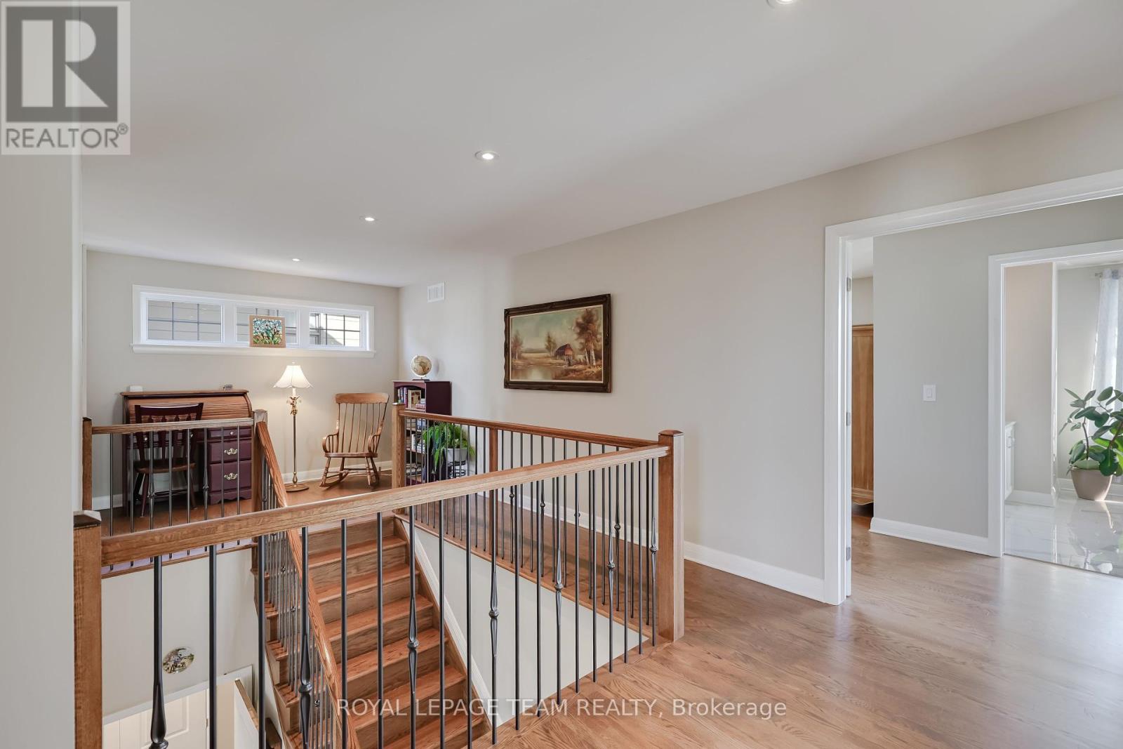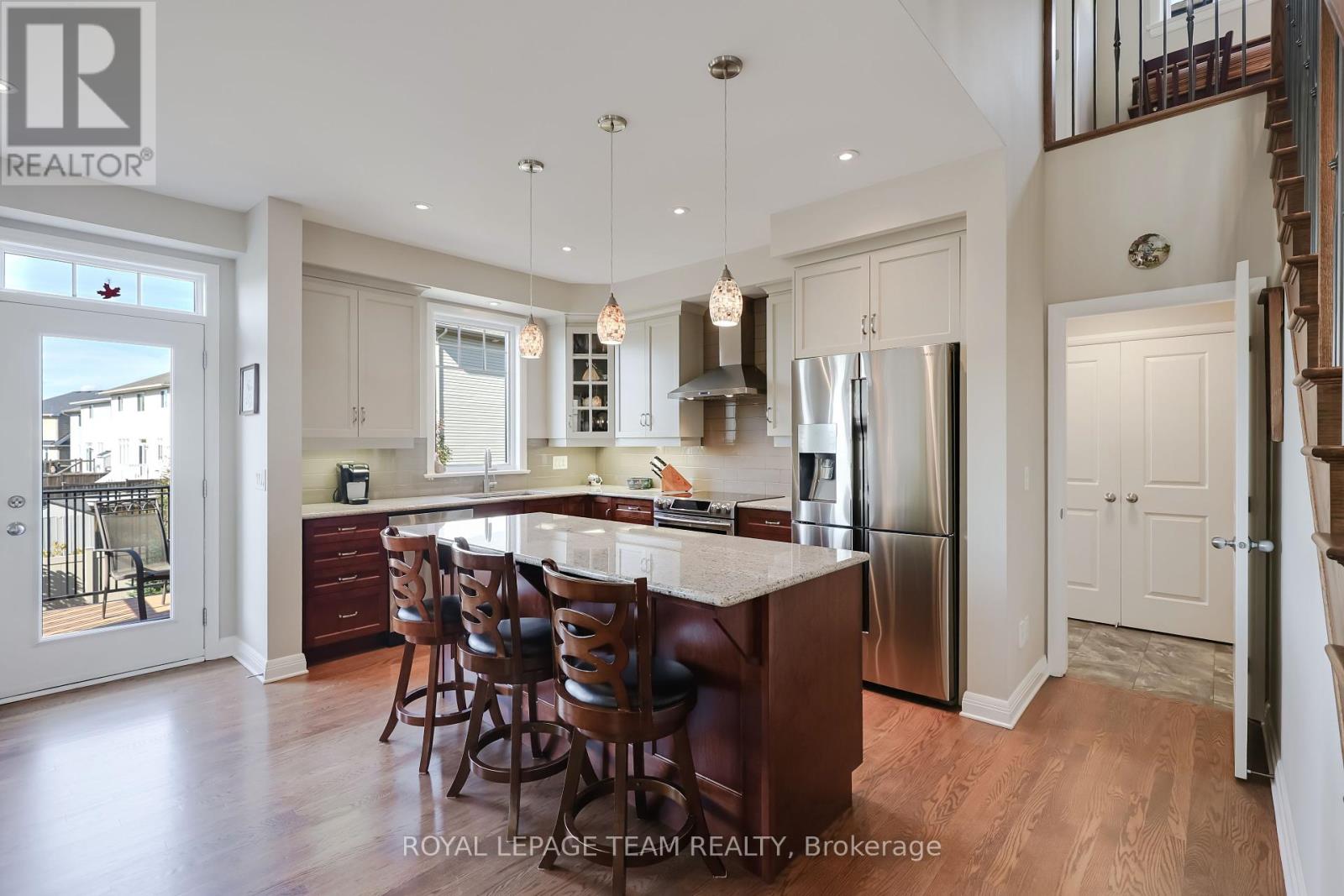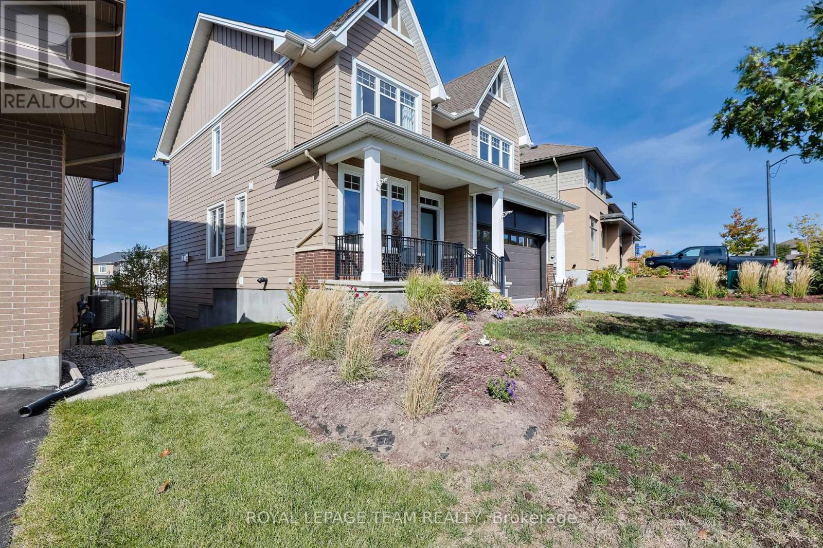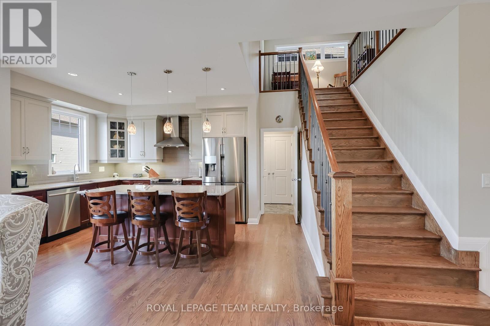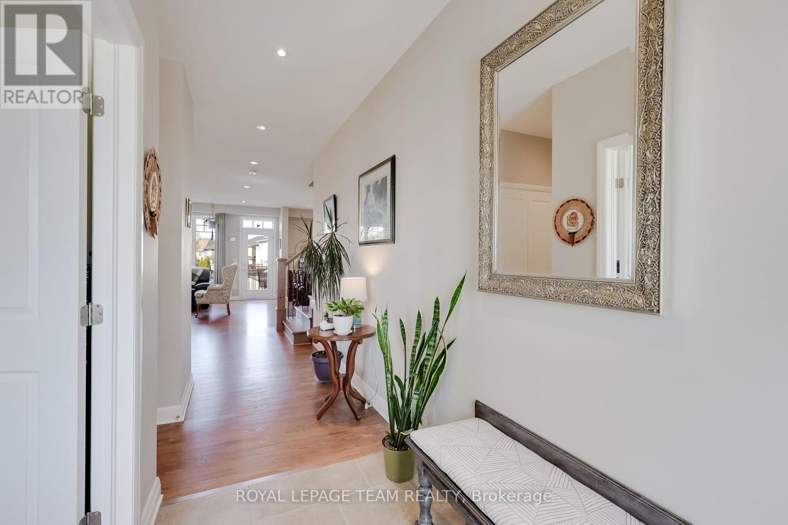 Facing the park and featuring a builder-finished walkout basement, this elegant home is located in the prestigious Kanata Lakes community and has been lovingly maintained by its original owner. Offering nearly 3,000 sq.ft of bright, functional living space, this 4-bedroom, 4-bathroom Uniform-built Griffith model includes a main-floor office and a loft designed for todays modern family. The large front porch overlooks Richardson Heritage Park and playground, creating the perfect spot to relax while watching the kids play. Inside, the open-concept layout highlights oak site-finished hardwood floors, upgraded tiles, and pot lights throughout both levels. The living and dining areas are filled with natural light and anchored by a cozy gas fireplace. The kitchen is a true showpiece, boasting custom Deslaurier cabinetry with crown moulding, granite countertops, a large island with bar seating, premium Samsung appliances, and under-cabinet lighting. Adjacent to the kitchen, the integrated mudroom and laundry area offers a sink, upper cabinets, extra storage, and direct access from the garage for added convenience. Upstairs, the primary suite with raised ceiling and pot lights overlooks the park and features a luxurious 5-piece ensuite with soaker tub, glass shower, double vanities, and custom cabinetry. Three additional well-sized bedrooms, a loft, and a full bath complete the second level. The builder-finished walkout basement provides bright, versatile space perfect for a recreation room, gym, or guest suite, complete with a 3-piece bathroom. Step outside to enjoy a fully landscaped backyard with a lower stone patio, upper deck, perennials, and PVC fencing. Additional upgrades include pot lights, brushed metal stair spindles, granite countertops throughout, and upgraded tiles and cabinetry. Surrounded by top-rated schools, parks, shopping, and the Kanata Tech Hub, this move-in ready home offers luxury, comfort, and an unbeatable location. Rarely Find, Act Fast! (id:49712)