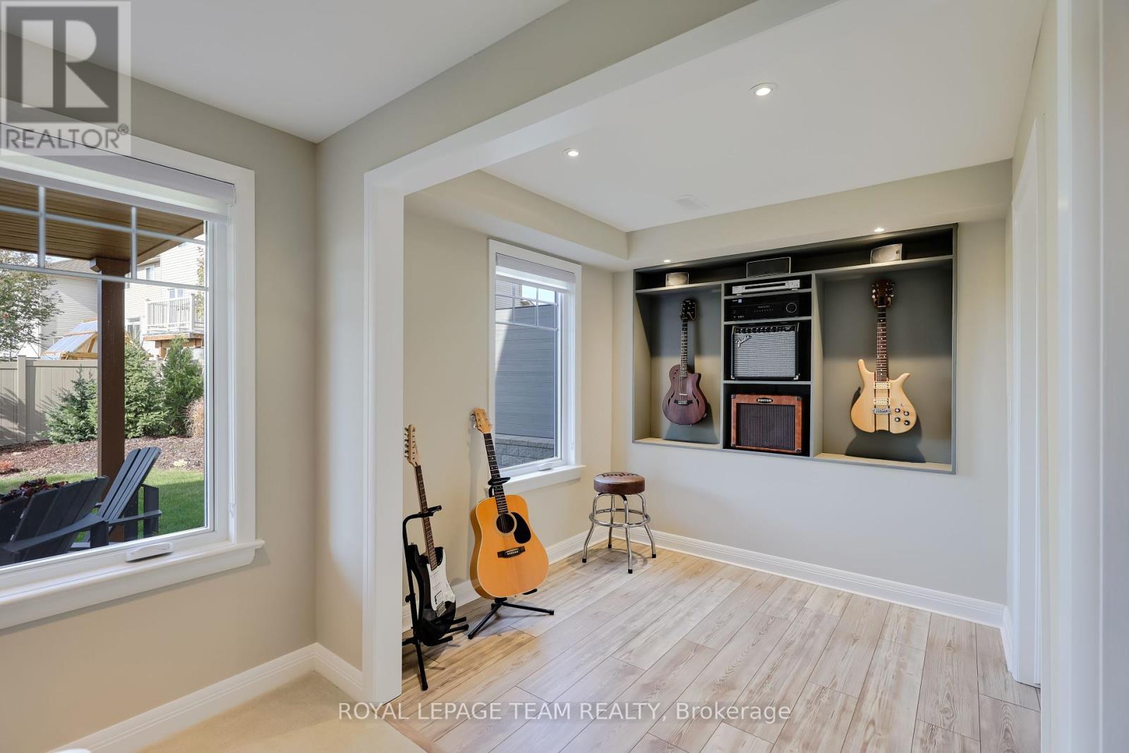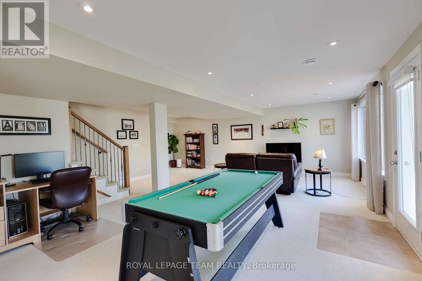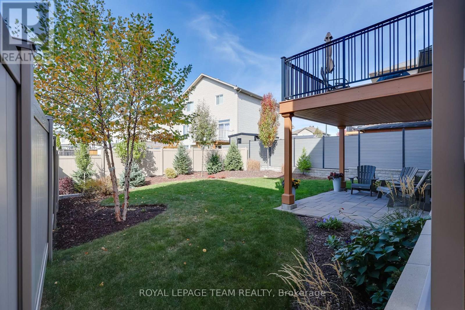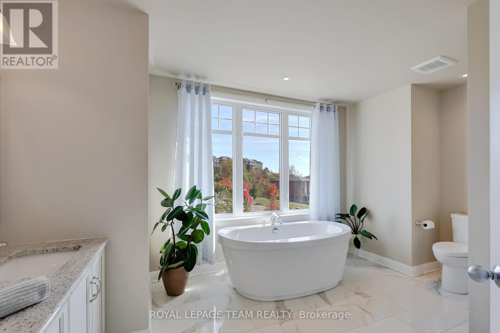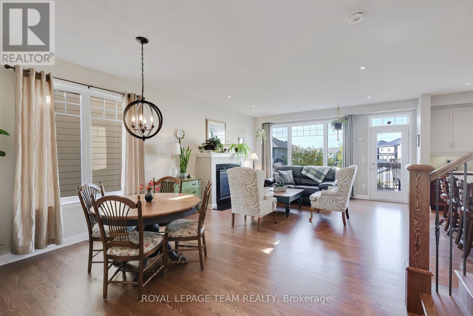 Facing the park and featuring a builder-finished walkout basement, this elegant home is located in the prestigious Kanata Lakes community and has been lovingly maintained by its original owner. Offering nearly 3,000 sq.ft of bright, functional living space, this 4-bedroom, 4-bathroom Uniform-built Griffith model includes a main-floor office and a loft designed for todays modern family. The large front porch overlooks Richardson Heritage Park and playground, creating the perfect spot to relax while watching the kids play. Inside, the open-concept layout highlights oak site-finished hardwood floors, upgraded tiles, and pot lights throughout both levels. The living and dining areas are filled with natural light and anchored by a cozy gas fireplace. The kitchen is a true showpiece, boasting custom Deslaurier cabinetry with crown moulding, granite countertops, a large island with bar seating, premium Samsung appliances, and under-cabinet lighting. Adjacent to the kitchen, the integrated mudroom and laundry area offers a sink, upper cabinets, extra storage, and direct access from the garage for added convenience. Upstairs, the primary suite with raised ceiling and pot lights overlooks the park and features a luxurious 5-piece ensuite with soaker tub, glass shower, double vanities, and custom cabinetry. Three additional well-sized bedrooms, a loft, and a full bath complete the second level. The builder-finished walkout basement provides bright, versatile space perfect for a recreation room, gym, or guest suite, complete with a 3-piece bathroom. Step outside to enjoy a fully landscaped backyard with a lower stone patio, upper deck, perennials, and PVC fencing. Additional upgrades include pot lights, brushed metal stair spindles, granite countertops throughout, and upgraded tiles and cabinetry. Surrounded by top-rated schools, parks, shopping, and the Kanata Tech Hub, this move-in ready home offers luxury, comfort, and an unbeatable location. Rarely Find, Act Fast! (id:49712)