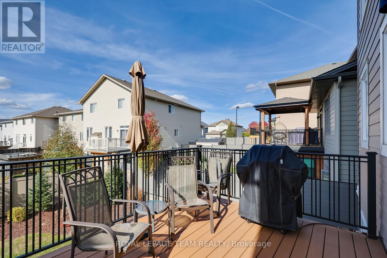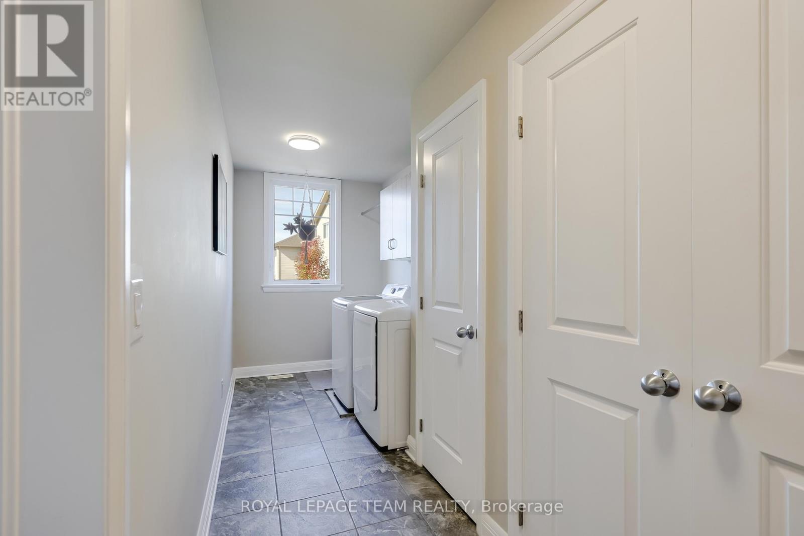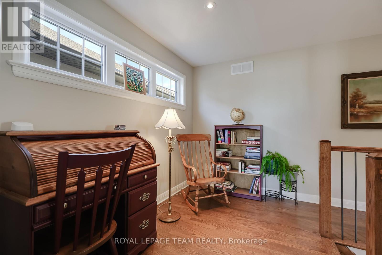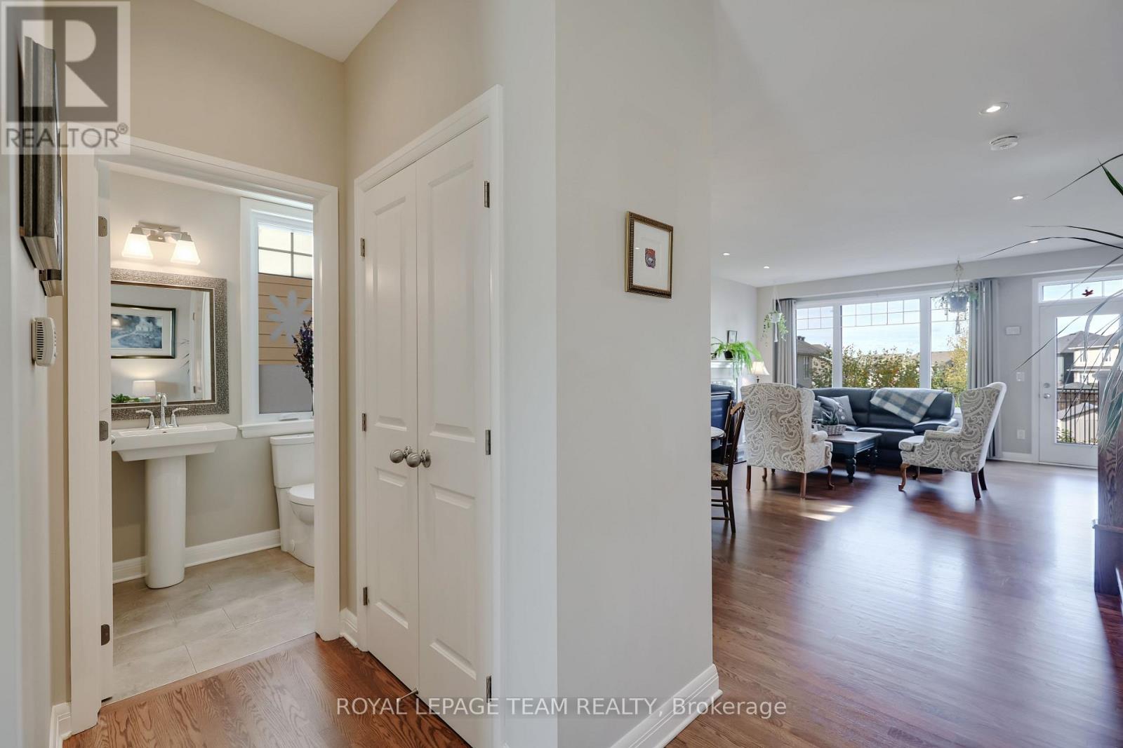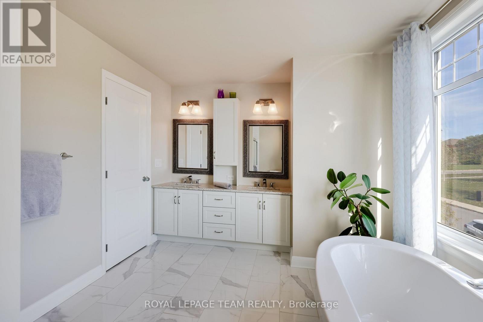 Facing the park and featuring a builder-finished walkout basement, this elegant home is located in the prestigious Kanata Lakes community and has been lovingly maintained by its original owner. Offering nearly 3,000 sq.ft of bright, functional living space, this 4-bedroom, 4-bathroom Uniform-built Griffith model includes a main-floor office and a loft designed for todays modern family. The large front porch overlooks Richardson Heritage Park and playground, creating the perfect spot to relax while watching the kids play. Inside, the open-concept layout highlights oak site-finished hardwood floors, upgraded tiles, and pot lights throughout both levels. The living and dining areas are filled with natural light and anchored by a cozy gas fireplace. The kitchen is a true showpiece, boasting custom Deslaurier cabinetry with crown moulding, granite countertops, a large island with bar seating, premium Samsung appliances, and under-cabinet lighting. Adjacent to the kitchen, the integrated mudroom and laundry area offers a sink, upper cabinets, extra storage, and direct access from the garage for added convenience. Upstairs, the primary suite with raised ceiling and pot lights overlooks the park and features a luxurious 5-piece ensuite with soaker tub, glass shower, double vanities, and custom cabinetry. Three additional well-sized bedrooms, a loft, and a full bath complete the second level. The builder-finished walkout basement provides bright, versatile space perfect for a recreation room, gym, or guest suite, complete with a 3-piece bathroom. Step outside to enjoy a fully landscaped backyard with a lower stone patio, upper deck, perennials, and PVC fencing. Additional upgrades include pot lights, brushed metal stair spindles, granite countertops throughout, and upgraded tiles and cabinetry. Surrounded by top-rated schools, parks, shopping, and the Kanata Tech Hub, this move-in ready home offers luxury, comfort, and an unbeatable location. Rarely Find, Act Fast! (id:49712)