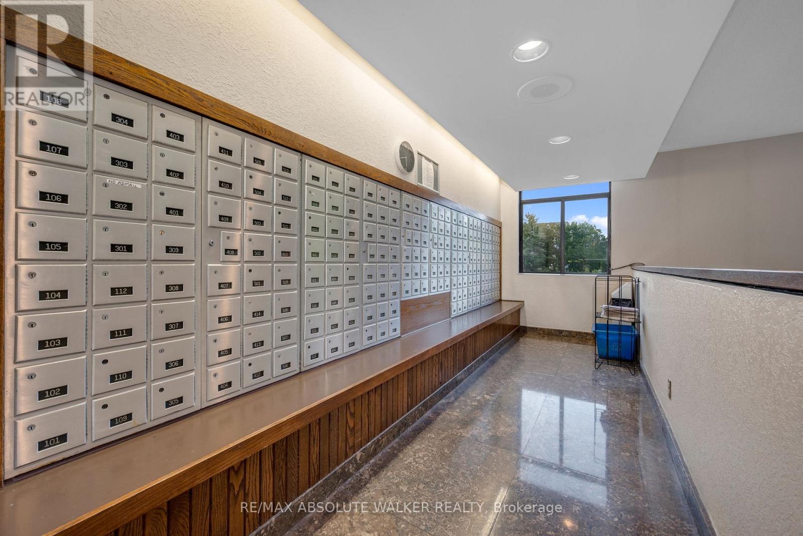 Welcome to the highly sought after Marina Bay, offering comfort, convenience, and lifestyle. This spacious 2-bedroom, 2-bathroom corner unit condo is located on the main level, providing easy, stair-free access. The bright open layout features hardwood flooring throughout the living and dining areas, complemented by a sunlit open concept sunroom area and large windows. The beautifully updated kitchen includes butcher block counters, stainless steel appliances, and extended cabinetry for added storage. The primary suite boasts double closets and a private two-piece ensuite, while the main bathroom has been completely modernized with a glass walk-in shower and tiled surround. A generous second bedroom, ample closet space, and the practicality of in-unit laundry with a stackable washer and dryer complete the interior. Marina Bay residents enjoy exceptional amenities: a rooftop patio which is currently being completely redesigned for modern appeal, outdoor pool, fitness area, squash courts, sauna, indoor whirlpool, party room, billiards, library, and secure underground parking. This condo offers easy access to shopping, dining, public transit, HWY 417, and the scenic paths and waterfront at Britannia Beach. (id:49712)