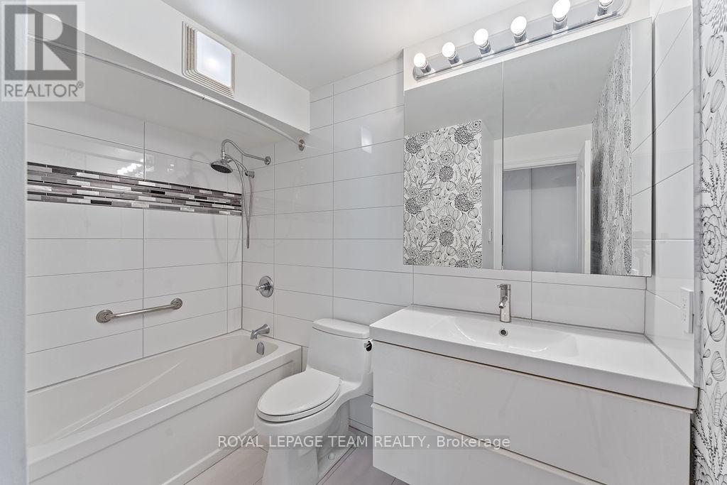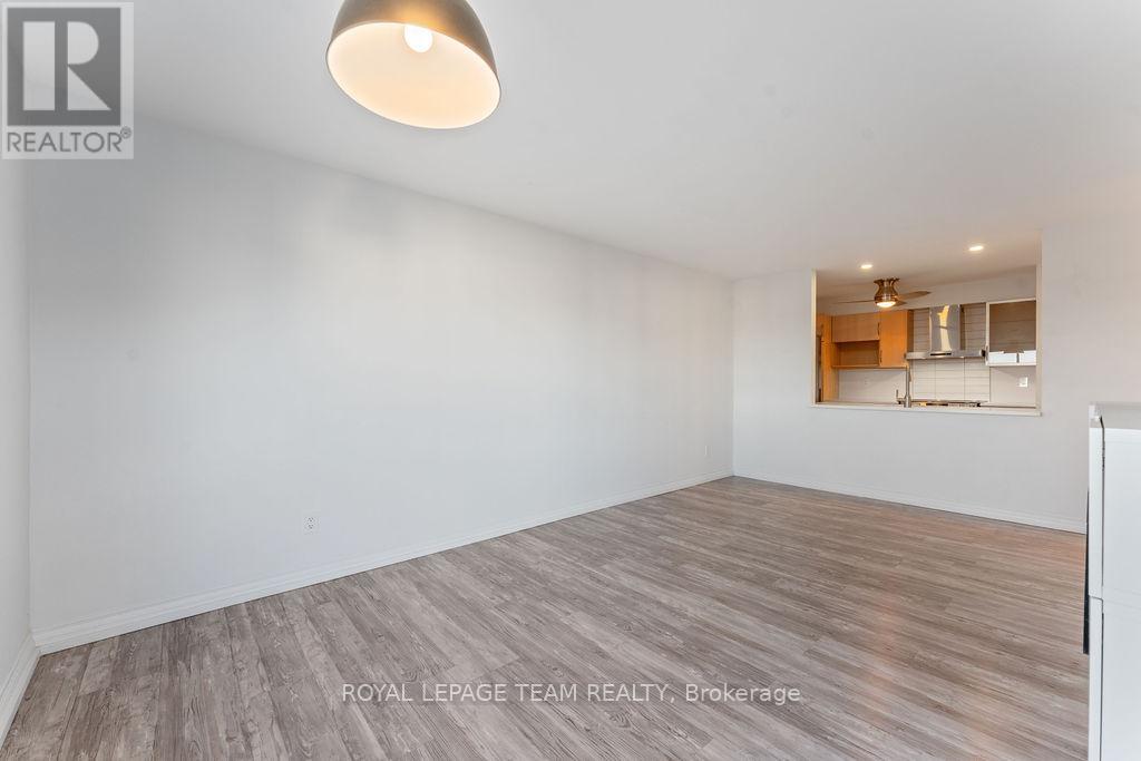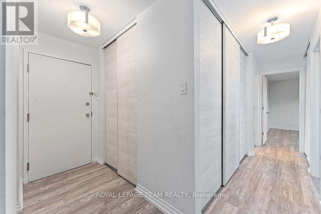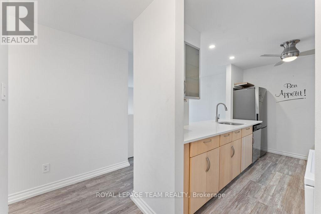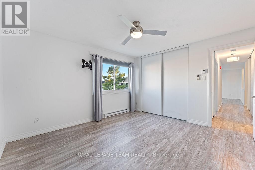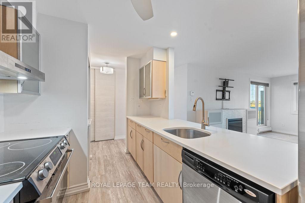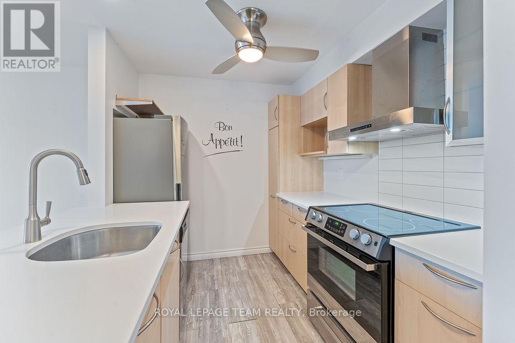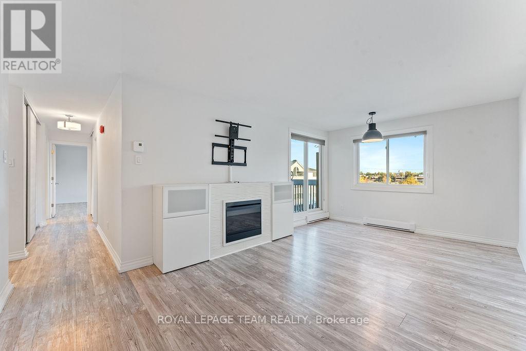 Stylish, sun-filled top-floor condo in quiet 4 storey building with elevator in Viewmount Woods! This beautifully updated unit offers the perfect combination of modern comfort and tranquillity. Enjoy a fully equipped custom galley-style kitchen with quartz countertops and smart storage, flowing seamlessly into a bright living and dining room combination featuring an electric fireplace. The unit includes two spacious bedrooms, a spa-inspired bathroom with heated tile floors, in-unit laundry, and luxury vinyl/tile flooring throughout. Step out onto the oversized balcony to take in unobstructed views of the scenic Nepean Creek trails. Additional features include one assigned parking spot and ample in-unit storage. Perfect for couples, professionals, or downsizers seeking comfort, convenience, and a peaceful setting. Located just steps from transit, shops, parks, and schools. Top-rated schools nearby include Merivale High School with the International Baccalaureate (IB) program and RCMP headquarters on Merivale Road. Immediate occupancy available. No pets and no smoking in the building, per condo rules. (id:49712)