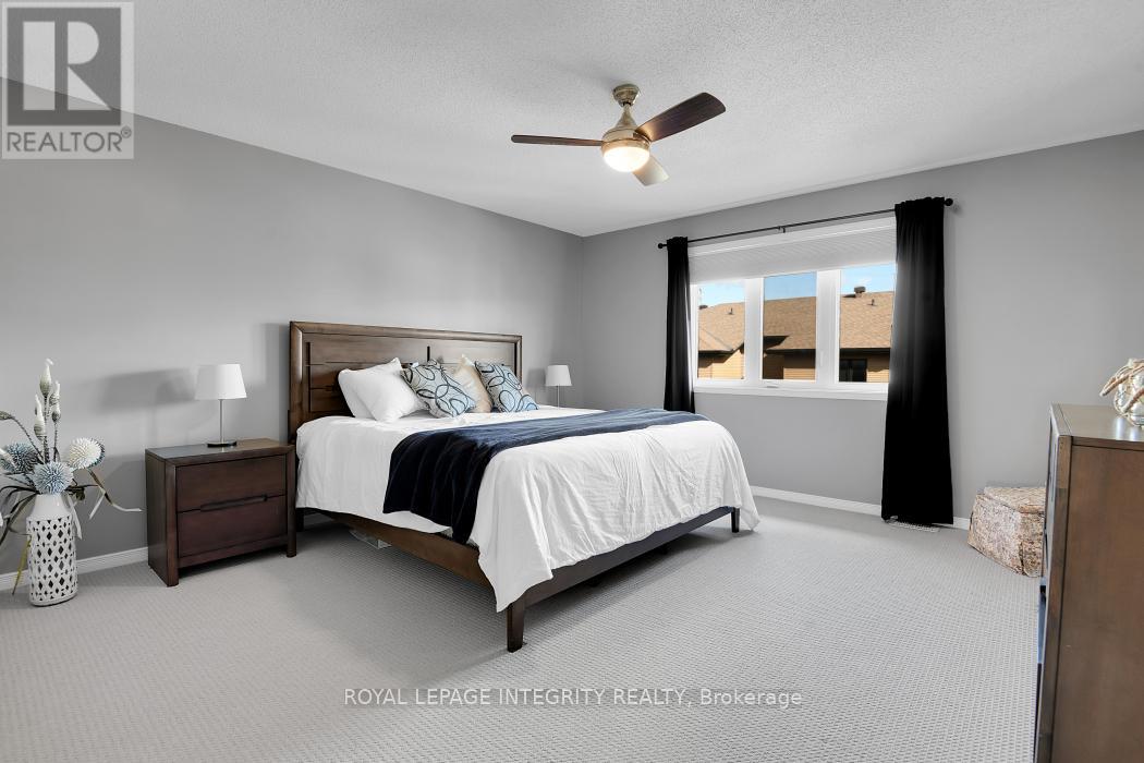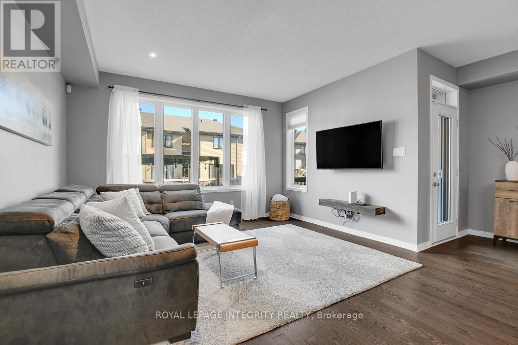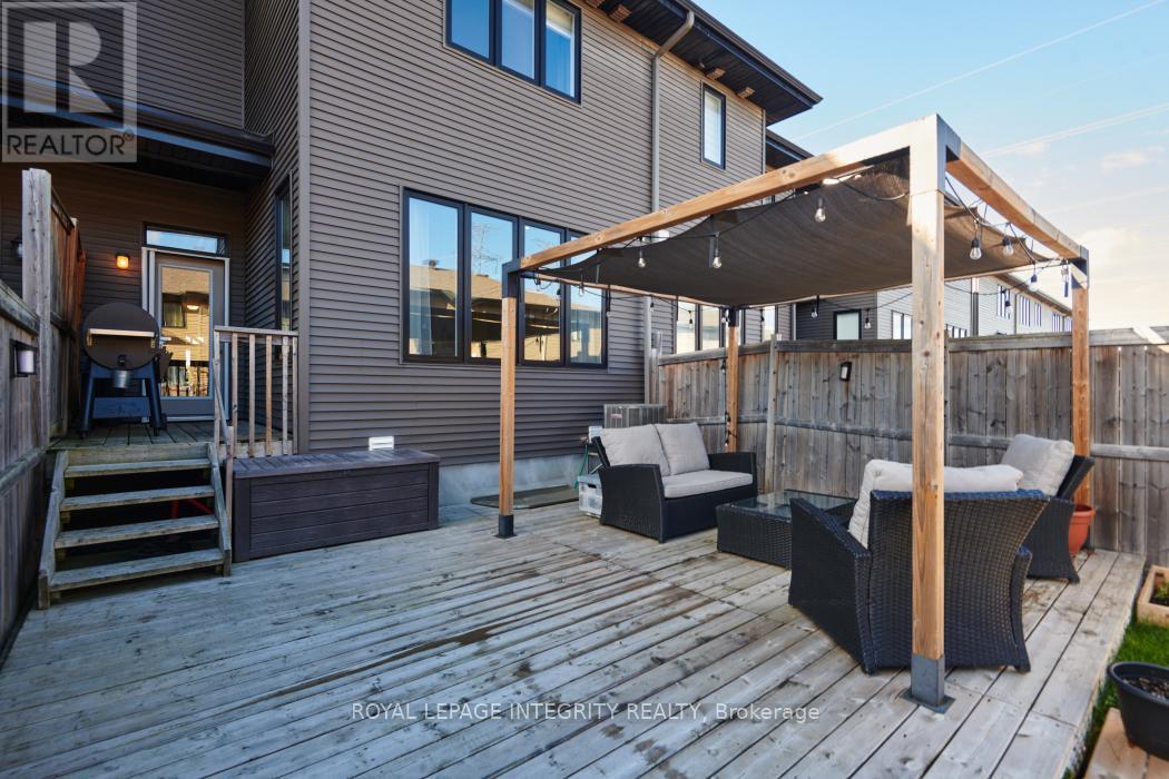 Nestled in the heart of Stittsville's Blackstone community, this spacious 3 bedroom, 2.5 bathroom townhome offers nearly 1,800 sq. ft. of beautifully designed living space. The open concept main floor features 9-foot ceilings, gleaming hardwood floors, and a modern kitchen with quartz countertops, stainless steel appliances, subway tile backsplash, and a walk-in pantry perfect for family living and entertaining. Upstairs, the primary suite boasts a walk-in closet and a luxurious ensuite with double vanity, soaker tub, and glass shower. Two additional bedrooms share a stylish main bath, while a convenient laundry room adds extra functionality. The finished basement provides a spacious family room ideal for movie nights, plus a large storage area. Step outside to your private, low maintenance backyard retreat with a two-tier deck and pergola, perfect for entertaining or relaxing outdoors. Located just steps from schools, parks, the Trans Canada Trail, and shopping. This beautiful Cardel home offers comfort, convenience, and community. Don't miss your chance to make it yours! 24 hours irrevocable on all offers. (id:49712)