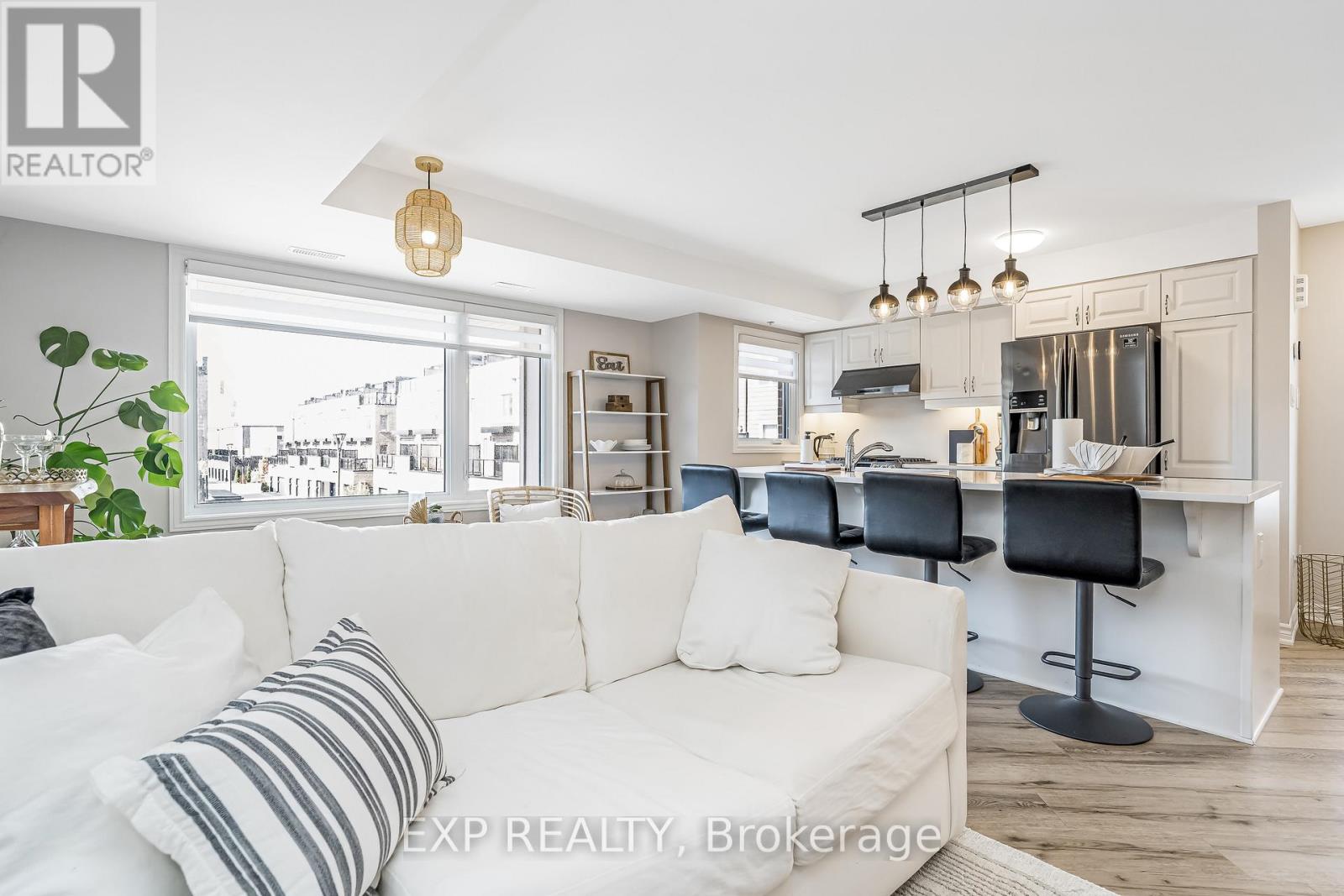 Welcome to your new happy place, a bright, modern 2019 2 bed, 2 bath upper-level corner unit in one of Ottawa's most vibrant communities. Steps from Parks, Nature Trails & Paths on Ottawa River, Montfort, CSE, CSIS, CMHC, LRT, Costco, plus just minutes to prestigious private schools: Ashbury College and Elmwood School. With over $60K in upgrades, this home features smooth ceilings, custom lighting, upgraded luxury vinyl plank flooring, and a sun-filled open layout. The kitchen shines with quartz counters, pristine white cabinetry, upgraded charcoal matching appliances, and a spacious eat-at island. Upstairs, enjoy a private balcony off the primary bedroom, a versatile second bedroom with TONS of light (perfect as gym, studio, office or warm bedroom), and a sleek full bath with his and hers sinks set in a quartz counter and complimentary gleaming tile work. Top it all off with your own private rooftop terrace that once you step into, the views of the skyline will make you fall in love. The terrace is ideal for BBQ socials (equipped with gas bbq hookup) , sun-soaked peaceful afternoons, or starry evenings. If you haven't been to Water Ridge Village, this will be your perfect intro. Common Element fees include: Building Insurance, Garbage Removal, General Maintenance and Repair, Landscape, Management Fee, Reserve Fund Allocation, Snow Removal (id:49712)
