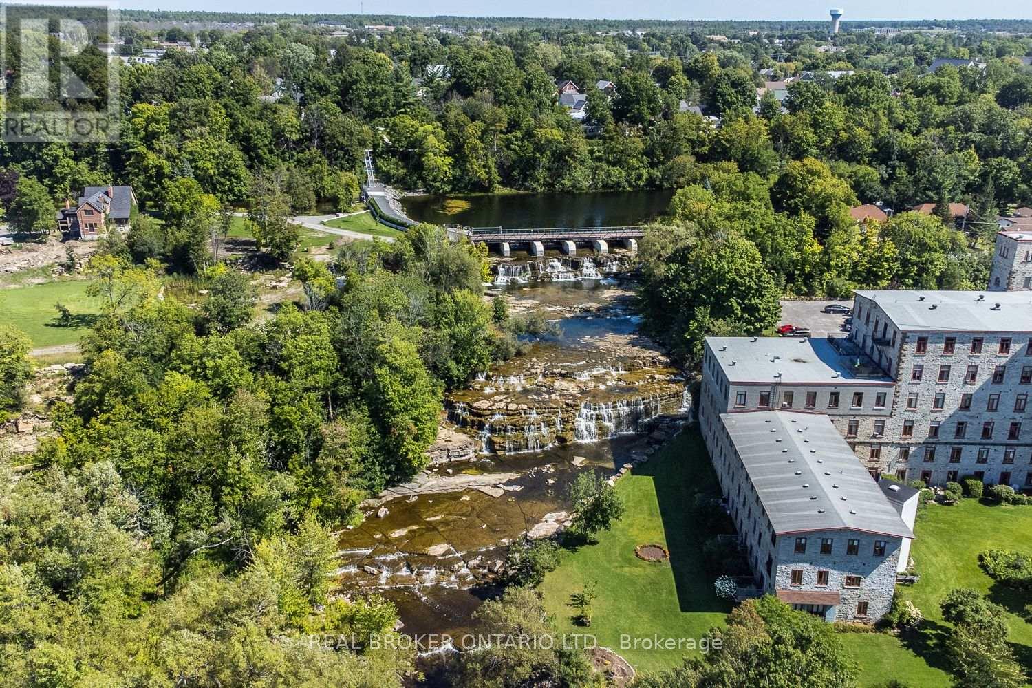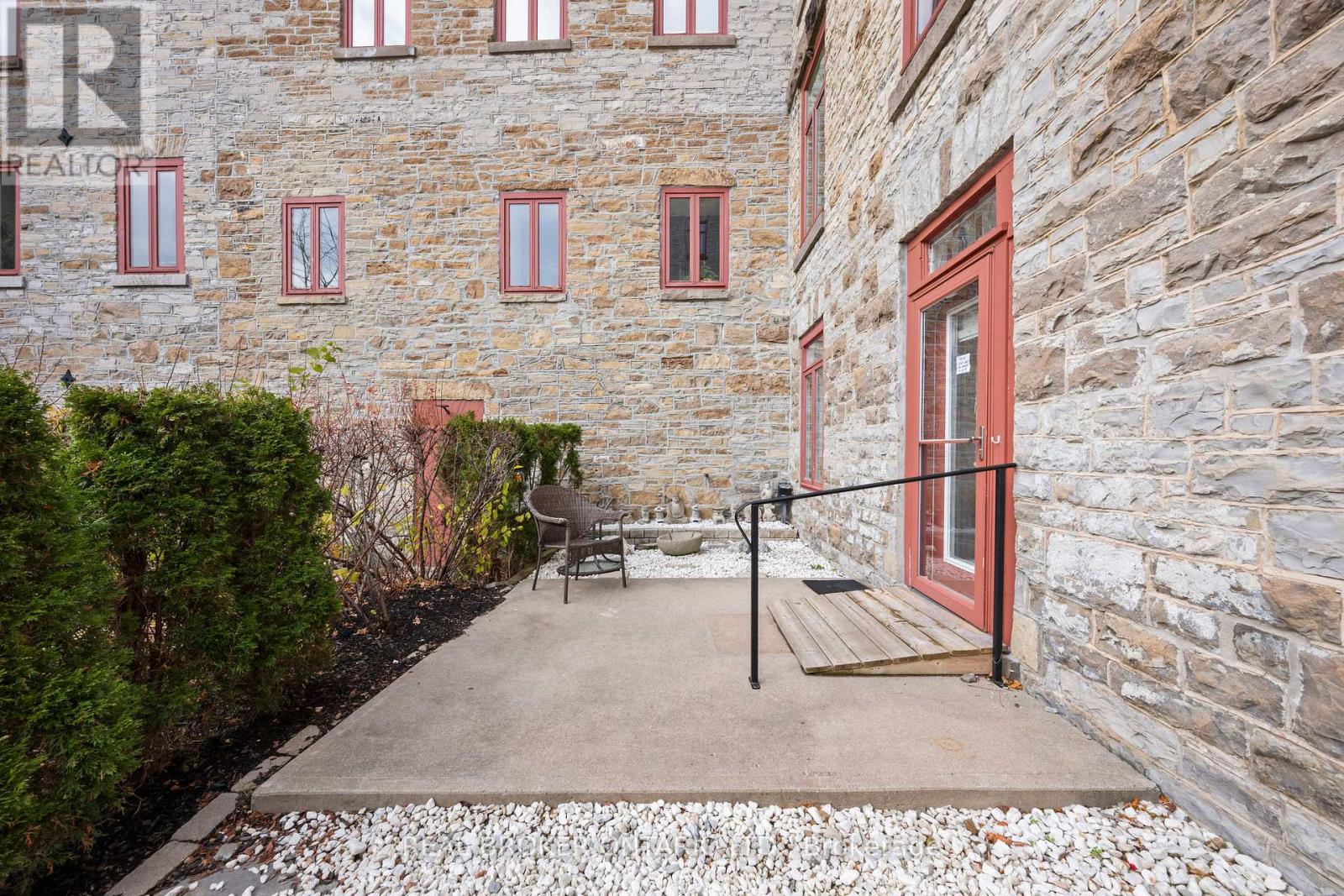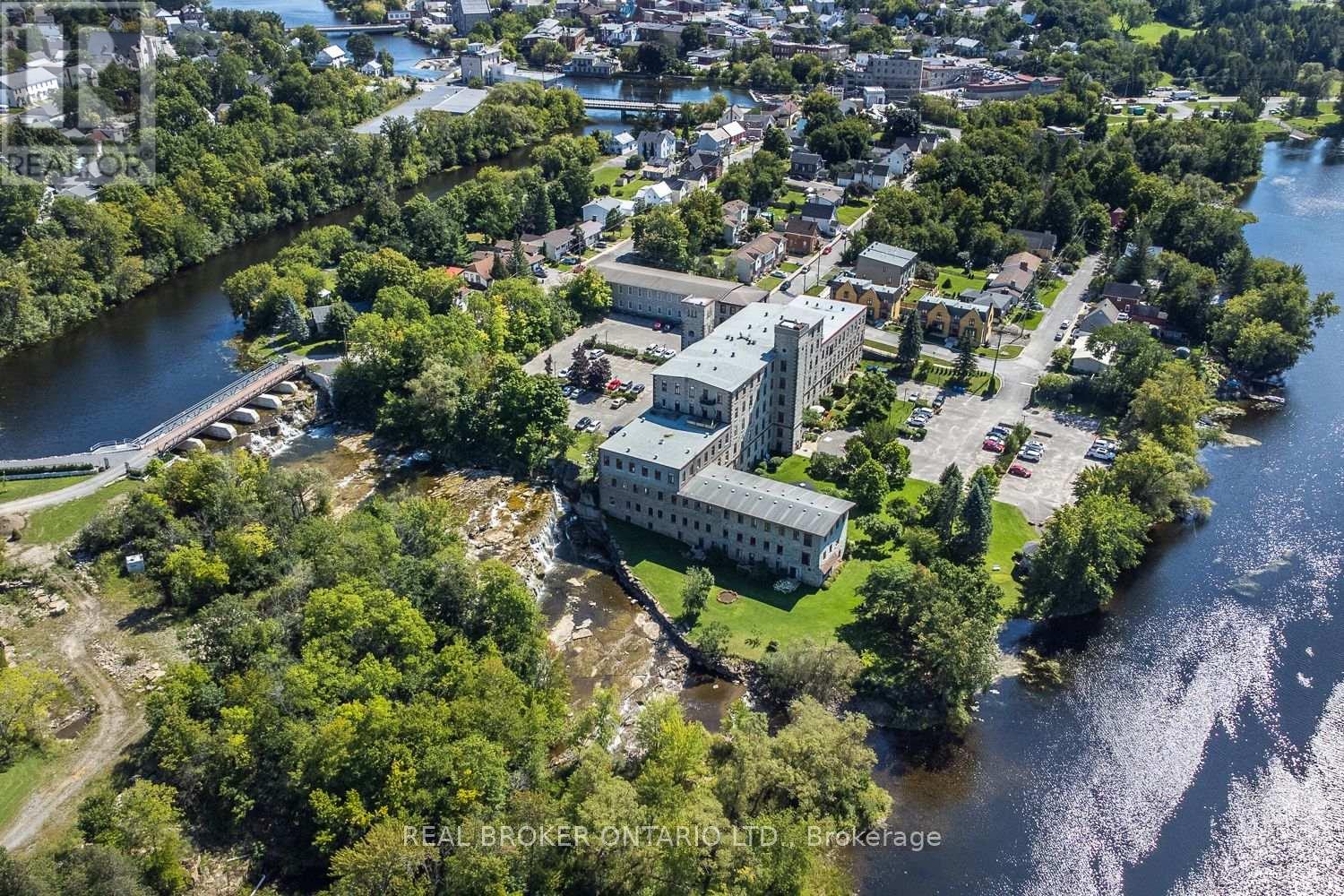 $864.29 MonthlyWelcome to Millfall, a beautifully restored 1800s woollen mill set directly on the banks of the Mississippi River, with a stunning waterfall running alongside the building. This iconic landmark blends heritage stonework and industrial character with boutique condominium living, creating one of the most unique residential settings in Almonte.This spacious one bedroom plus den condo is one of the building's most desirable offerings. Freshly painted and filled with natural light, the home features exposed brick and stone that highlight its rich mill history. The updated kitchen includes stainless steel appliances, stone countertops, and a functional layout that opens into the main living space. Large windows frame peaceful views of the Mississippi River, offering a calming backdrop from both the living room and bedroom.What truly sets this residence apart is the private main floor walkout patio. Only a small number of suites in Millfall enjoy direct patio access overlooking the river, creating an effortless indoor outdoor connection rarely available in the building. Lovingly maintained by its original owner since the building's conversion, this is the first time the unit has been offered for sale. The combination of character, natural light, and thoughtful updates makes this home stand out among the most special offerings in Millfall.Residents enjoy exceptional amenities including a rentable guest suite, kayak storage, outdoor gazebo by the water, common and recreation rooms, a fitness area, library, workshop, and additional storage. The community is known for its quiet atmosphere, well kept grounds, and appreciation for the building's heritage. Steps from Almonte's vibrant downtown, this residence offers an elevated lifestyle in one of the town's most cherished buildings. (id:49712)