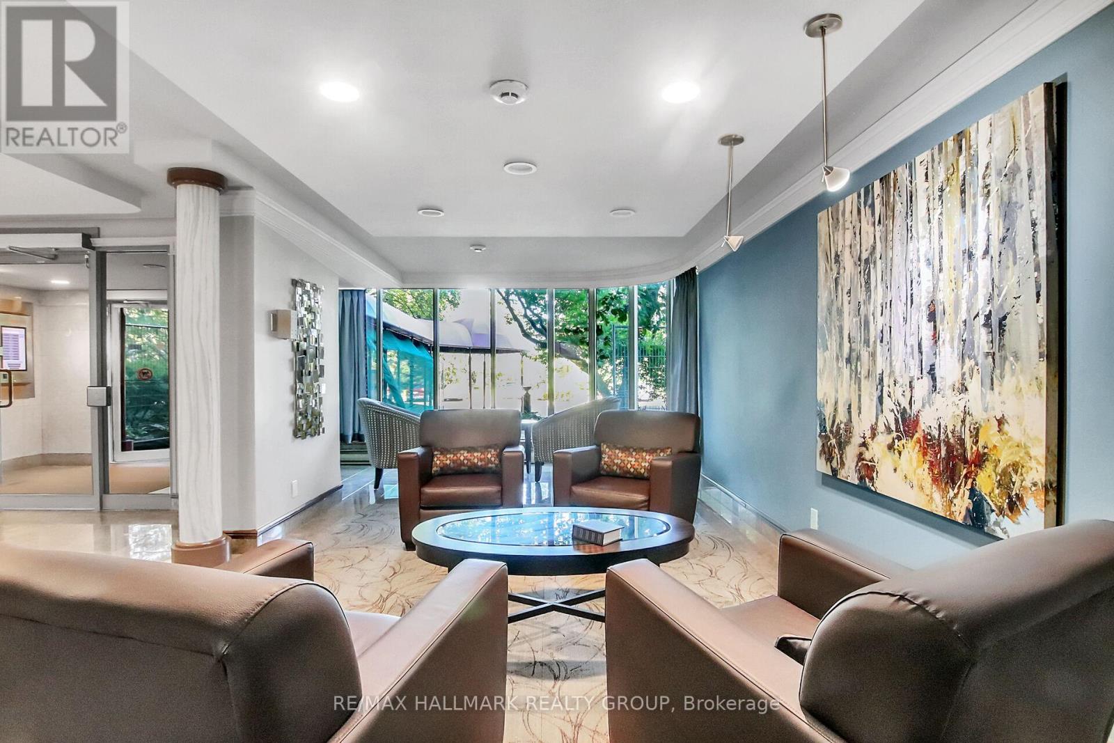 Enjoy this expansive corner condo at the highly sought-after Royal Palm, 100 Grant Carman Drive.This is one of the most popular layouts in the building, featuring wrap-around windows that flood the space with natural light. Located in desirable Parkwood Hills, you'll love the proximity to Dows Lake, shopping, restaurants, transit, and all the conveniences that make this such a great community.The open-concept living and dining room features hardwood floors and wrap-around windows overlooking peaceful greenspace, plus a French door leading to a covered balcony. The chef's kitchen offers pot drawers, abundant cabinetry, plenty of counter space, pull-out shelving, a glass display cabinet, a built-in desk/office area, and sliding glass doors to the balcony. Additional features include in-unit laundry with a stackable washer and dryer, a primary bedroom with walk-in closet and 3-piece ensuite, and a second bedroom with hardwood flooring and an open closet. The West Park is set on over 4 acres of beautifully landscaped grounds with walking paths, benches, and patio areas. Residents enjoy a full range of amenities including a gym, sauna, men's and women's change rooms, indoor pool with outdoor patio and BBQ area, party room with kitchen, library, bicycle storage, and underground parking with a car wash bay. Don't miss this spacious and sun-filled condo. A rare find in one of Ottawa's most desirable communities! (id:49712)