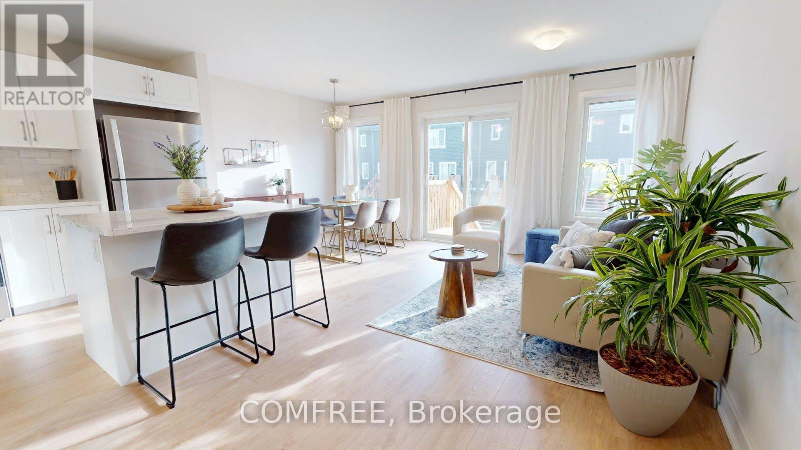Upgraded end-unit townhome in the Bellamy Farms community. This 3-bedroom, 3-bath home with finished basement offers modern finishes and bright living space across three levels. The main floor features an open-concept living and dining area with large windows providing ample natural light. The kitchen includes stainless steel appliances, a custom stone-tiled backsplash, a center island with built-in outlets, and a pull-down faucet. Upstairs offers a spacious primary suite with walk-in closet and ensuite, plus two additional bedrooms and a laundry room with custom cabinetry and marble folding surface. The finished basement with large windows adds flexible living space and includes a separate storage room. Window coverings, mirrors in all baths, and privacy film on the front door are included. Walking distance to shops, trails, eateries, schools, and transit, and just minutes to parks, downtown Smiths Falls, and the Rideau Canal. (id:49712)