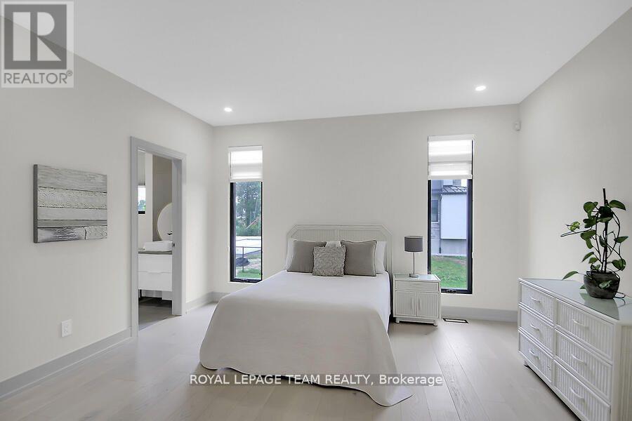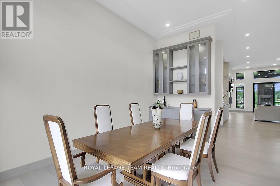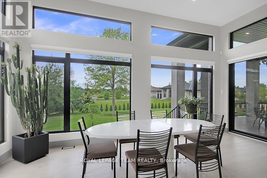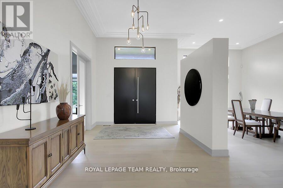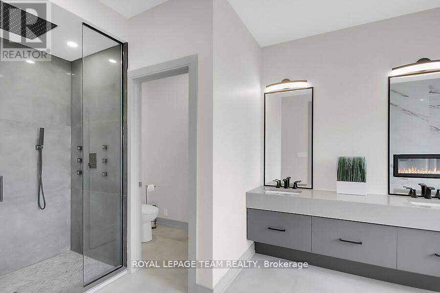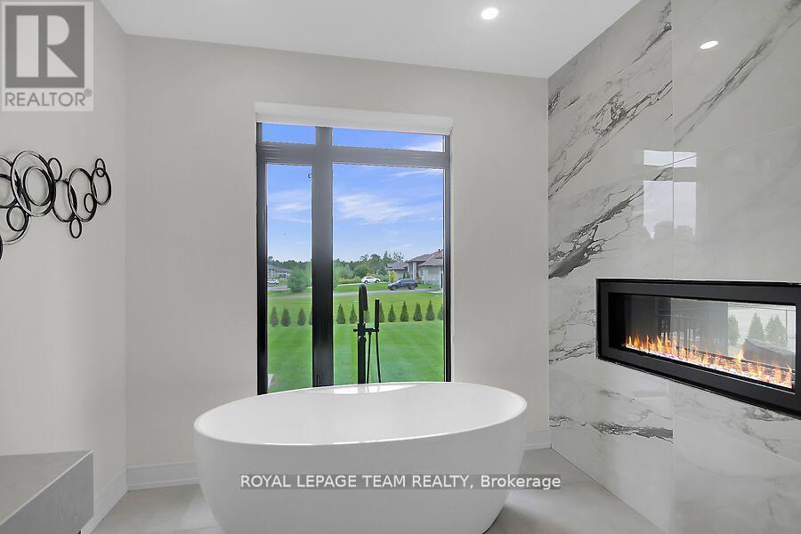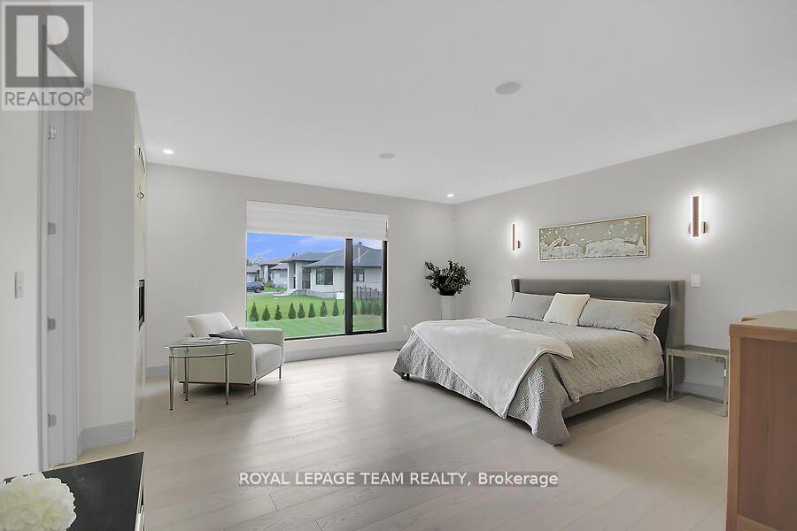 This expansive custom-built bungalow offers 6 bedrooms and 5 bathrooms, showcasing elegant wide plank oak hardwood flooring, oversized windows, and exquisite craftsmanship throughout. Designed with modern living in mind, the open-concept layout welcomes you through a stylish foyer into a grand living room that seamlessly extends to a covered veranda, complete with a cozy wood-burning fireplace. The chef-inspired kitchen is a true centrepiece, featuring a stunning waterfall quartz island with generous seating, quartz backsplash, gas cooktop, and a bright breakfast nook perfectly complemented by a separate formal dining room for more refined gatherings.The luxurious primary suite is a private retreat, boasting a spacious walk-in closet with custom vanity, a 5-piece ensuite with double sinks, a glass-enclosed shower, freestanding soaker tub, and a gas fireplace for added comfort. Three additional bedrooms are located on the main floor, two of which offer private en-suites. The fully finished lower level features heated floors throughout, three large bedrooms, a full bathroom, and a vast recreational space with endless potential for entertainment or relaxation. Additional highlights include a heated 3-car attached garage with soaring 20-ft ceilings and a fully integrated smart home system with wireless control and state-of-the-art 5-zone wireless speakers. Please note that lower level rooms have been virtually staged. (id:49712)