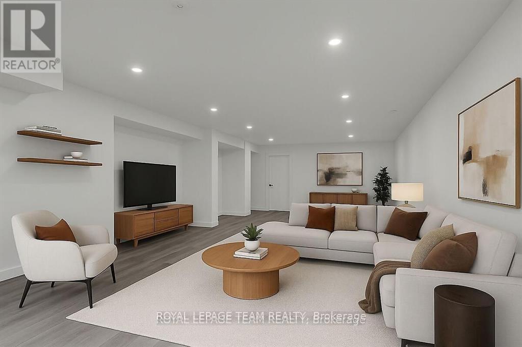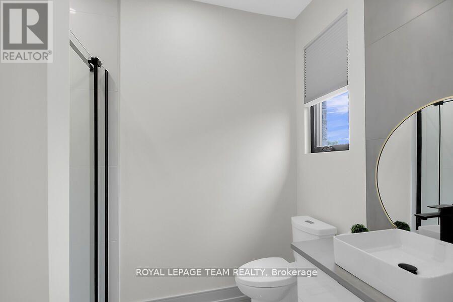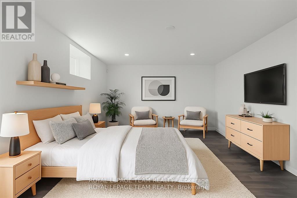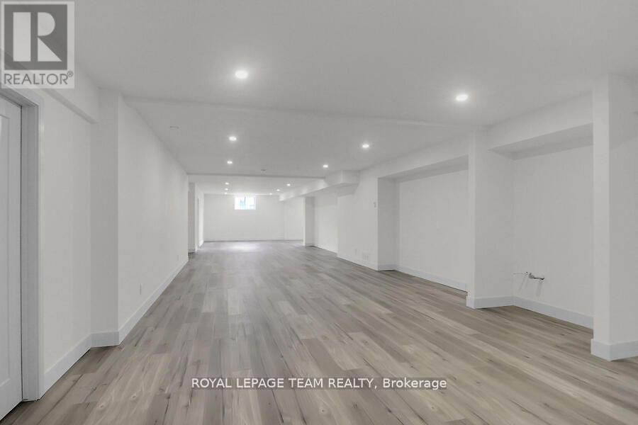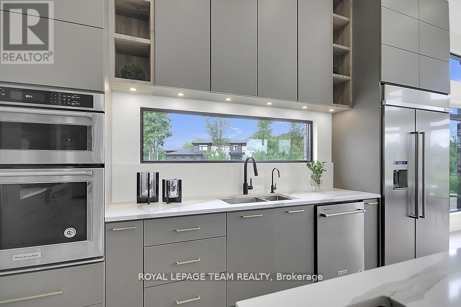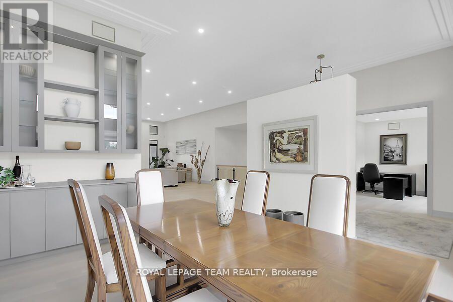 This expansive custom-built bungalow offers 6 bedrooms and 5 bathrooms, showcasing elegant wide plank oak hardwood flooring, oversized windows, and exquisite craftsmanship throughout. Designed with modern living in mind, the open-concept layout welcomes you through a stylish foyer into a grand living room that seamlessly extends to a covered veranda, complete with a cozy wood-burning fireplace. The chef-inspired kitchen is a true centrepiece, featuring a stunning waterfall quartz island with generous seating, quartz backsplash, gas cooktop, and a bright breakfast nook perfectly complemented by a separate formal dining room for more refined gatherings.The luxurious primary suite is a private retreat, boasting a spacious walk-in closet with custom vanity, a 5-piece ensuite with double sinks, a glass-enclosed shower, freestanding soaker tub, and a gas fireplace for added comfort. Three additional bedrooms are located on the main floor, two of which offer private en-suites. The fully finished lower level features heated floors throughout, three large bedrooms, a full bathroom, and a vast recreational space with endless potential for entertainment or relaxation. Additional highlights include a heated 3-car attached garage with soaring 20-ft ceilings and a fully integrated smart home system with wireless control and state-of-the-art 5-zone wireless speakers. Please note that lower level rooms have been virtually staged. (id:49712)