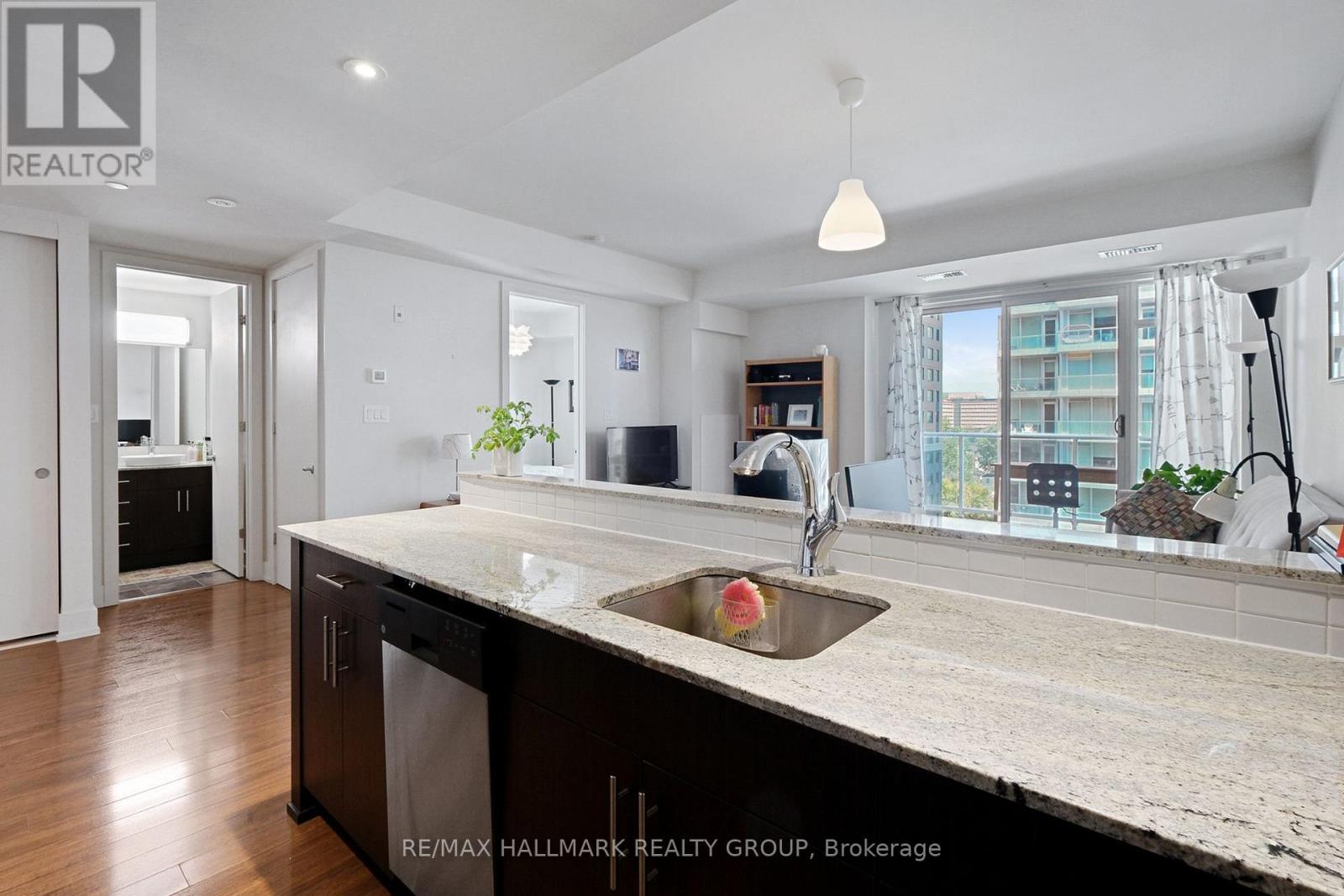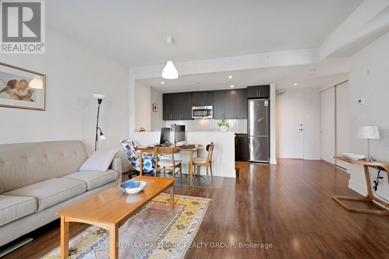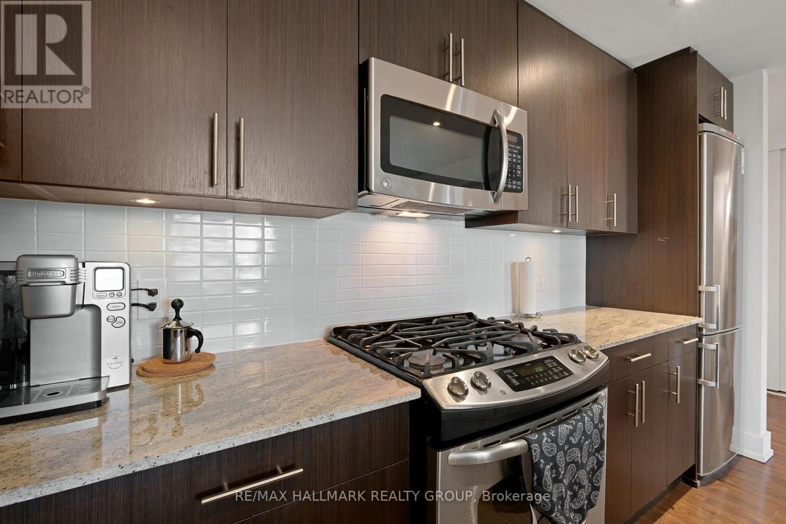 $483.02 MonthlyBright, comfortable, and perfectly placed in Little Italy. Suite 706 at HOM by Domicile is a one-bedroom with real living space and an easy, city-ready routine. This unit comes with one parking spot and one storage locker. Morning light pours across the open living and dining area through large windows, while hardwood floors keep the space warm and cohesive. The kitchen is larger than most condos in this price range, with full-height cabinetry, a gas range, stone counters, tile backsplash, and an island that works for prep, coffee, and casual meals. The bedroom is quietly tucked away for restful nights, and the full bath and in-suite laundry keep day-to-day life simple. Step outside to a private balcony with open urban views that stretch across the neighbourhood.Life at HOM adds practical amenities you will actually use. Work out in the fitness room, meet friends on the outdoor terrace with barbecue stations, and book the lounge with a kitchen when you want to host. There is also secure bike storage for weekend rides.The location is the point. You are a short walk to Preston Street with cafes, bakeries, and restaurants for every mood. Dows Lake and the Rideau Canal are close for runs, paddles, skating, and festivals that mark every season. Commuting is simple without relying on a car. The Hickory Street footbridge connects you to the O-Train, with paths and bike routes all around.If your version of Ottawa living is an espresso on Preston, a loop around the lake, and an easy ride to the office, this home fits the rhythm. A bright one-bedroom with a big kitchen, natural light, large windows, hardwood floors, a balcony, and views, set in a quiet concrete building in one of the city's most loved neighbourhoods. (id:49712)