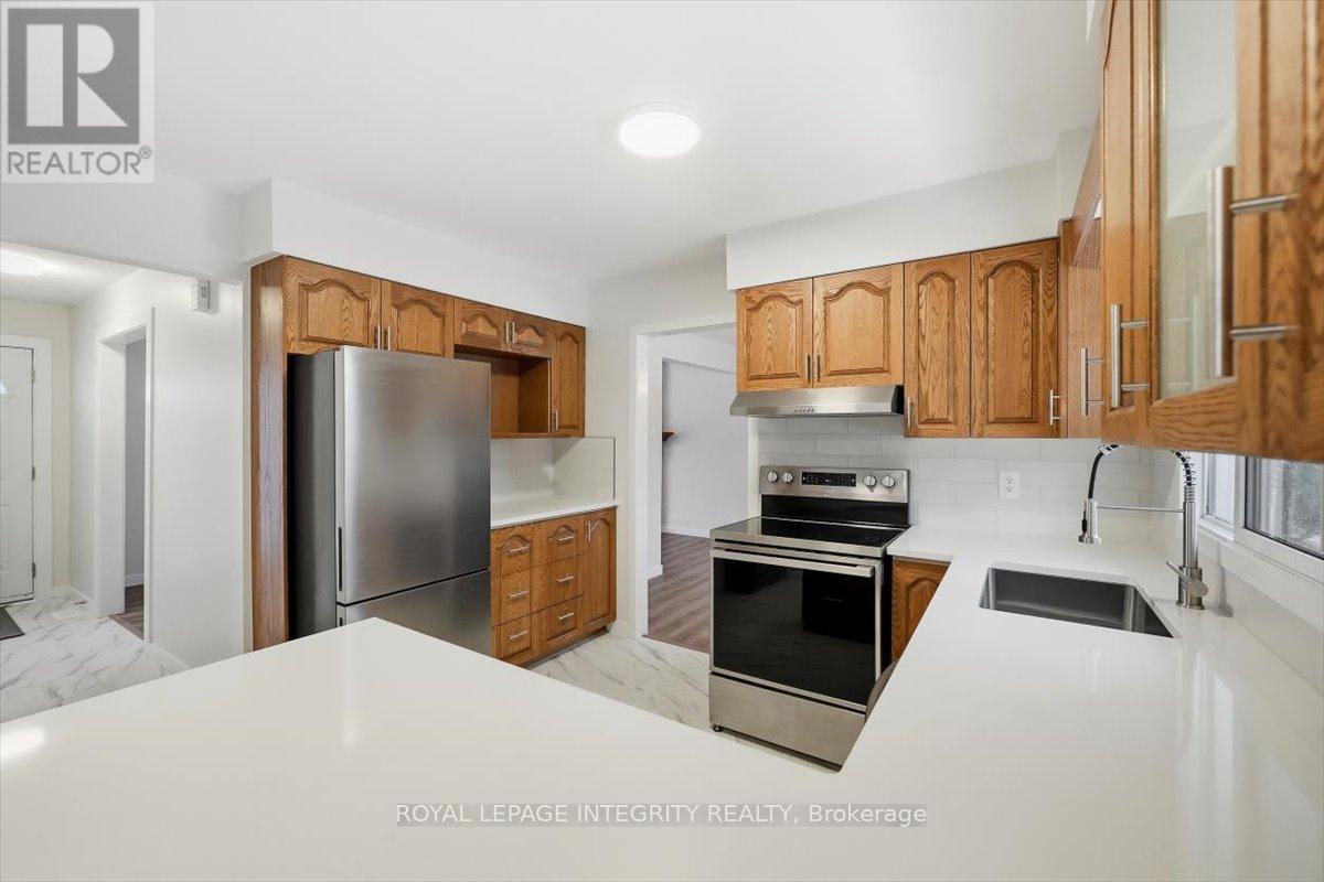 Beautifully updated 3 bedroom, 2 bathroom home located on a quiet crescent in a mature neighbourhood! This inviting home features new luxury vinyl flooring throughout, leading you to the bright and spacious living room with a cozy wood fireplace, flowing seamlessly into the dedicated dining room. The updated kitchen offers warm wood cabinetry, new backsplash and quartz countertops, stainless steel appliances, as well as an eating nook with patio doors leading to the the large yard with patio area and storage shed - a great layout for families and entertaining! Upstairs you'll find a generous primary bedroom with cheater access to the beautifully updated full bathroom, along with two additional well-sized bedrooms. The finished basement provides valuable extra living space, perfect for a family room, home office, or gym. Fantastic location, just steps from parks, bike trails, schools, the Ottawa River and everyday amenities, with easy highway access and proximity to the LRT for quick and convenient commuting. This one is a must see - book a showing today! (id:49712)