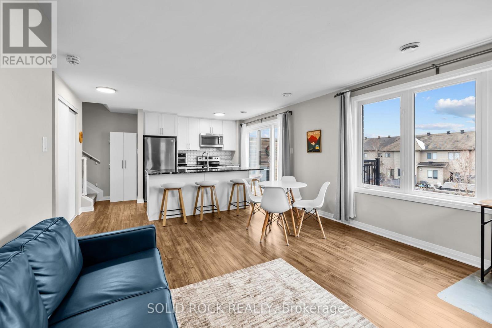 Discover a bright and private upper-unit stacked condo in the heart of Barrhaven, offering modern finishes, generous living spaces, and exceptional convenience. This two-level home combines comfort and style, ideal for professionals, couples, or small families seeking a low-maintenance lifestyle close to everything.The main level welcomes you with an open-concept layout featuring a spacious living/dining area filled with natural light. The contemporary kitchen stands out with stone countertops, stainless-steel appliances, a large island with seating, and direct access to a large southwest-facing terrace-perfect for relaxing, entertaining, or enjoying the afternoon sun. Upstairs, you'll find two well-sized bedrooms, including a serene primary suite and a bright secondary bedroom with multiple windows. Two bathrooms and convenient in-unit laundry complete the upper level. Additional benefits include your assigned parking spot located directly outside the unit's entrance, maximizing daily comfort and accessibility. Located steps from parks, top-rated schools, public transit, and a variety of shopping options such as Walmart, Farm Boy, Canadian Tire, cafés, and restaurants. This quiet and private unit offers the best of modern living in a thriving community. (id:49712)